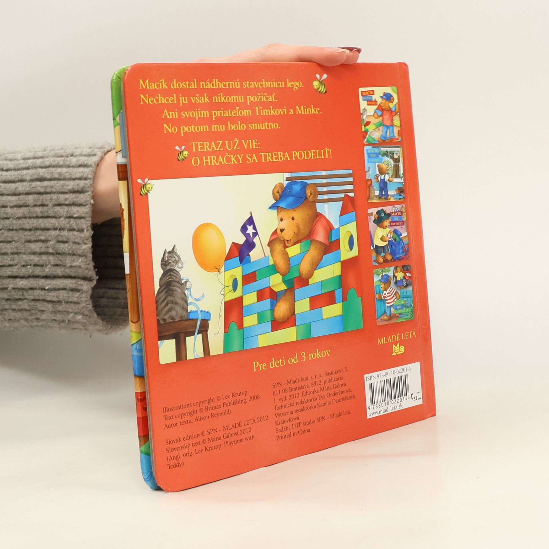 Jeden zo štyroch príbehov o Macíkovi, určený pre deti od 3 rokov. Macík nechcel nikomu požičať svoje nové lego. Dlho však nevydržal hrať sa sám. O hračky sa treba podeliť. Ilustrácie: Lee Krutop Slovenský text: Mária Gálová