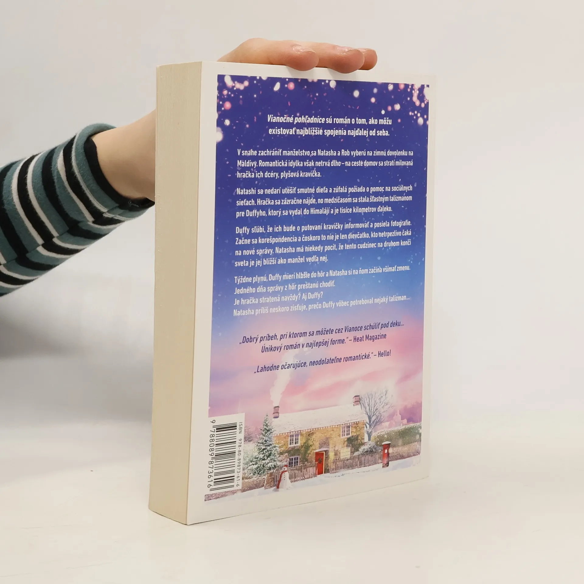 Vianočné pohľadnice sú román o tom, ako môžu existovať najbližšie spojenia najďalej od seba. V snahe zachrániť manželstvo sa Natasha a Rob vyberú na zimnú dovolenku na Maldivy. Romantická idylka však netrvá dlho – na ceste domov sa stratí milovaná hračka ich dcéry, plyšová kravička. Natashi sa nedarí utešiť smutné dieťa a zúfalá požiada o pomoc na sociálnych sieťach. Hračka sa zázračne nájde, no medzičasom sa stala šťastným talizmanom pre Duffyho, ktorý sa vydal do Himalájí a je tisíce kilometrov ďaleko. Duffy sľúbi, že ich bude o putovaní kravičky informovať a posiela fotografie. Začne sa korešpondencia a čoskoro to nie je len dievčatko, kto netrpezlivo čaká na nové správy. Natasha má niekedy pocit, že tento cudzinec na druhom konci sveta je jej bližší ako manžel vedľa nej. Týždne plynú, Duffy mieri hlbšie do hôr a Natasha si na ňom začína všímať zmenu. Jedného dňa správy z hôr prestanú chodiť. Je hračka stratená navždy? Aj Duffy? Natasha príliš neskoro zisťuje, prečo Duffy vôbec potreboval nejaký talizman
