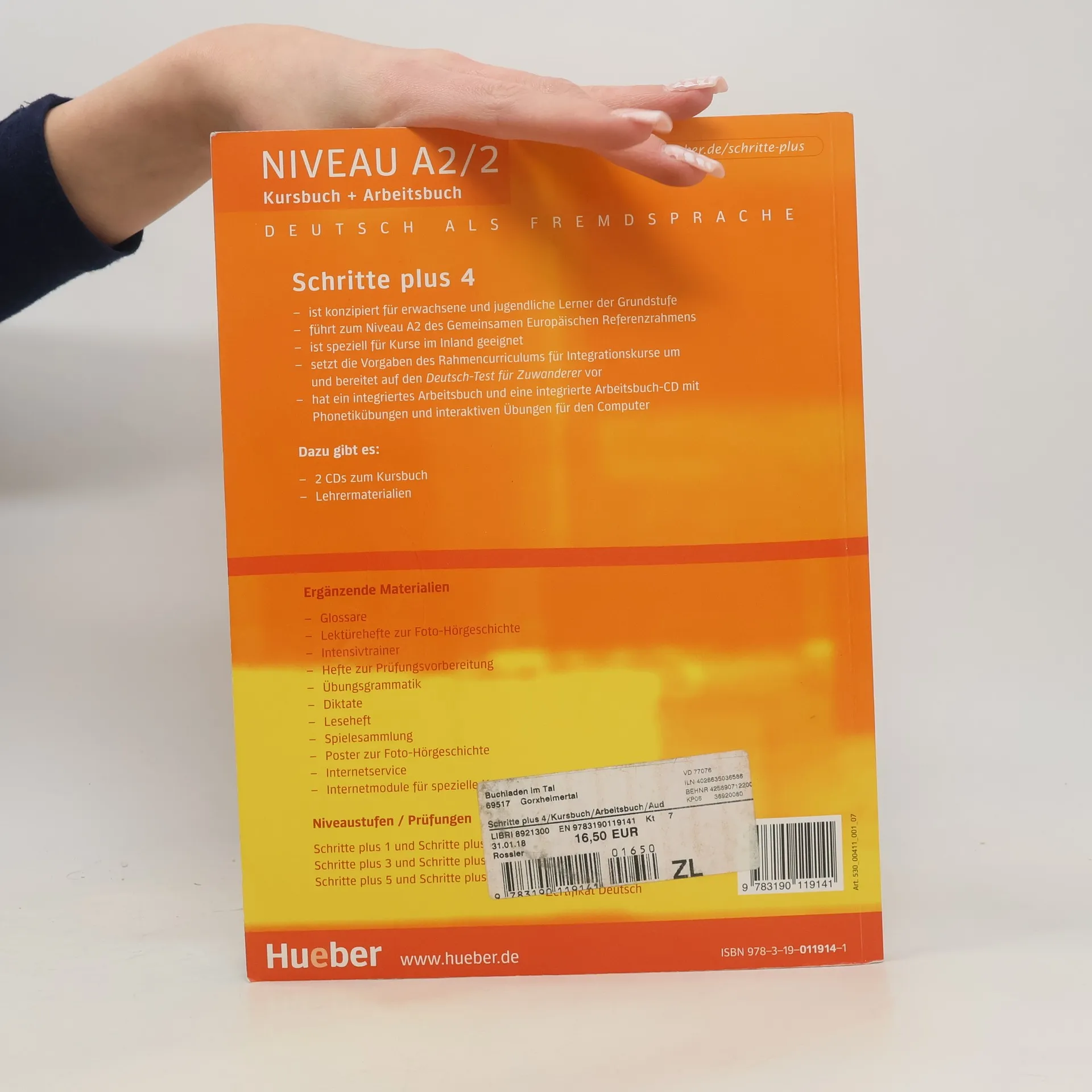 Zielniveau A2.2. Dieses Lehrwerk richtet sich an alle, die in einem deutschsprachigen Land leben oder leben möchten. Es kombiniert bewährte Elemente des Erfolgslehrwerks mit neuen, interessanten Ansätzen, um die Vorgaben des Rahmencurriculums des Bundesministeriums des Inneren umzusetzen und auf den Deutsch-Test für Zuwanderer vorzubereiten. Das Lehrwerk bietet Flexibilität durch zusätzliche „Zwischenspiele“ und „Fokusseiten“, interessante Texte sowie vielfältige Landeskunde. Es beinhaltet intensive Prüfungsvorbereitung in Prüfungsheften und neue Zusatzmaterialien wie Übungsgrammatiken und berufssprachliche Materialien. Zielgruppe sind Erwachsene und Jugendliche in deutschsprachigen Ländern sowie Lernende im Ausland, die sich auf einen Aufenthalt vorbereiten. Schritte plus orientiert sich an den Vorgaben des Gemeinsamen Europäischen Referenzrahmens und führt in sechs Bänden zu den Niveaustufen A1, A2 und B1. Die Lektionen sind klar strukturiert und thematisieren Alltags- und Berufsrelevantes, um die Integration zu erleichtern. Jede Lektion beginnt mit einer unterhaltsamen Foto-Hörgeschichte, die landeskundliches Wissen vermittelt und das Hörverstehen schult. Das integrierte Arbeitsbuch bietet Übungen in verschiedenen Schwierigkeitsstufen, ein Phonetikprogramm, Lernstrategien und Schreibtraining. Fokus-Seiten bieten zusätzliche Materialie
