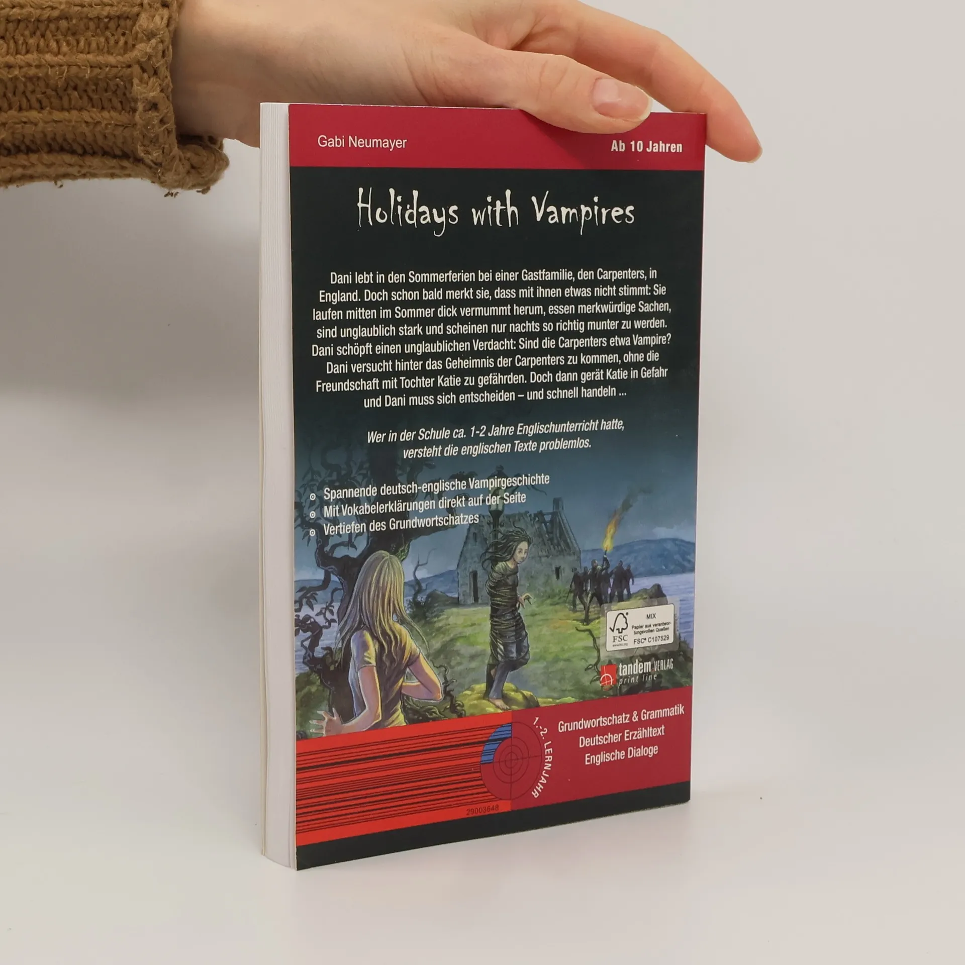 YOUNG VAMPIRES’ LANGUAGE SCHOOL: Holidays with Vampires Diese Reihe englischsprachiger Vampirgeschichten bietet spannende Storys und intensives Englisch-Training zugleich. Im Laufe der Handlung sind zahlreiche Lernübungen eingestreut, die man zwischendurch bearbeiten kann. Auf diese Weise wird das Gelesene vertieft und der Lernfortschritt überprüft. Der Band „Holidays with Vampires“ ist für Einsteiger (ab 1./2. Lernjahr) konzipiert: In einen deutschsprachigen Erzähltext sind englische Dialoge eingebettet. Inhalt: Dani lebt in den Sommerferien bei einer Gastfamilie, den Carpenters, in England. Doch schon bald merkt sie, dass mit ihnen etwas nicht stimmt: Sie laufen mitten im Sommer dick vermummt herum, essen merkwürdige Sachen, sind unglaublich stark und scheinen nur nachts so richtig munter zu werden. Dani schöpft einen unglaublichen Verdacht: Sind die Carpenters etwa Vampire? Dani versucht hinter das Geheimnis der Carpenters zu kommen, ohne die Freundschaft mit Tochter Katie zu gefährden. Doch dann gerät Katie in Gefahr und Dani muss sich entscheiden - und schnell handeln. Schwierige Vokabeln werden am Seitenende übersetzt. Ein Abschlussquiz stellt Fragen zur Handlung. Hier kann man im Selbsttest prüfen, ob man die Handlung verstanden hat. Fremdsprachenkenntnisse auf unterhaltsame Weise verbessern, nach dem Motto: Spannende Geschichten lesen – entspannt Englisch lernen.