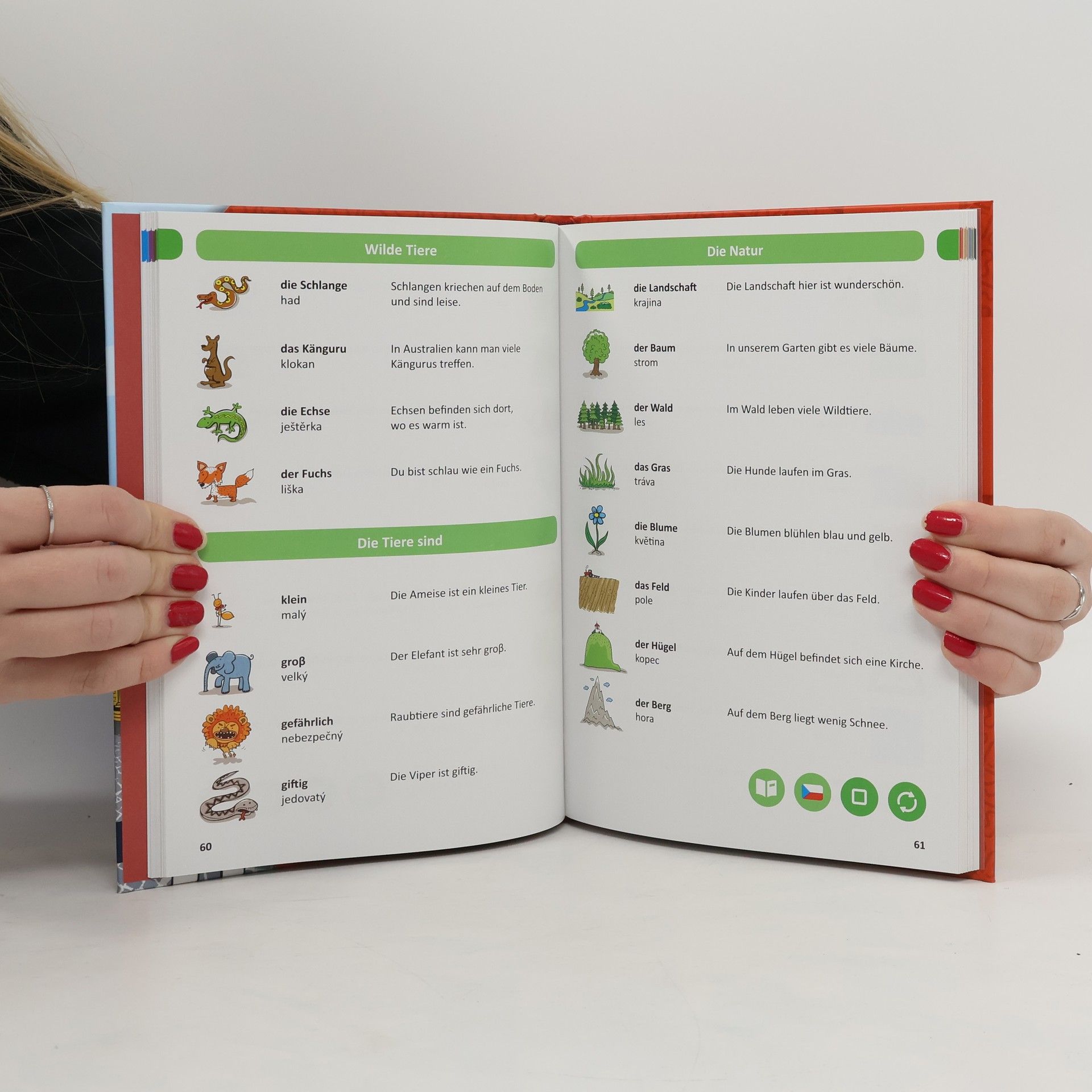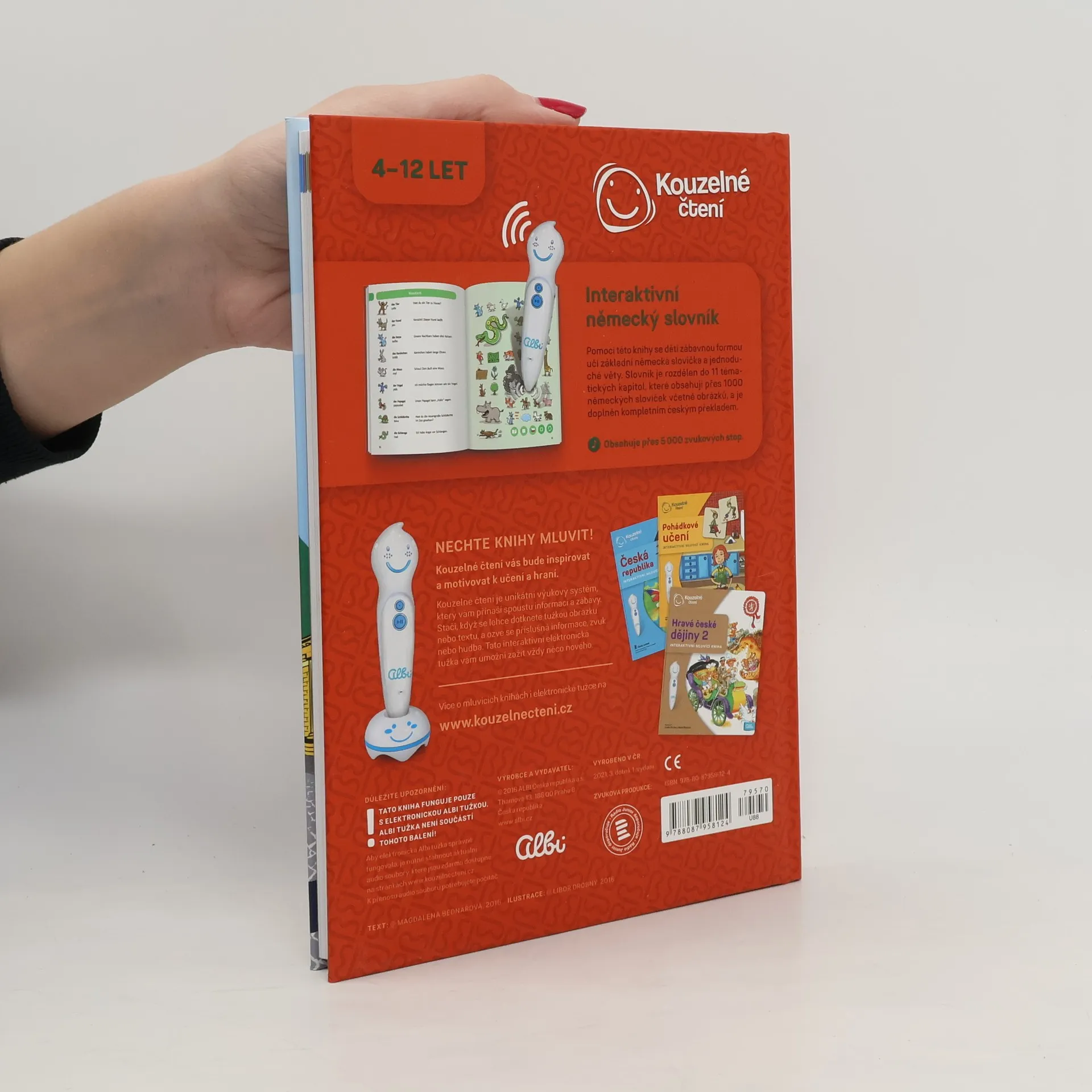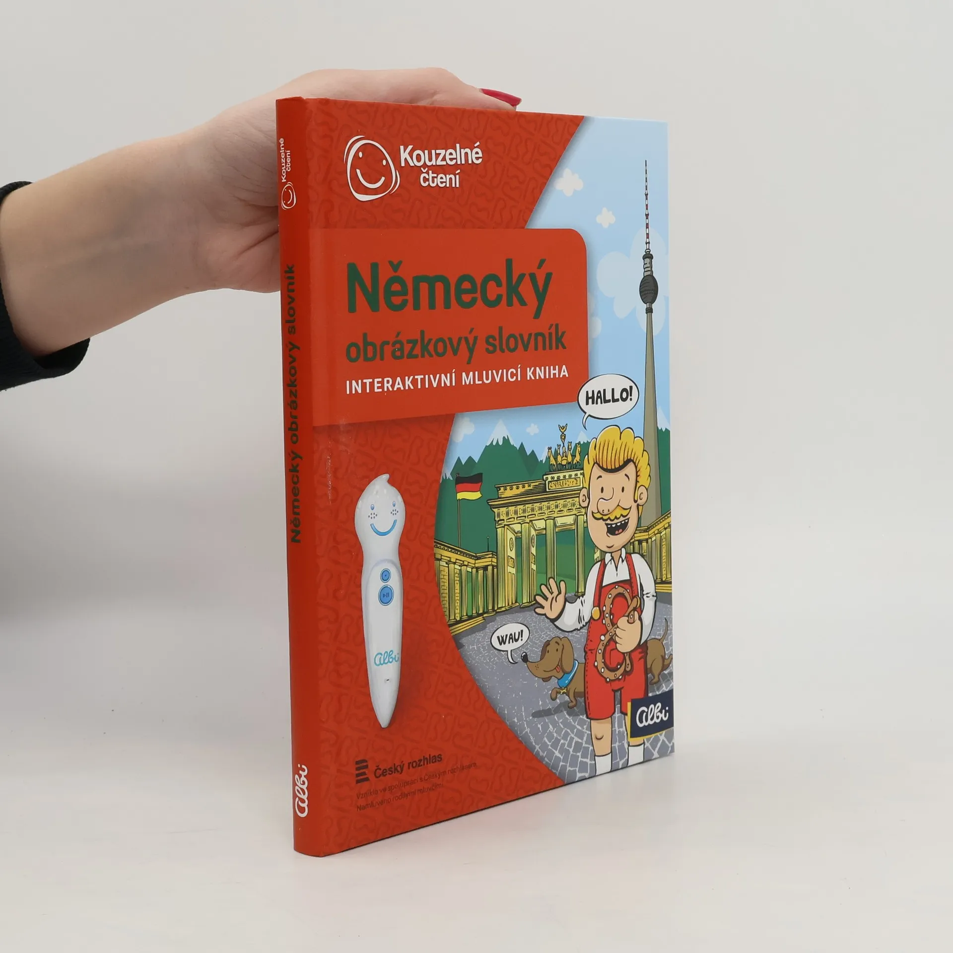 Kniha Německý obrázkový slovník z edice Kouzelné čtení je vhodná pro začátečníky i mírně pokročilé. Interaktivní mluvící kniha obsahuje základní slovíčka s obrázky a jednoduché věty. Německý obrázkový slovník je rozdělen do 11 tématických kapitol, které obsahují přes 1000německých slovíček včetně obrázků a příkladů použití. Ve slovníku nechybí samozřejmě kompletní český překlad. Kniha se skvěle hodí jako pomůcka při výuce němčiny a to pro děti již od 4 let. Dohromady kniha obsahuje přes 5000 zvuků a textů a je namluvena rodilými mluvčími. Elektronická Albi tužka není součástí knihy. Vzniklo ve spolupráci s Českým rozhlasem.