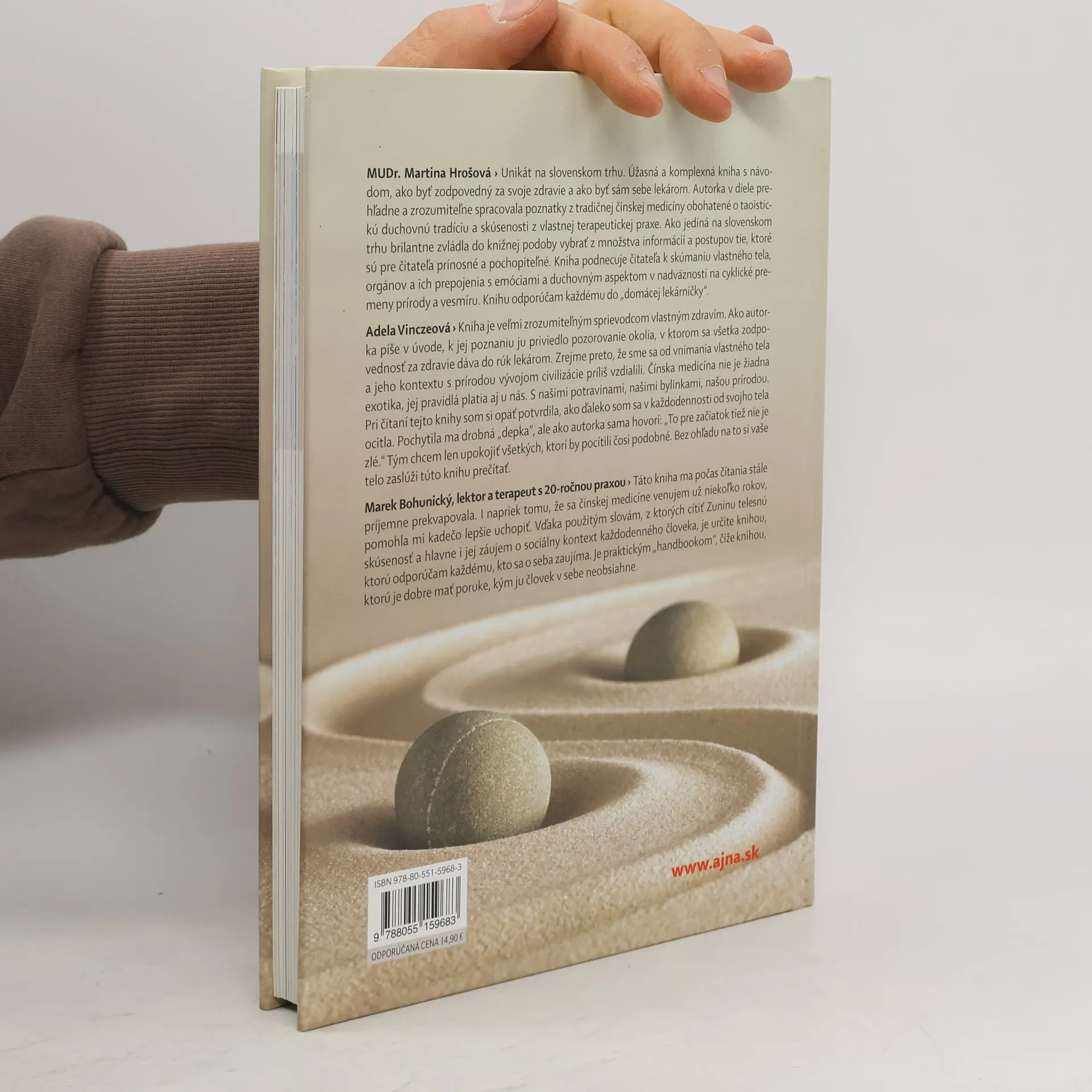 Unikát na slovenskom trhu. Úžasná a komplexná kniha s návodom, ako byť zodpovedný za svoje zdravie a ako byť sám sebe lekárom. Autorka v diele prehľadne a zrozumiteľne spracovala poznatky z tradičnej čínskej medicíny obohatené o taoistickú duchovnú tradíciu a skúsenosti z vlastnej terapeutickej praxe. Ako jediná na slovenskom trhu brilantne zvládla do knižnej podoby vybrať z kvánt informácií a postupov tie, ktoré sú pre čitateľa prínosné a pochopiteľné. Kniha podnecuje čitateľa k skúmaniu vlastného tela, orgánov a ich prepojenia s emóciami a duchovným aspektom v nadväznosti na cyklické premeny prírody a vesmíru.Knihu odporúčam každému do „domácej lekárničky“. MUDr. Martina Hrošová