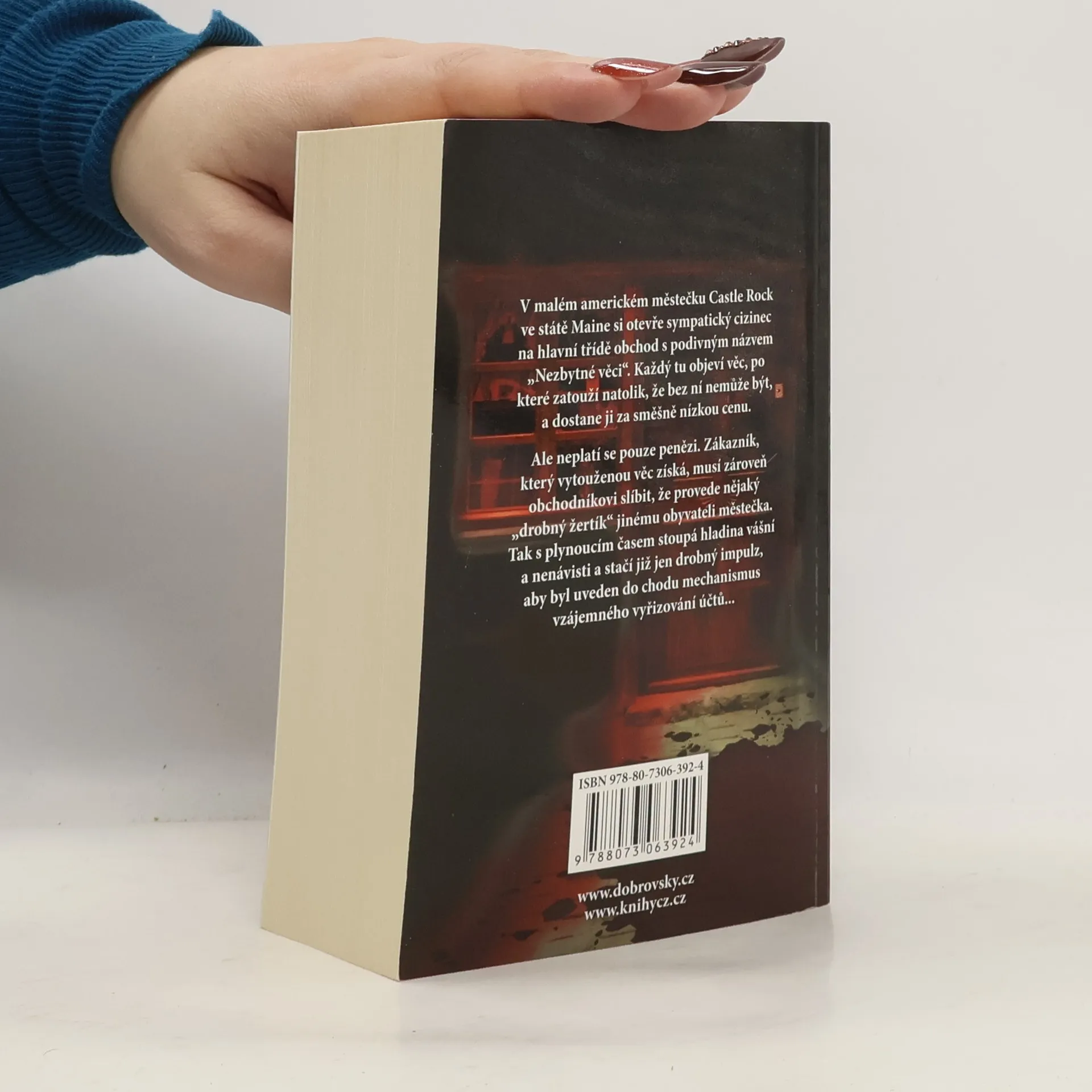 V malém americkém městečku Castle Rock ve státe Maine si otevře sympatický cizinec na hlavní třídě obchod s podivným názvem „Nezbytné věci“. Každý tu objeví věc, po které zatouží natolik, že bez ní nemůže být, a dostane ji za směšně nízkou cenu. Ale neplatí se pouze penězi. Zákazník, který vytouženou věc získá, musí zároveň obchodníkovi slíbit, že provede nějaký „drobný žertík“ jinému obyvateli městečka. Tak s plynoucím časem stoupá hladina vášní a nenávisti a stačí již jen drobný impulz, aby byl uveden do chodu mechanismus vzájemného vyřizování účtů... Dotisk roku 2014.