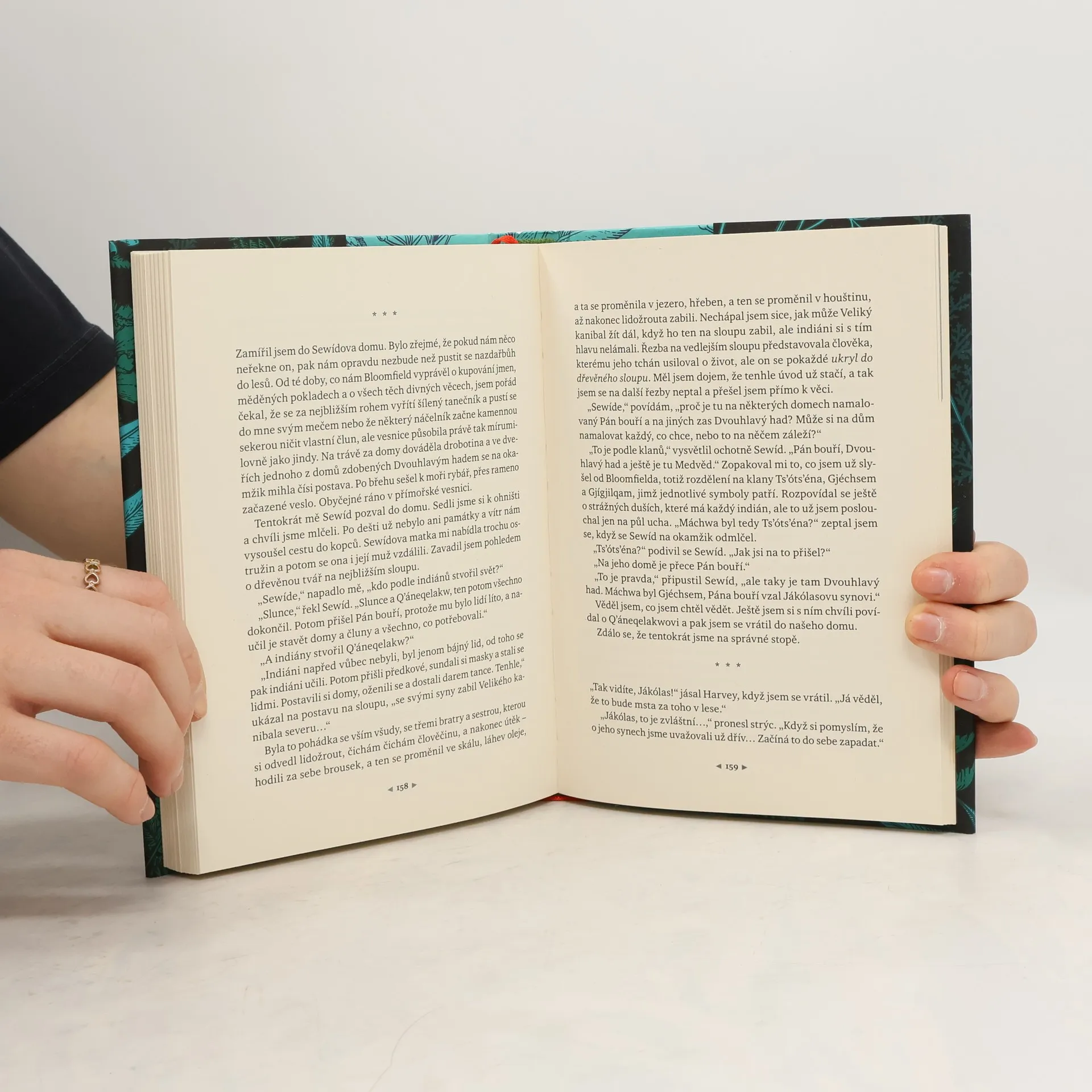 Bernard a jeho dva přátelé ve 40. letech 19. století ztroskotají na pobřeží Britské Kolumbie, najdou mrtvého indiána z kmene Kwakiutlů, jsou obviněni z vraždy, a aby se zachránili, snaží se případ vyřešit. Do sloupů domu, kde bělochy drží, jsou vytesány výjevy z mýtů, které představují klíč ke zločinu, ale oni jsou k nim slepí. Posléze zjistí, že bloudili v pomyslném labyrintu a že všechno bylo jinak. Autor projevil pozoruhodnou znalost indiánských reálií a knihu doprovodil zasvěceným doslovem, pojednávajícím mj. o příslušném období dějin Spojených států.