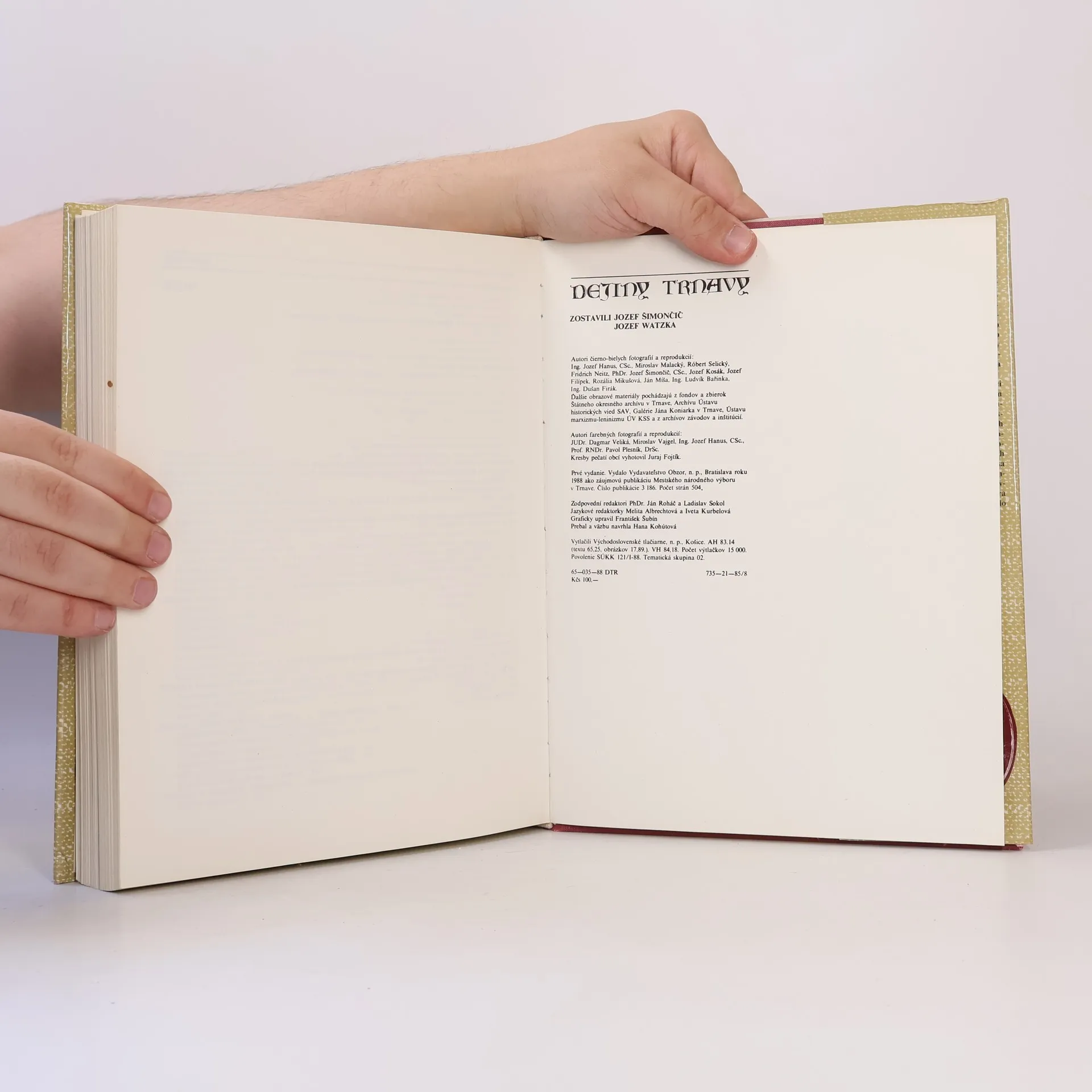 Obsah: Privilégium mesta Trnavy z roku 1238, Prírodné podmienky Trnavy a okolia, Archeológia, Stredoveká Trnava, Trnava v rokoch 1526-1849, Trnava v období kapitalizmu, Dejiny robotníckeho hnutia a komunistickej strany Československa v Trnave, Trnava v rokoch národnej a demokratickej revolúcie, Premeny mesta v období budovania socializmu, Najnovšie dejiny Trnavy, Topografia starej Trnavy-centra, Pamiatkové bohatstvo mesta, Účasť Trnavy na rozvoji národnej literatúry, Výtvarné umenie 20. storočia v Trnave, Hudobný život v Trnave, Telovýchova a šport, Obce pripojené k Trnave, Život ľudu na okolí Trnavy, Nárečie Trnavy a jej najbližšieho okolia, Trnavský okres, Výberová bibliografia k dejinám Trnavy. Cena knihy v čase vydania: 100 Kčs.