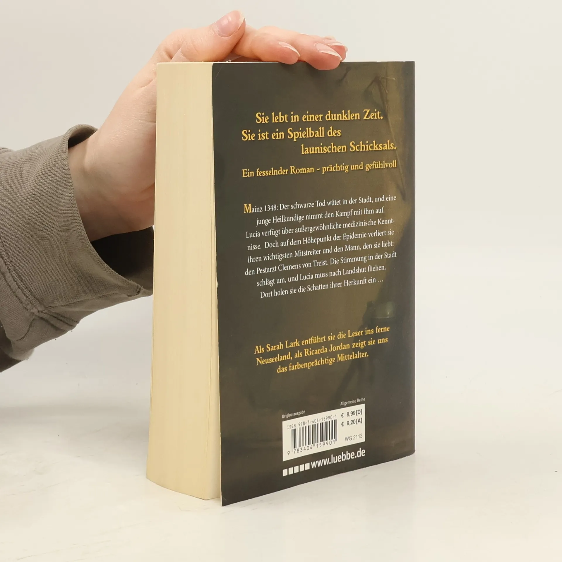 Mainz, 1348: Der schwarze Tod wütet in der Stadt, und eine junge Heilkundige nimmt den Kampf mit ihm auf: Lucia verfügt über außergewöhnliche medizinische Kenntnisse. Doch auf dem Höhepunkt der Epidemie verliert sie ihren wichtigsten Mitstreiter und den Mann, den sie liebt: den Pestarzt Clemens von Treist. Die Stimmung in der Stadt schlägt um, und Lucia muss nach Landshut fliehen. Dort holen sie die Schatten ihrer Herkunft ein ... Bestsellerautorin Sarah Lark schreibt als Ricarda Jordan.