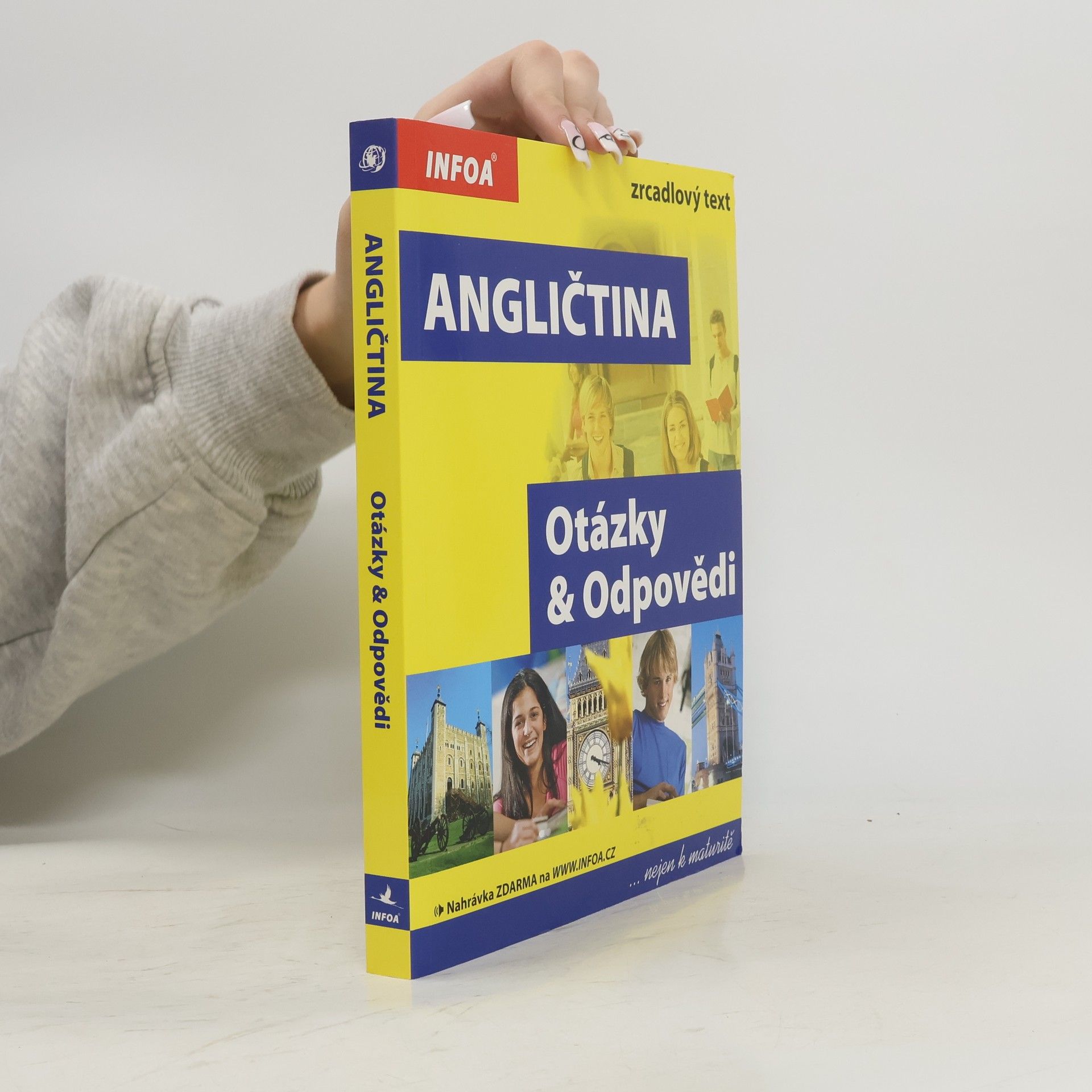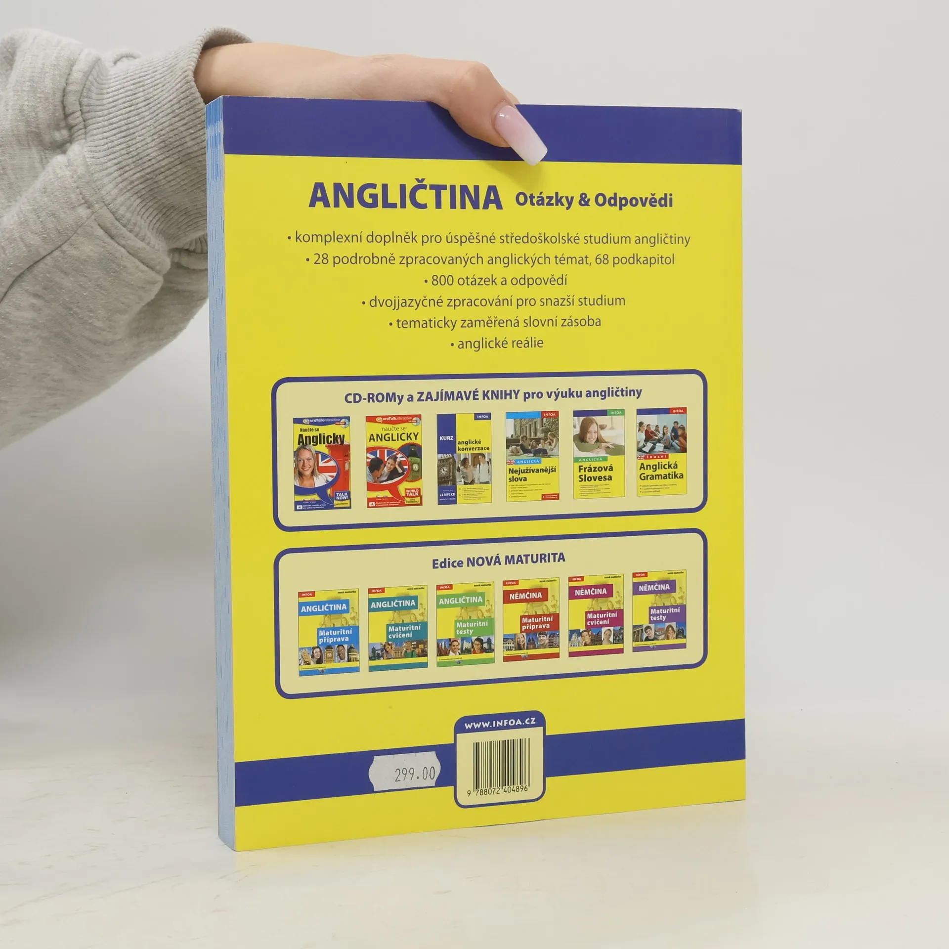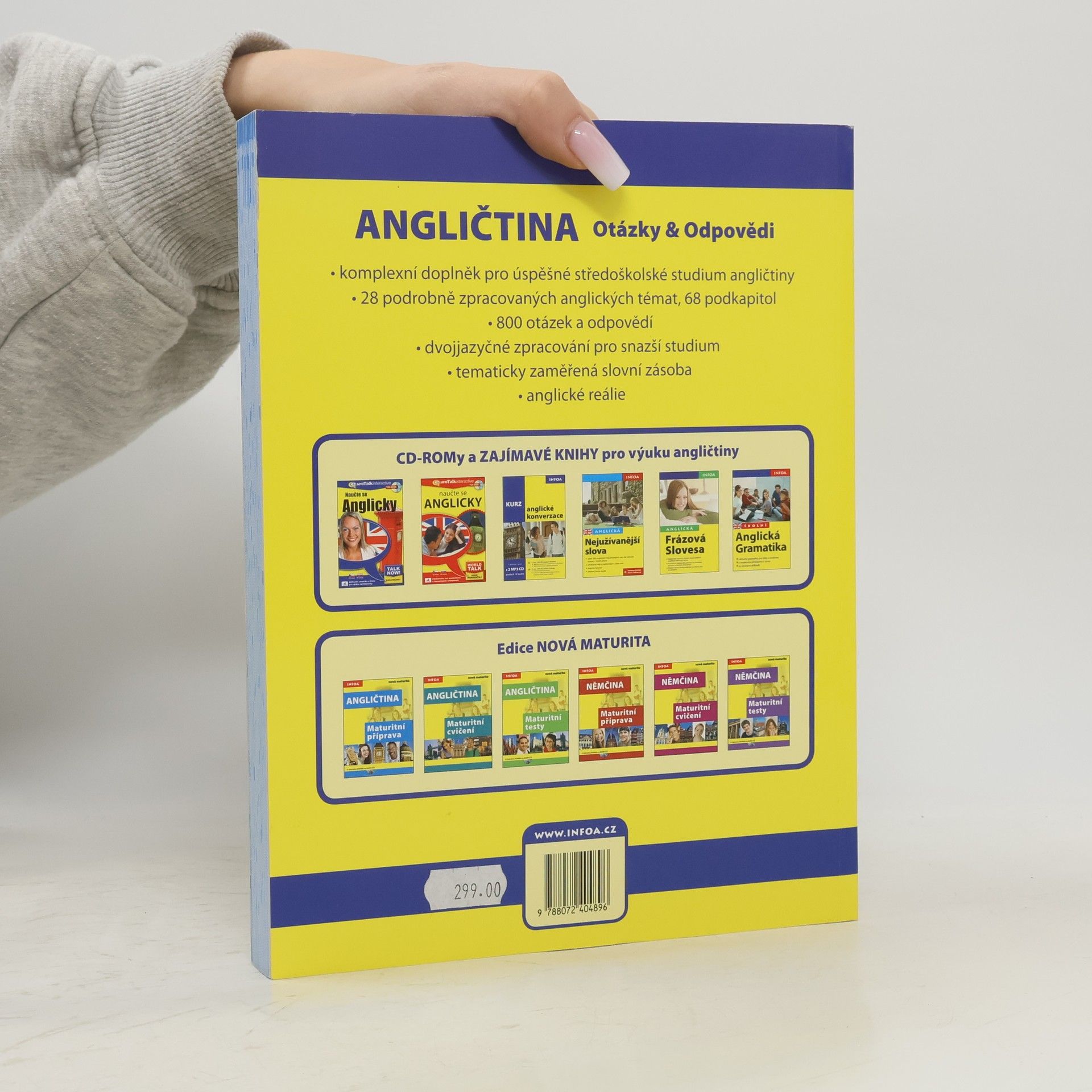 Komplexní doplněk pro úspěšné stredoškolské studium angličtiny, 28 podrobně zpracovaných témat, 68 podkapitol, 800 otázek a odpovědí, dvojjazyčné zpracování pro snazší studium, tematicky zaměřená slovní zásoba, reálie anglicky mluvících zemí, nahrávka anglických textů namluvená rodilými mluvčími V knize najdete podrobně zpracovaná témata: Rodinný život, Bydlení, Denní režim, Volný čas a zábava, Dnešní mládež, Škola a vzdělání, Volba povolání, Životopis, Pokrmy, Nakupování, Služby, Sport, Cestování, Zdraví a nemoci, Svátky, Móda a oblečení, Počasí a příroda, Umění a kultura, Média, Věda a technika, Evropská unie, Česká republika, Praha atd. Z anglických reálií témata: Spojené království Velké Británie a Severního Irska, Londýn, Spojené státy americké, Washington D. C. a jiná města v USA, Britské společenství, Anglická a americká literatura, Anglický jazyk