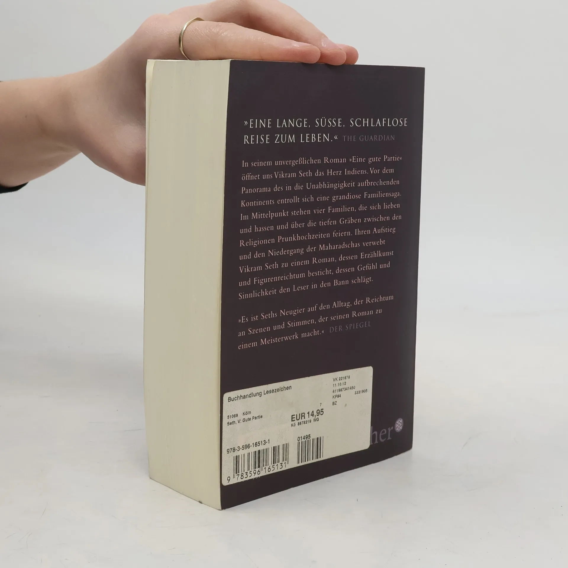 Savita heiratet Pran, einen jungen Mann, den sie kaum kennt. Die prunkvolle Zeremonie ist noch nicht beendet, da widmet die Mutter der Braut sich schon ihrer nächsten Aufgabe: eine gute Partie für ihre jüngste Tochter zu finden. Denn die schöne Lata wird schon neunzehn, aber der passende Mann muss natürlich der richtigen Kaste entstammen, und hellhäutig soll er auch noch sein. In dieser einfachen Konstellation findet Vikram Seth alles, um uns Indien, seine Tänze und Tränen, vor Augen zu stellen, seine Farben und Stoffe, sein Glück und sein Leid. »Seth verfügt über ein erzählerisches Naturtalent, einen ordnenden Intellekt, eine überbordende Phantasie und eine virtuose Beherrschung der englischen Sprache.« Die Zeit