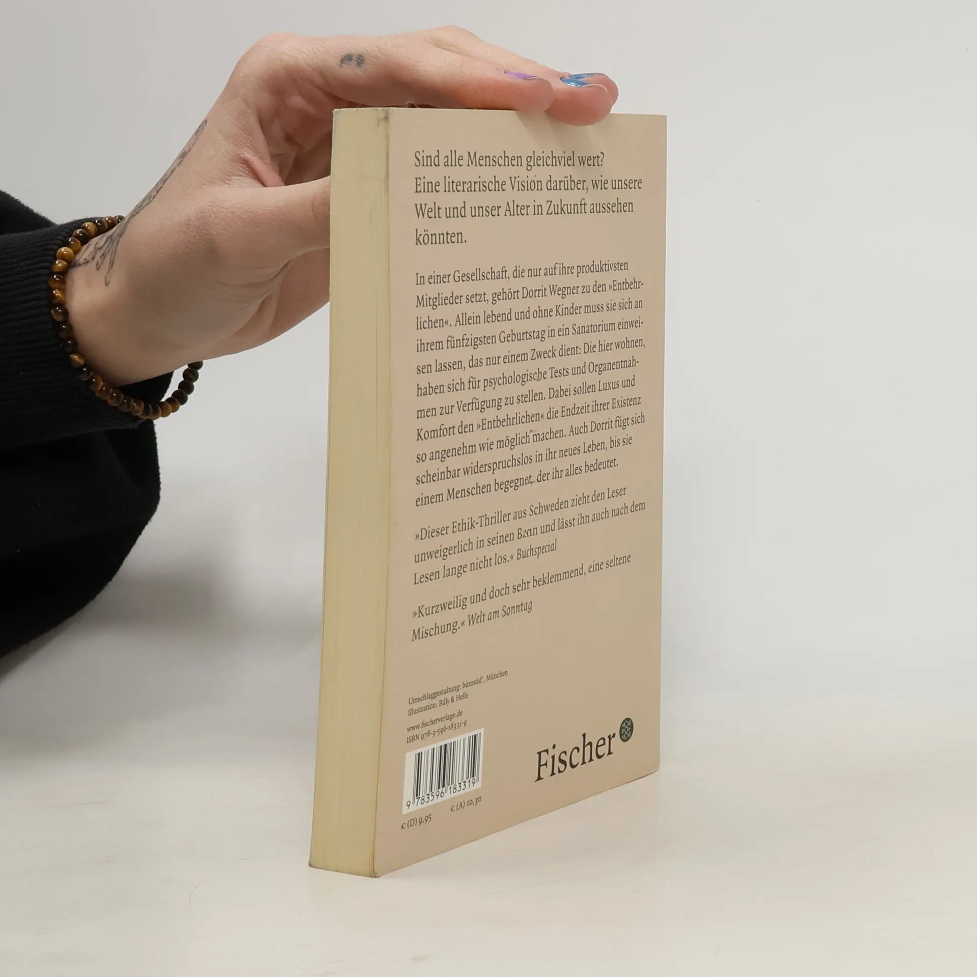 In einer Gesellschaft, die nur auf ihre produktivsten Mitglieder setzt, gehört Dorrit Wegner zu den »Entbehrlichen«. Allein lebend und ohne Kinder muss sie sich an ihrem fünfzigsten Geburtstag in ein Sanatorium einweisen lassen, das nur einem Zweck dient: die hier wohnen, haben sich für psychologische Tests und Organentnahmen zur Verfügung zu stellen. Dabei sollen Luxus und Komfort den »Entbehrlichen« die Endzeit ihrer Existenz so angenehm wie möglich machen. Auch Dorrit fügt sich scheinbar widerspruchslos in ihr neues Leben, bis sie einem Menschen begegnet, der ihr alles bedeutet.