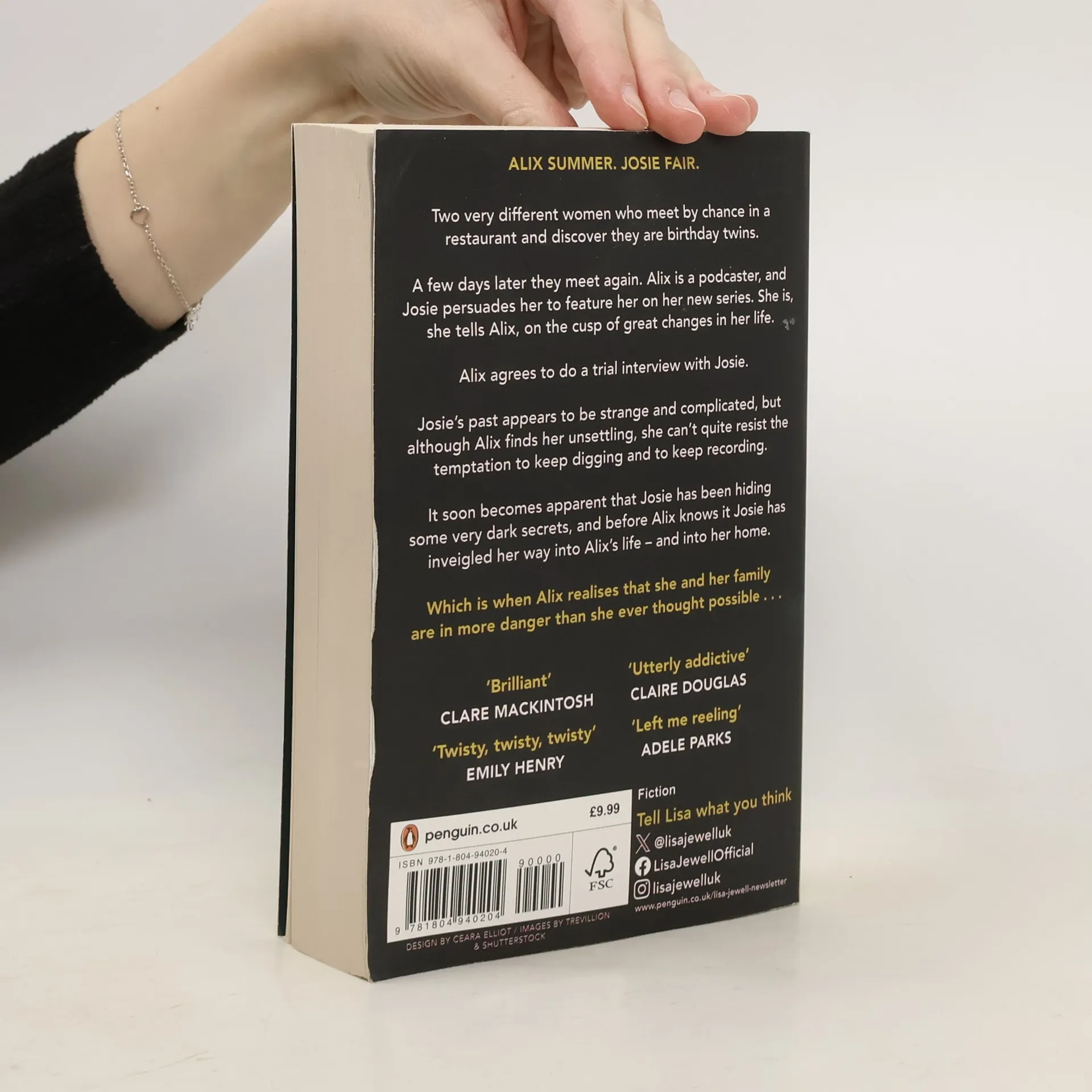 Celebrating her forty-fifth birthday at her local pub, popular podcaster Alix Summers crosses paths with an unassuming woman called Josie Fair. Josie, it turns out, is also celebrating her forty-fifth birthday. They are, in fact, birthday twins.A few days later, Alix and Josie bump into each other again, this time outside Alix’s children’s school. Josie has been listening to Alix’s podcasts and thinks she might be an interesting subject for her series. She is, she tells Alix, on the cusp of great changes in her life.Josie’s life appears to be strange and complicated, and although Alix finds her unsettling, she can’t quite resist the temptation to keep making the podcast. Slowly she starts to realise that Josie has been hiding some very dark secrets, and before she knows it, Josie has inveigled her way into Alix’s life—and into her home.But, as quickly as she arrived, Josie disappears. Only then does Alix discover that Josie has left a terrible and terrifying legacy in her wake, and that Alix has become the subject of her own true crime podcast, with her life and her family’s lives under mortal threat.Who is Josie Fair? And what has she done?