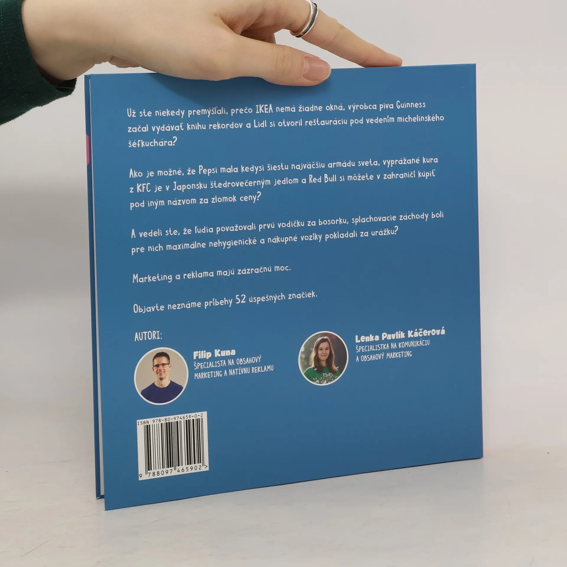 Už ste niekedy premýšľali, prečo máme denne chodiť 10 000 krokov, zásnubný prsteň býva diamantový (a nie smaragdový alebo rubínový) a Santa Claus je červený? Prečo IKEA nemá žiadne okná, výrobca piva Guinness začal vydávať knihu rekordov, Lidl si otvoril reštauráciu pod vedením michelinského šéfkuchára? Ako je možné, že Pepsi mala kedysi šiestu najväčšiu armádu sveta, vyprážané kura z KFC je v Japonsku tradičným štedrovečerným jedlom a Red Bull si v zahraničí kúpite pod iným názvom a za zlomok ceny? Objavte neznáme príbehy 52 úspešných značiek v tejto jedinečnej knihe! Dozviete sa aj, že ľudia odmietali, priam neznášali, všetky vynálezy, ktoré nám dnes prídu také normálne ako dýchanie. Prvú vodičku auta pokladali za bosorku, splachovacie záchody boli pre nich maximálne nehygienické a nákupné vozíky ich urážali. Príbehy dopĺňajú originálne ilustrácie a kniha je perfektným tipom na darček pre každého, kto má rád skryté tajomstvá obľúbených značiek či vecí, ktoré denne využíva, sleduje, navštevuje či konzumuje. Pre čitateľov, ktorí si z deja chcú vziať aj niečo viac, je na konci každej kapitoly pripravená inšpirácia aj miesto na poznámky. Takisto tam nájdete odkaz na stránku s doplňujúcimi obrázkami, videami a ďalšími informáciami, ktoré sa nezmestili do knihy.