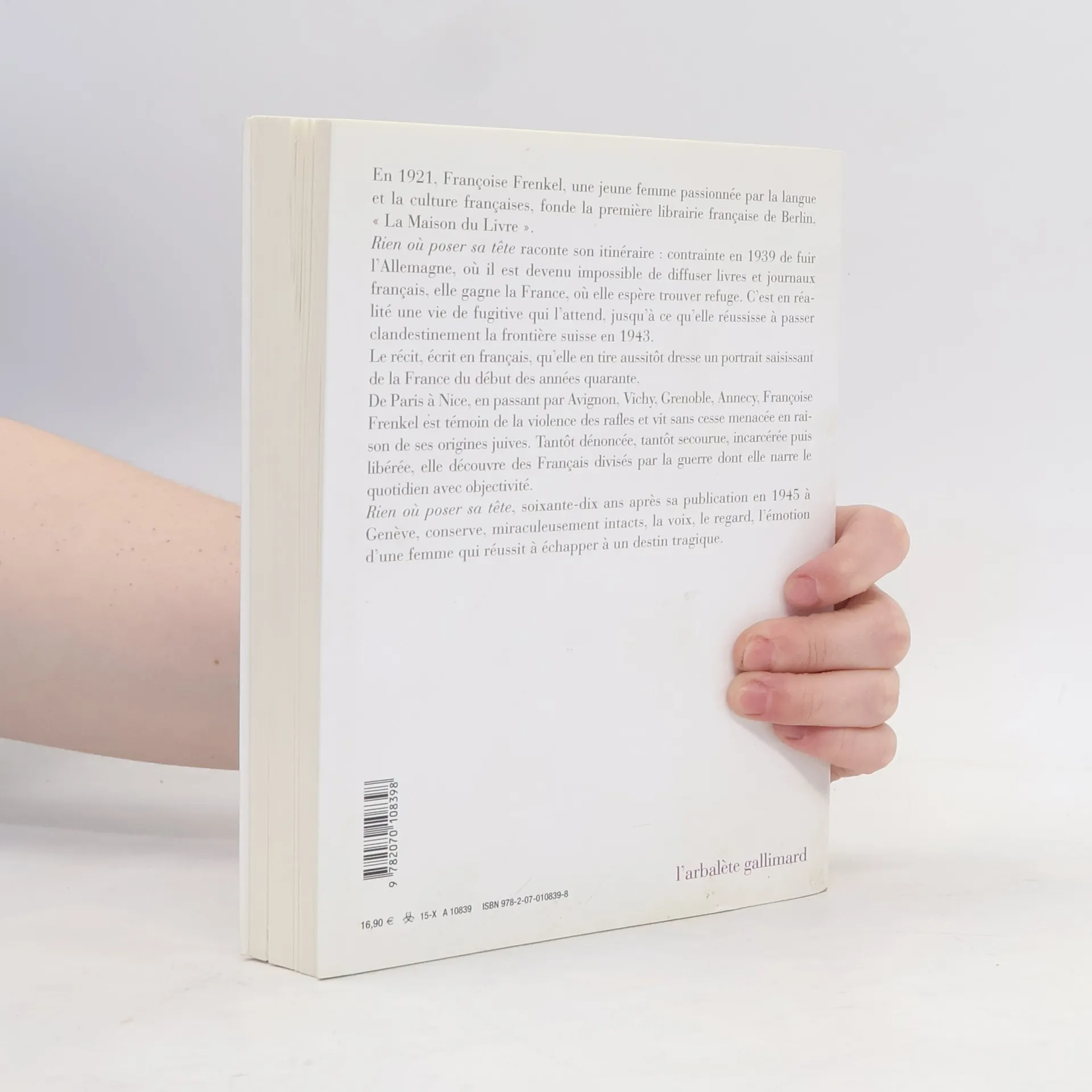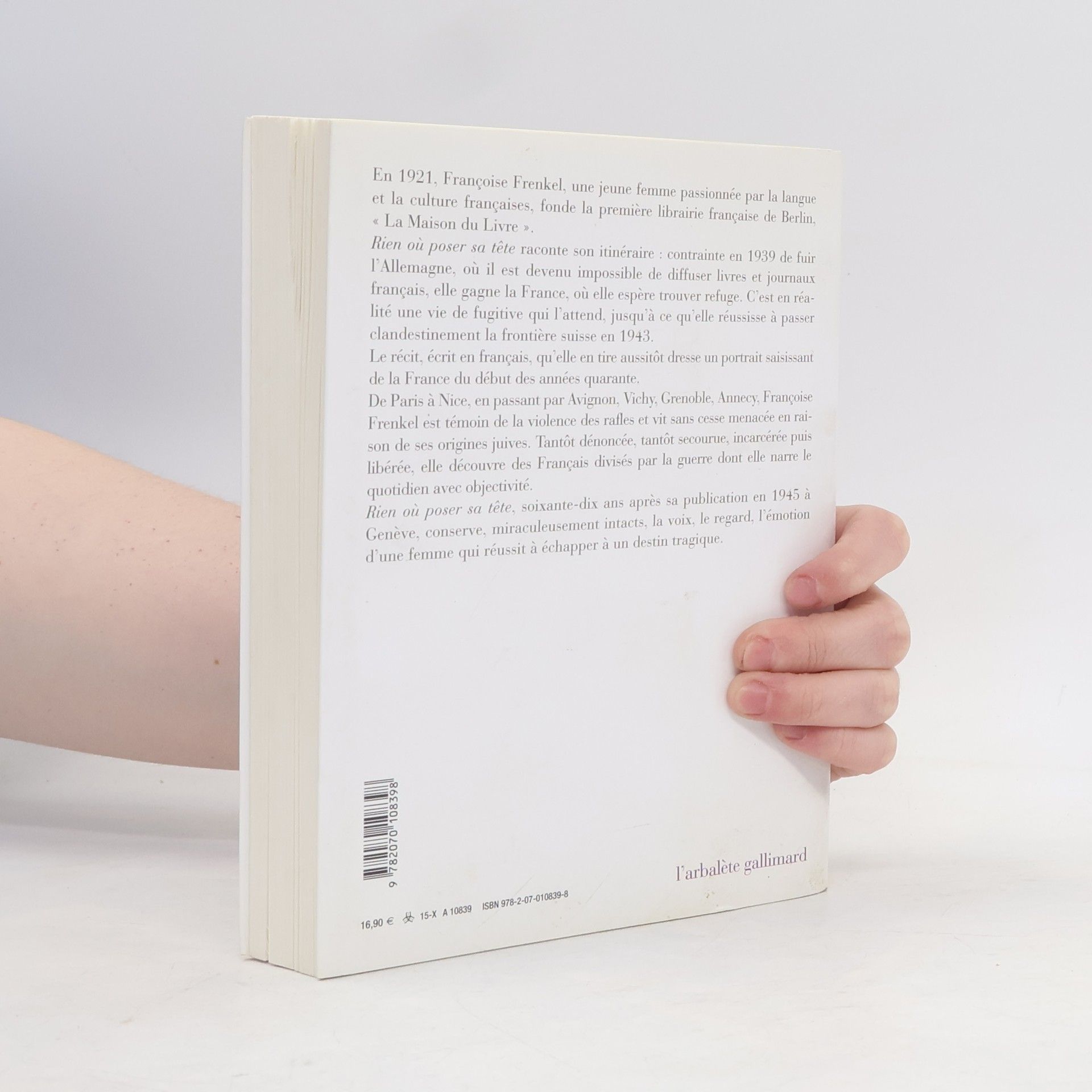 En 1921, Françoise Frenkel, une jeune femme passionnée par la langue et la culture françaises, fonde la première librairie française de Berlin, "La Maison du Livre". Rien où poser sa tête raconte son itinéraire : contrainte en 1939 de fuir l'Allemagne, où il est devenu impossible de diffuser livres et journaux français, elle gagne la France, où elle espère trouver refuge. C'est en réalité une vie de fugitive qui l'attend, jusqu'à ce qu'elle réussisse à passer clandestinement la frontière suisse en 1943. Le récit, écrit en français, qu'elle en tire aussitôt dresse un portrait saisissant de la France du début des années quarante. De Paris à Nice, en passant par Avignon, Vichy, Grenoble, Annecy, Françoise Frenkel est témoin de la violence des rafles et vit sans cesse menacée en raison de ses origines juives. Tantôt dénoncée, tantôt secourue, incarcérée puis libérée, elle découvre des Français divisés par la guerre dont elle narre le quotidien avec objectivité. Rien où poser sa tête, soixante-dix ans après sa publication en 1945 à Genève, conserve, miraculeusement intacts, la voix, le regard, l'émotion d'une femme qui réussit à échapper à un destin tragique.