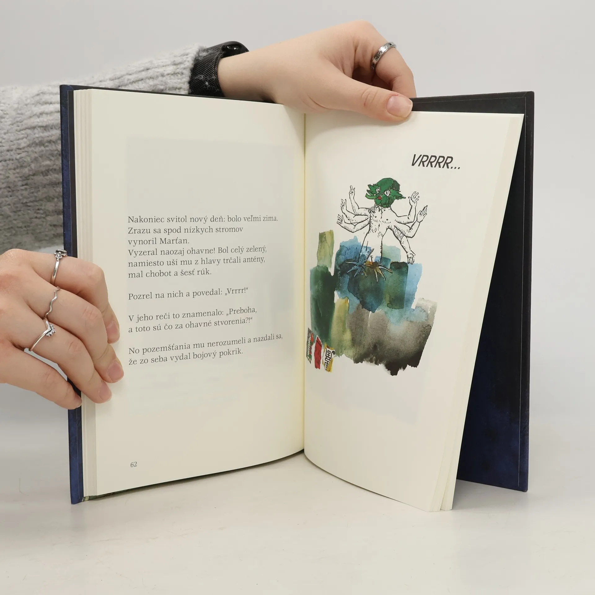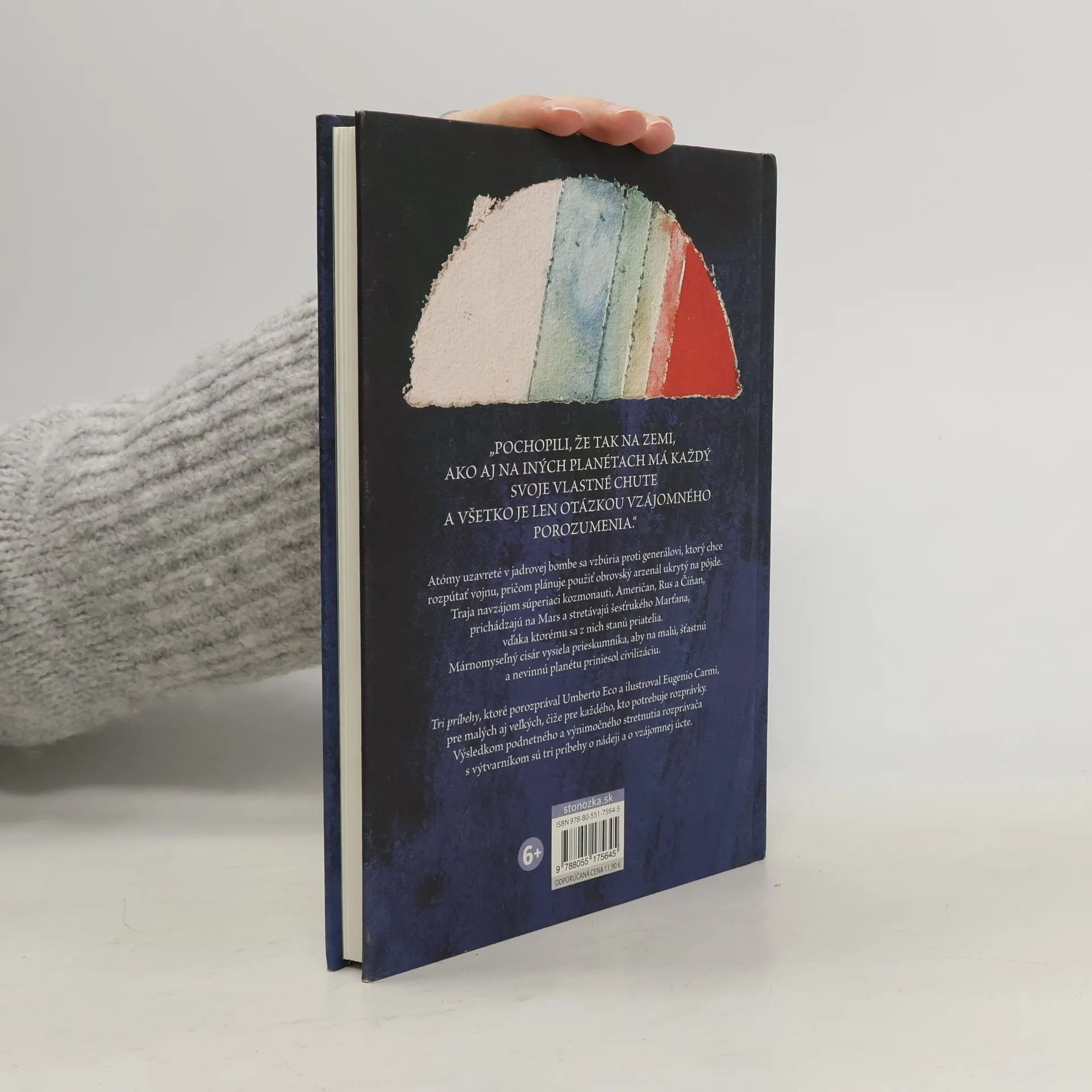 Atómy uzavreté v jadrovej bombe sa vzbúria proti generálovi, ktorý chce rozpútať vojnu, pričom plánuje použiť obrovský arzenál ukrytý na pôjde. Traja navzájom súperiaci kozmonauti, Američan, Rus a Číňan, prichádzajú na Mars a stretávajú šesťrukého Marťana, vďaka ktorému sa z nich stanú priatelia. Márnomyseľný cisár vysiela prieskumníka, aby na malú, šťastnú a nevinnú planétu priniesol civilizáciu. Tri príbehy, ktoré porozprával Umberto Eco a ilustroval Eugenio Carmi, pre malých aj veľkých, čiže pre každého, kto potrebuje rozprávky. Maliar EUGENIO CARMI sám seba označoval za výrobcu obrázkov. Pri Umbertovi Ecovi sa z neho stal ilustrátor. UMBERTO ECO bol filozof, odborník na stredovek, semiológ a spisovateľ. Sám seba označoval za výrobcu slov. Pri Eugeniovi Carmim sa z neho stal rozprávkar.