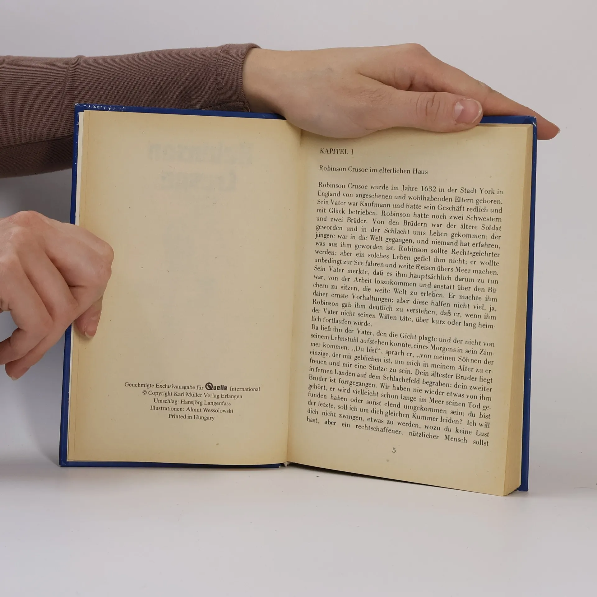 »Das Leben und die seltsamen Abenteuer des Robinson Crusoe, eines Seemanns aus York. Welcher achtundzwanzig Jahre ganz allein auf einer unbewohnten Insel vor der amerikanischen Küste, nahe der Mündung des großen Orinoco lebte, wohin er nach einem Schiffbruch, bei dem die ganze Besatzung außer ihm selbst ums Leben kam, verschlagen wurde. Nebst dem Bericht wie er auf wundersame Weise durch Piraten gerettet wurde. Geschrieben von ihm selbst.« So lautet der volle Titel des Buches, dessen wichtigste Begebenheiten hier in Auswahl dargeboten werden. Gekürzte Ausgabe