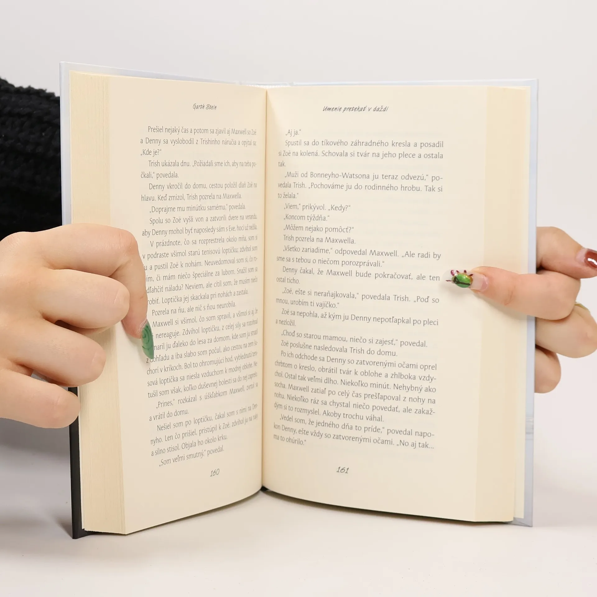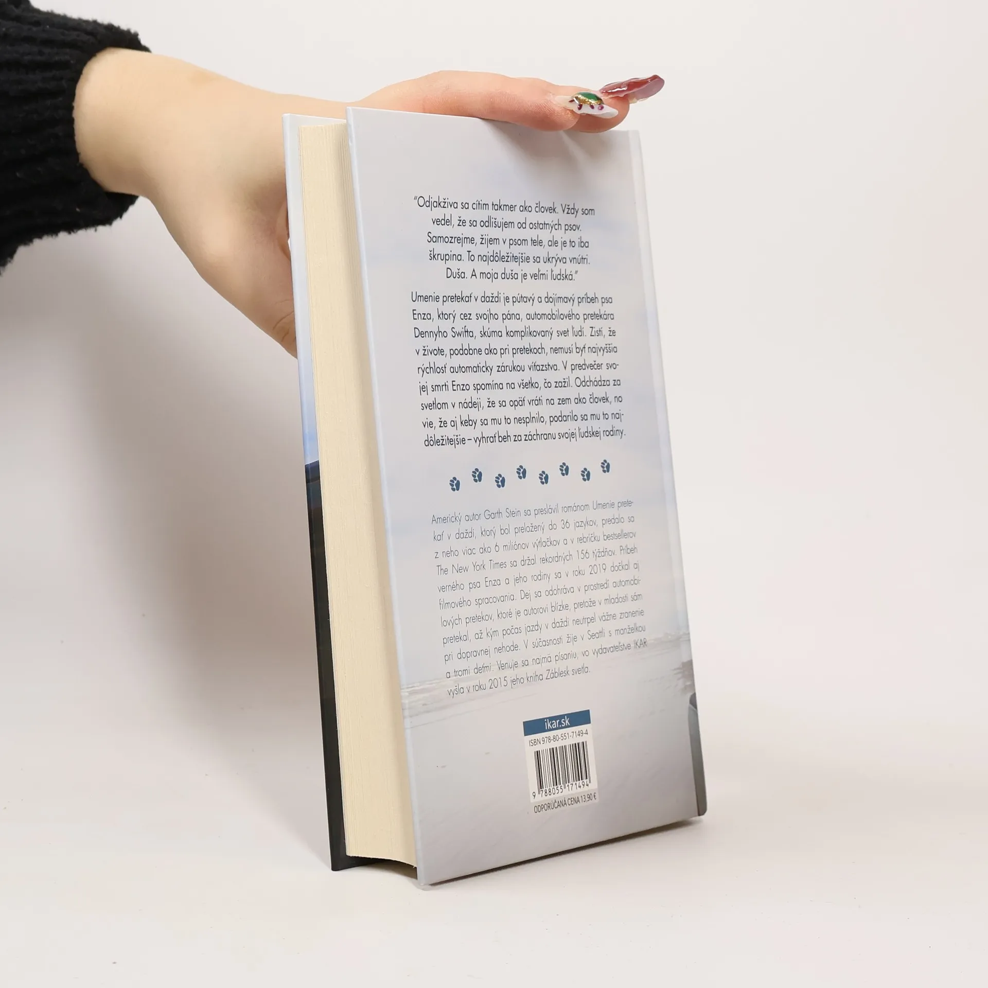 “Odjakživa sa cítim takmer ako človek. Vždy som vedel, že sa odlišujem od ostatných psov. Samozrejme, žijem v psom tele, ale je to iba škrupina. To najdôležitejšie sa ukrýva vnútri. Duša. A moja duša je veľmi ľudská.” Umenie pretekať v daždi je pútavý a dojímavý príbeh psa Enza, ktorý cez svojho pána, automobilového pretekára Dennyho Swifta, skúma komplikovaný svet ľudí. Zistí, že v živote, podobne ako pri pretekoch, nemusí byť najvyššia rýchlosť automaticky zárukou víťazstva. V predvečer svojej smrti Enzo spomína na všetko, čo zažil. Odchádza za svetlom v nádeji, že sa opäť vráti na zem ako človek, no vie, že aj keby sa mu to nesplnilo, podarilo sa mu to najdôležitejšie – vyhrať beh za záchranu svojej ľudskej rodiny.