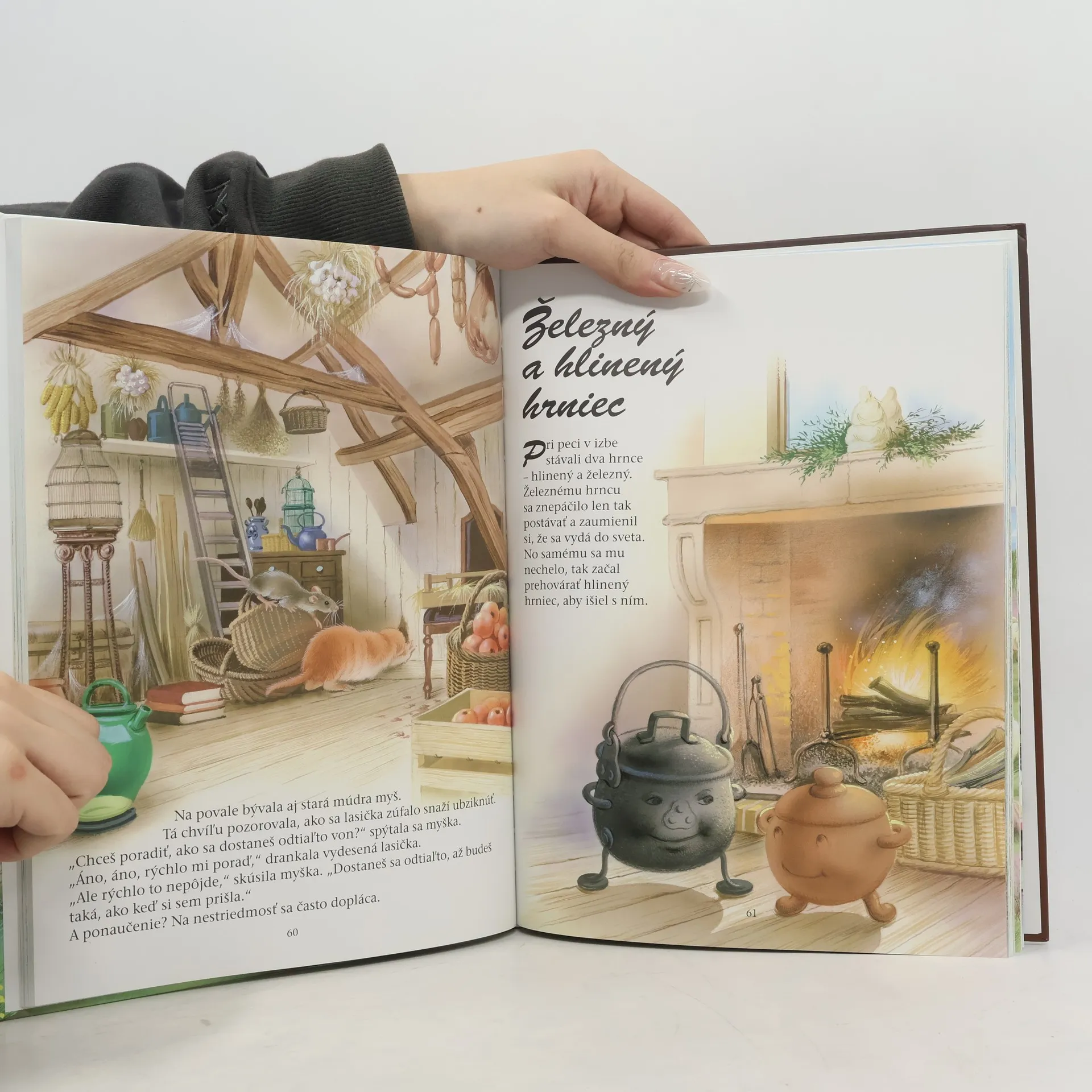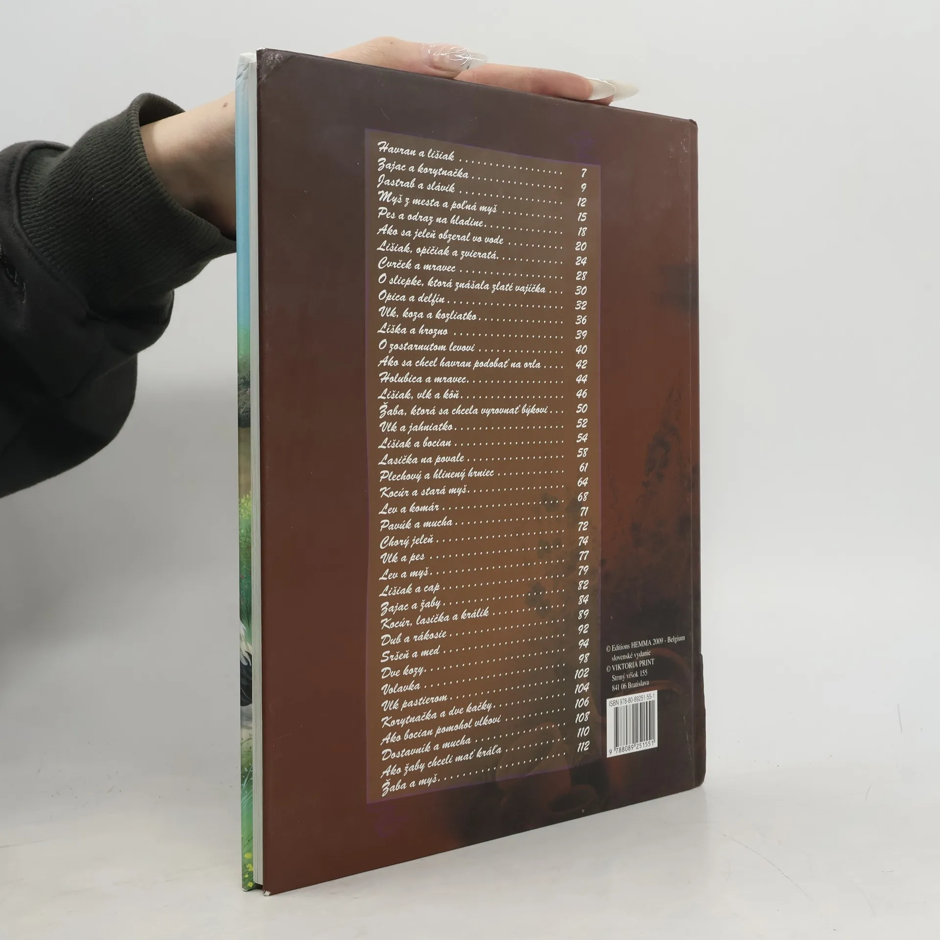Bájky: Havran a lišiak, Zajac a korytnačka, Jastrab a slávik, Myš z mesta a poľná myš, Pes a odraz na hladine, Ako sa jeleň obzeral vo vode, Lišiak, opičiak a zvieratá, Cvrček a mravec, O sliepke, ktorá znášala zlaté vajíčka, Opica a delfín, Vlk, koza a kozliatko, Lišiak a hrozno, Zostarnutý lev, Ako sa chcel havran podobať orlovi, Holubica a mravec, Lišiak, vlk a kôň, Žaba, ktorá sa chcela vyrovnať býkovi, Vlk a jahniatko, Líška a bocian, Lasička na povale, Železný a hlinený hrniec, Kocúr a stará myš, Lev a komár, Pavúk a lastovička, Chorý jeleň, Vlk a pes, Lev a myš, Lišiak a cap, Zajac a žaby, Kocúr, lasička a králik, Dub a rákosie, Sršeň a med, Dve kozy, Volavka, Vlk pastierom, Korytnačka a dve kačice, Ako bocian pomohol vlkovi, Dostavník a mucha, Ako žaby chceli mať kráľa, Žaba a myš.