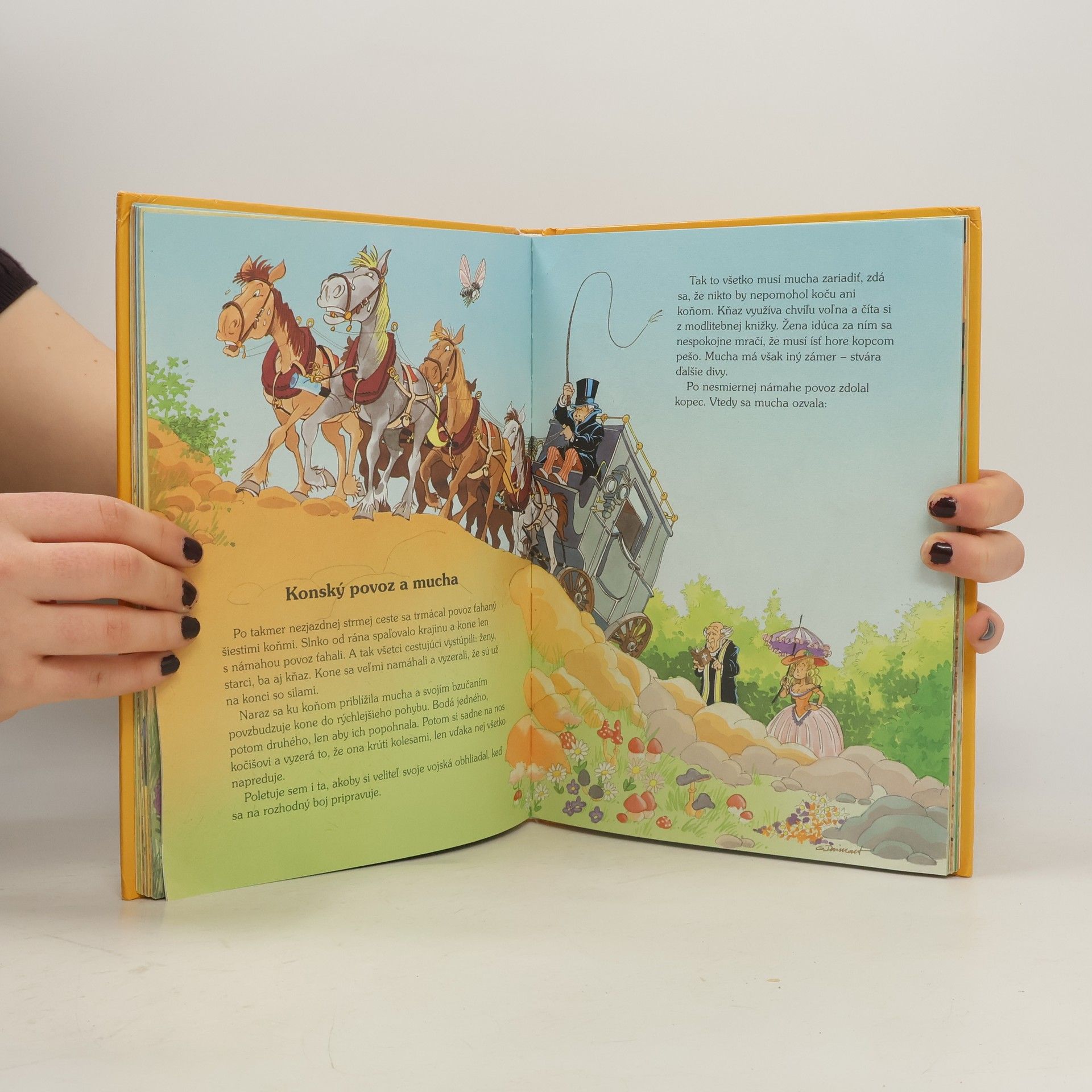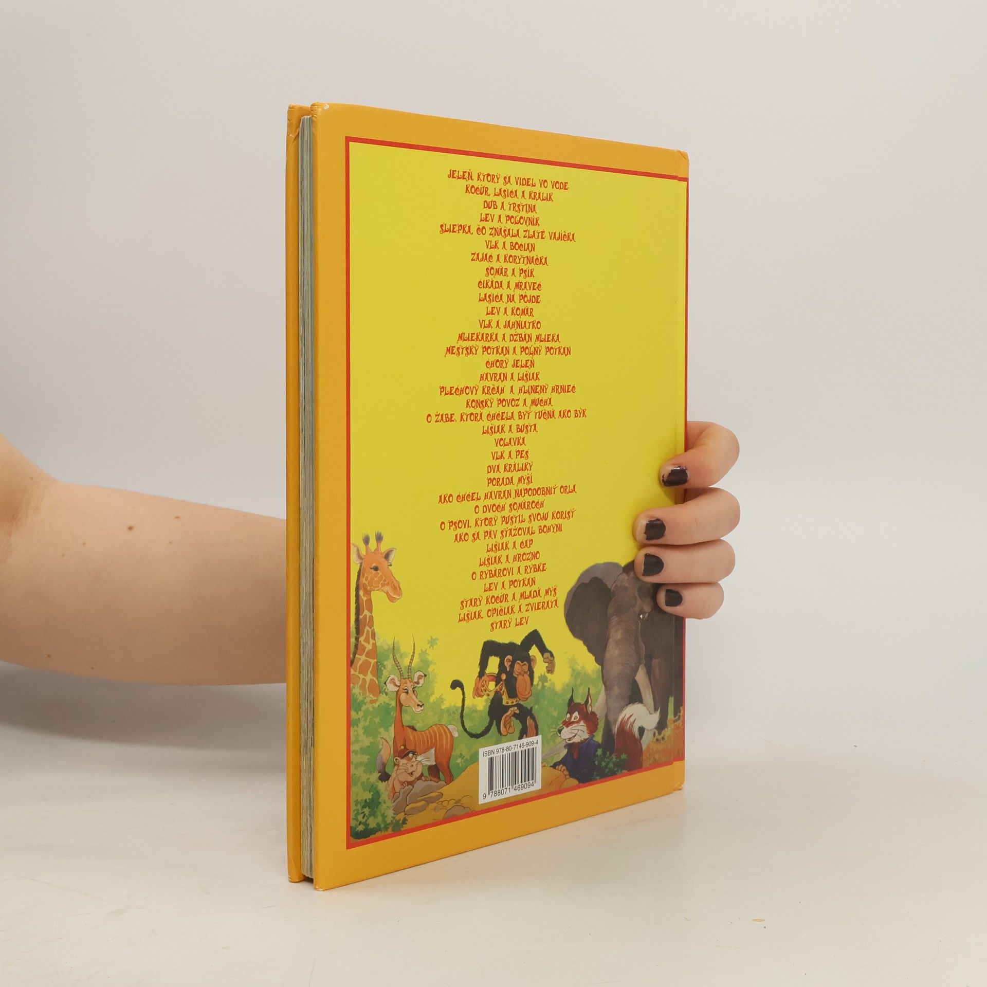 Bájky: Havran a lišiak, Zajac a korytnačka, Jastrab a slávik, Myš z mesta a poľná myš, Pes a odraz na hladine, Ako sa jeleň obzeral vo vode, Lišiak, opičiak a zvieratá, Cvrček a mravec, O sliepke, ktorá znášala zlaté vajíčka, Opica a delfín, Vlk, koza a kozliatko, Lišiak a hrozno, Zostarnutý lev, Ako sa chcel havran podobať orlovi, Holubica a mravec, Lišiak, vlk a kôň, Žaba, ktorá sa chcela vyrovnať býkovi, Vlk a jahniatko, Líška a bocian, Lasička na povale, Železný a hlinený hrniec, Kocúr a stará myš, Lev a komár, Pavúk a lastovička, Chorý jeleň, Vlk a pes, Lev a myš, Lišiak a cap, Zajac a žaby, Kocúr, lasička a králik, Dub a rákosie, Sršeň a med, Dve kozy, Volavka, Vlk pastierom, Korytnačka a dve kačice, Ako bocian pomohol vlkovi, Dostavník a mucha, Ako žaby chceli mať kráľa, Žaba a myš.