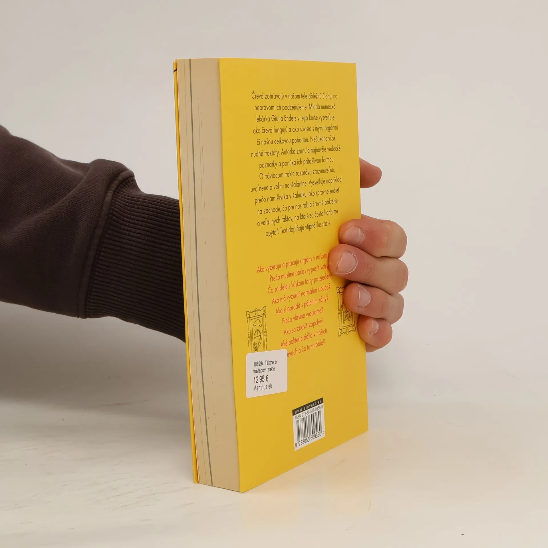 Črevá zohrávajú v našom tele dôležitú úlohu, no neprávom ich podceňujeme. Mladá nemecká lekárka Giulia Enders v tejto knihe vysvetľuje, ako fungujú a aké majú súvislosti s inými orgánmi či našou celkovou pohodou. Nečakajte však nudné traktáty. Autorka zhrnula najnovšie vedecké poznatky a ponúka ich príťažlivou formou. O tráviacom trakte rozpráva zrozumiteľne, uvoľnene a veľmi nonšalantne. Vysvetľuje napríklad, prečo nám škvŕka v žalúdku, ako správne sedieť na záchode, čo pre nás robia črevné baktérie a veľa iných faktov, na ktoré sa často hanbíme opýtať. Text dopĺňajú vtipné ilustrácie. Giulia Enders pôsobí na Ústave mikrobiológie na Univerzite Johanna Wolfganga Goetheho vo Frankfurte na Mohanom, venuje sa výskumu a pracuje na svojej doktorandskej práci. V roku 2012 zvíťazila vo vedeckej súťaži Science Slam vo Freiburgu. Z nemčiny do slovenčiny preložili Katarína Babinská a Gregor Babinský.