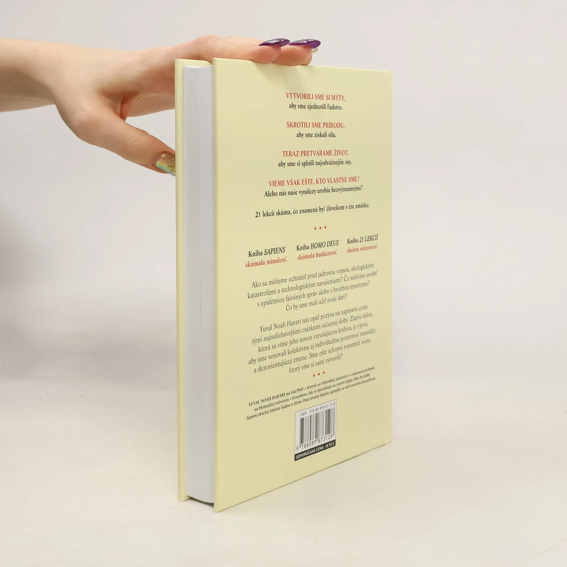 Kniha Sapiens skúmala minulosť. Kniha Homo Deus skúmala budúcnosť. Kniha 21 lekcií pre 21. storočie skúma súčasnosť. Ako sa môžeme ochrániť pred jadrovou vojnou, ekologickými katastrofami a technologickými narušeniami? Čo môžeme urobiť s epidémiou falošných správ alebo s hrozbou terorizmu? Čo by sme mali učiť svoje deti? Yuval Noah Harari nás opäť pozýva na napínavú cestu tými najnaliehavejšími otázkami súčasnej doby. Zlatou niťou, ktorá sa vinie jeho novou vzrušujúcou knihou, je výzva, aby sme venovali kolektívnu aj individuálnu pozornosť neustálej a dezorientujúcej zmene. Sme ešte schopní rozumieť svetu, ktorý sme si sami vytvorili? 21 lekcií pre 21. storočie skúma, čo znamená byť človekom v ére zmätku.