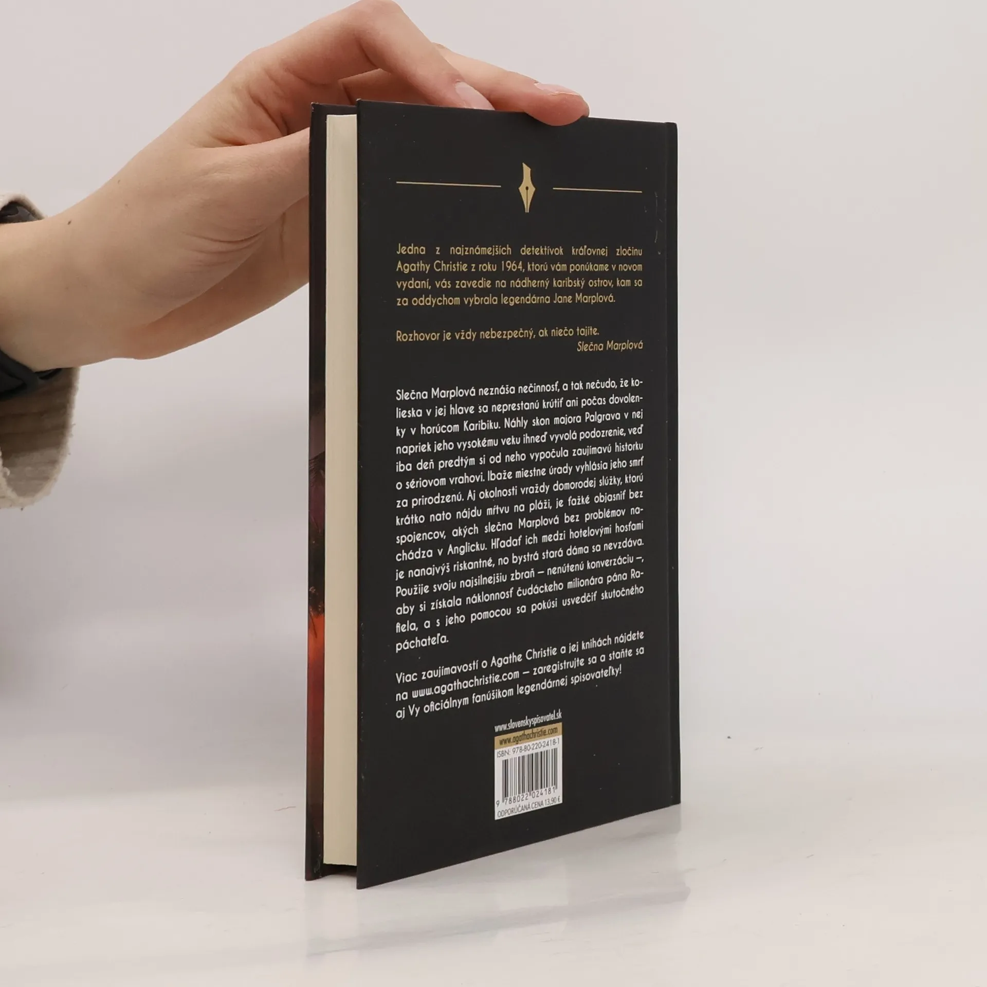 Jedna z najznámejších detektívok kráľovnej zločinu Agathy Christie z roku 1964, ktorú vám ponúkame v novom vydaní, vás zavedie na nádherný karibský ostrov, kam sa za oddychom vybrala legendárna Jane Marplová. Rozhovor je vždy nebezpečný, ak niečo tajíte. Slečna Marplová Slečna Marplová neznáša nečinnosť, a tak nečudo, že kolieska v jej hlave sa neprestanú krútiť ani počas dovolenky v horúcom Karibiku. Náhly skon majora Palgrava v nej napriek jeho vysokému veku ihneď vyvolá podozrenie, veď iba deň predtým si od neho vypočula zaujímavú historku o sériovom vrahovi. Ibaže miestne úrady vyhlásia jeho smrť za prirodzenú. Aj okolnosti vraždy domorodej slúžky, ktorú krátko nato nájdu mŕtvu na pláži, je ťažké objasniť bez spojencov, akých slečna Marplová bez problémov nachádza v Anglicku. Hľadať ich medzi hotelovými hosťami je nanajvýš riskantné, no bystrá stará dáma sa nevzdáva. Použije svoju najsilnejšiu zbraň – nenútenú konverzáciu –, aby si získala náklonnosť čudáckeho milionára pána Rafiela, a s jeho pomocou sa pokúsi usvedčiť skutočného páchateľa.