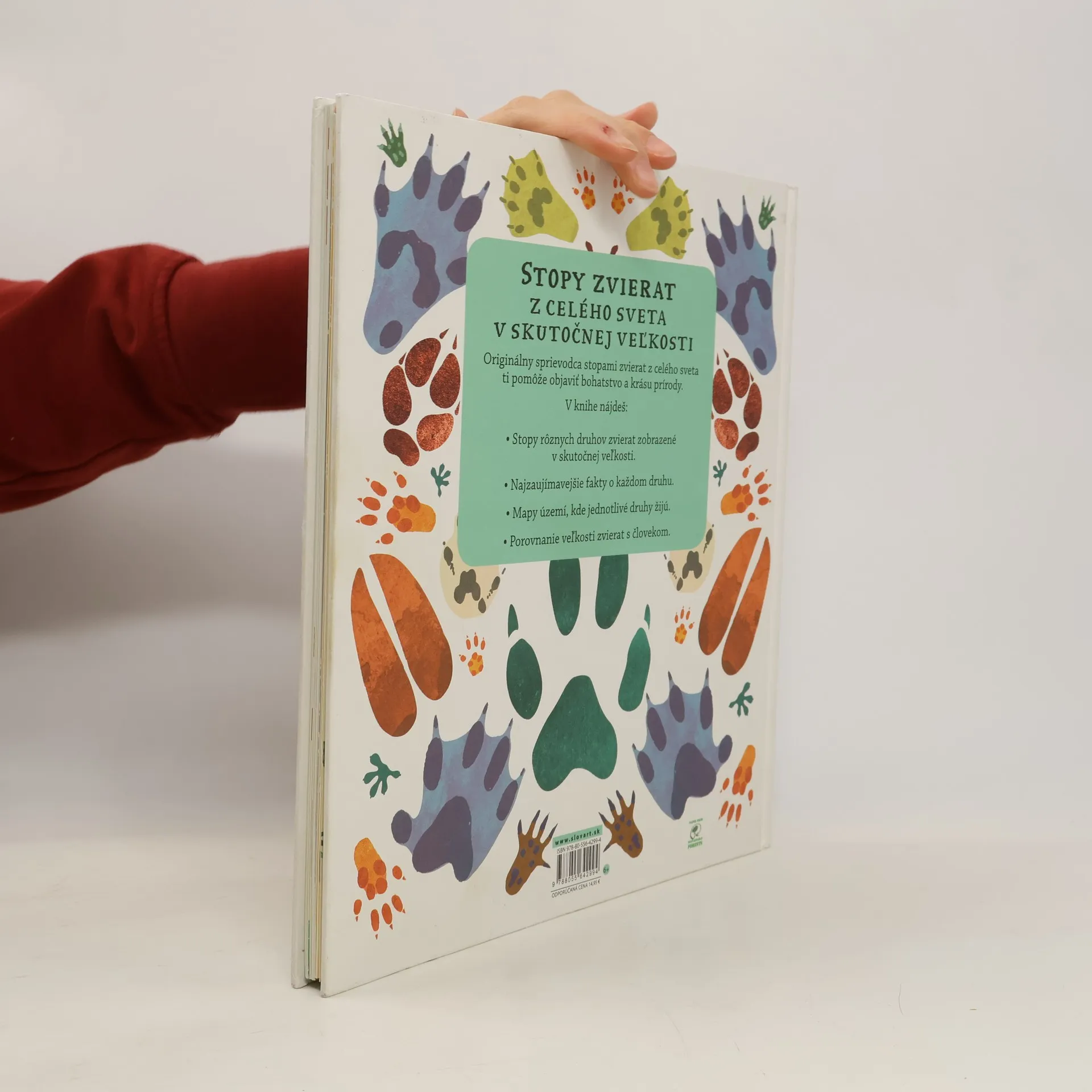 Originálny sprievodca stopami zvierat z celého sveta vám pomôže objaviť bohatstvo a krásu prírody. V knihe nájdete stopy rôznych druhov zvierat zobrazené v skutočnej veľkosti, najzaujímavejšie fakty o každom druhu, mapy území, kde jednotlivé druhy žijú, a navyše porovnanie veľkosti zvierat s človekom.