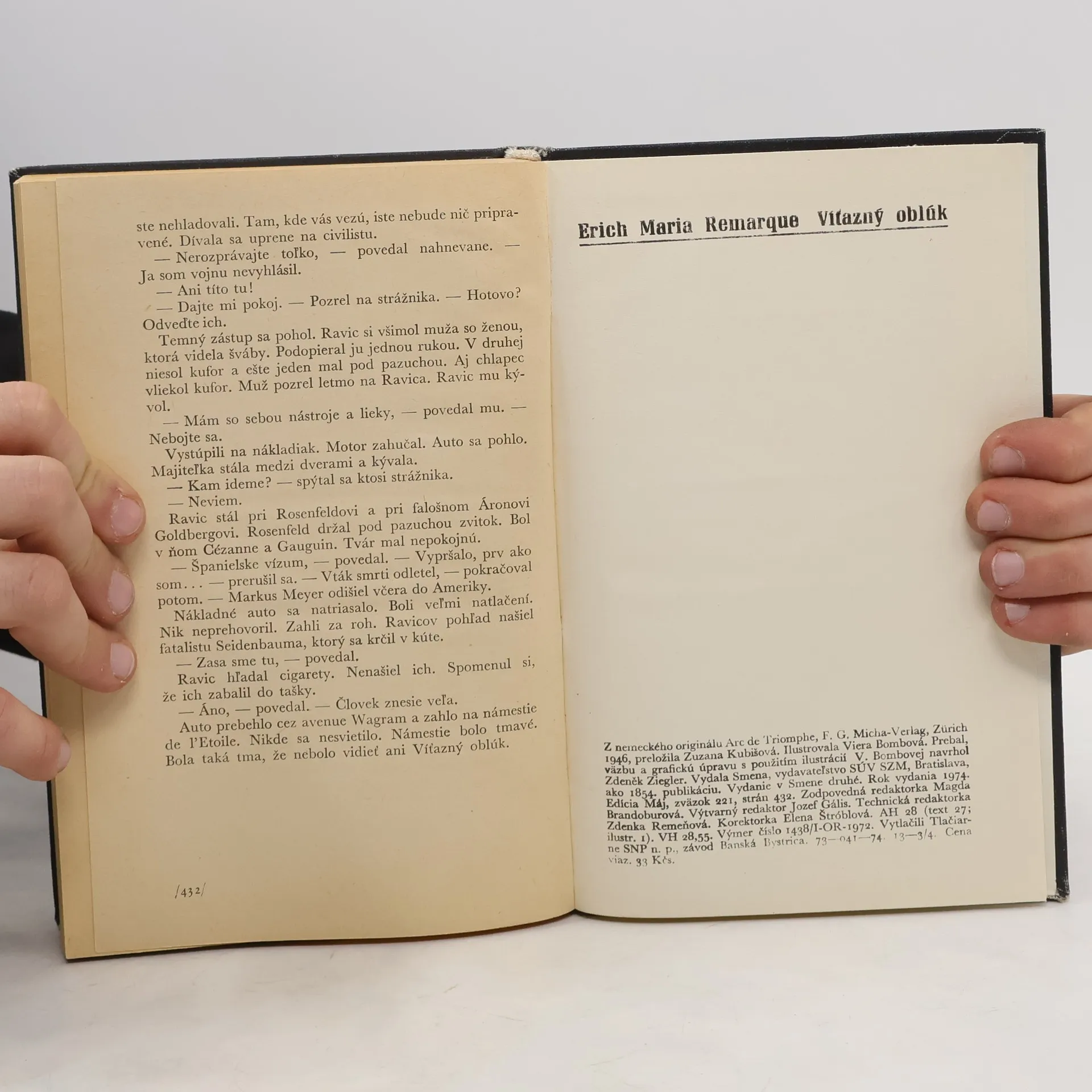 Rovnako ako všetky Remarquove romány aj Víťazný oblúk bol preložený do mnohých svetových jazykov i sfilmovaný. Dej sa odohráva pred druhou svetovou vojnou v Paríži, kde sa podarilo ukryť lekárovi Ravicovi, ktorý ušiel z nemeckého koncentračného tábora. V tomto meste pod Víťazným oblúkomžijú aj mnohí iní utečenci zo všetkých kútov Európy. Ich neistý, bezútešný život je presvietený iba teplotou náhodných priateľských vzťahov. Lekár Ravic patrí k tým šťastnejším, lebo netrpí núdzu a v istej šťastnej chvíli takmer nájde naplnenie života v láske, ale mladá herečka Joan Madou len ako hviezda preletí cez jeho temnú oblohu a zapadne. Ešte raz sa s ňou Ravic stretáva — operuje ju — nie je však v jeho moci zachrániť ju. E. M. Remarque v tomto románe o trpkom údele emigrantov odhaľuje neľútostnú tvár fašizmu, kriticky hodnotí skorumpovaný politický a spoločenský systém krajiny tzv. slobody a humanisticky vyzdvihuje jediný zmysel v živote človeka, ktorým je ľudské porozumenie a láska. Vydanie v Smene druhé.