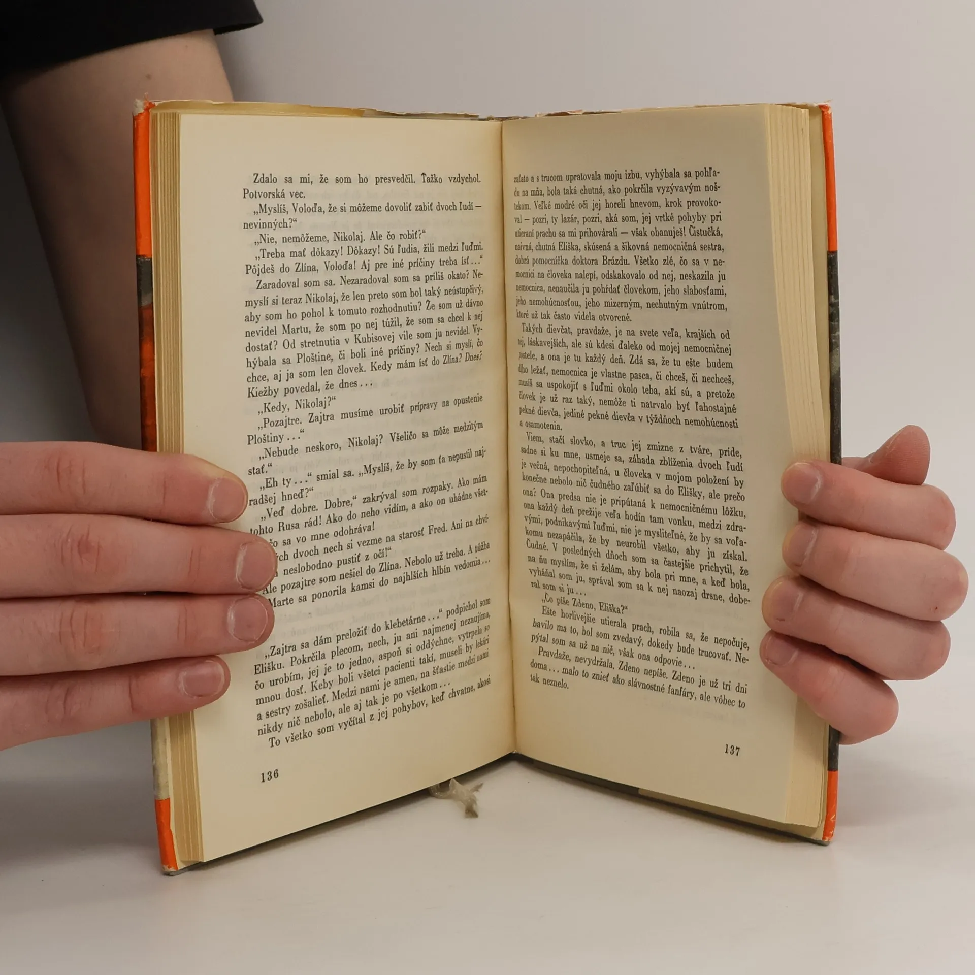 Hlavnou postavou a zároveň aj rozprávačom románu je partizán Voľoda. V posledné dni vojny ho trafila guľka do chrbtice. Odviezli do nemocnice, kde sa o neho starali doktor Brázda a sestrička Eliška. Voľoda mal ochrnutú spodnú časť tela od pása dole. Bol netrpezlivým pacientom, bál sa, že zostane mrzákom. Ľutoval, že prežil. Doktor Brázda veril, že Voľoda vyzdravie, pretože miechu mal neporušenú. Medzi Voľodom a Eliškou sa postupne vytvoril veľmi dôverný a blízky vzťah. 7. vydání.