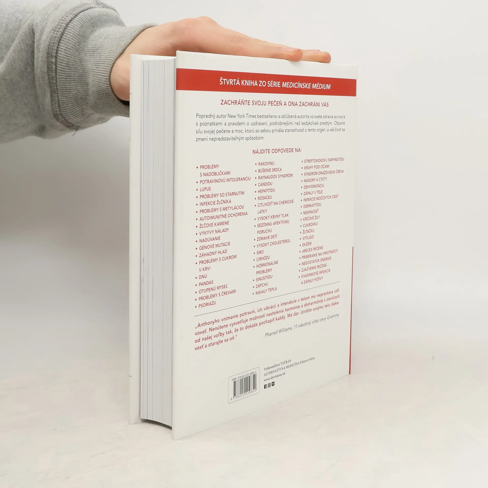 Táto kniha doslova kraľuje medzi publikáciami Anthonyho Williama. Z každej vety sa nám prihovára pravda. Dozvieme sa nové a netradičné informácie, ktoré nikde inde nenájdeme. Navyše je veľmi zrozumiteľná. Kniha Medicínske médium: Záchrana pečene ponúka odpovede, ktoré ste mali poznať už veľmi dávno. Medicínske médium Anthony William s typickým zanietením prináša jedinečný pohľad na doposiaľ neobjavené funkcie tohto životodarného orgánu, vysvetľuje, čo sa skrýva za desiatkami zdravotných problémov, ktoré nám strpčujú život, a ponúka detailný návod, ako máme postupovať, aby sme ho prežili čo najlepšie. Sami zistíte, čo so sebou prináša takáto záchrana pečene – budete rozvážnejší, pokojnejší, šťastnejší a schopnejší prispôsobiť sa dnešnej hektickej dobe. Dozviete sa, ako zlepšiť spánok, nastoliť rovnováhu cukru v krvi, znížiť krvný tlak, schudnúť či vyzerať a cítiť sa mladšie. Zdravá pečeň vás zbaví stresu, bude to váš spojenec v boji.