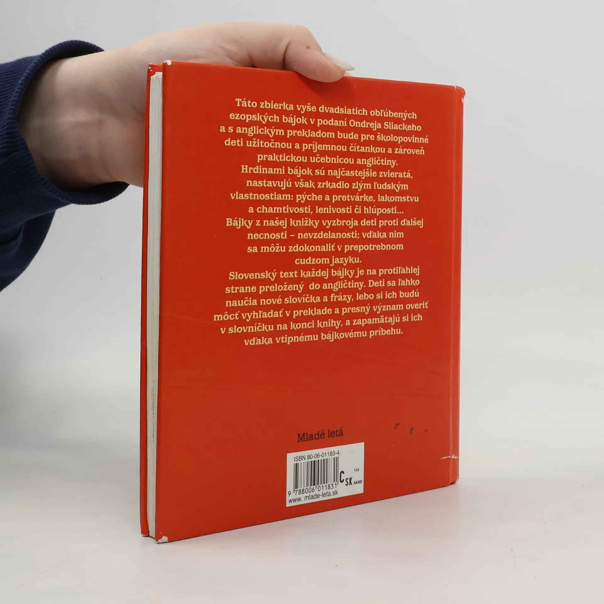 Ezopské bájky v podaní Ondreja Sliackeho Táto zbierka takmer tridsiatich obľúbených ezopských bájok bude pre školopovinné deti nielen užitočnou a príjemnou čítankou, ale i modernou pomôckou pri osvojovaní si cudzieho jazyka. Všetky bájky sú preložené do angličtiny, takže deti sa ľahko naučia nové slovíčka a frázy v ucelenom texte bájkového príbehu. Bájky nás učia, ako dobro víťazí nad zlom, klamstvom či lenivosťou v sebe i v druhých. Nastavujú nám zrkadlo a nielen poučia, ale i rozveselia malých i veľkých... Kniha vychádza aj v česko-anglickej verzii.