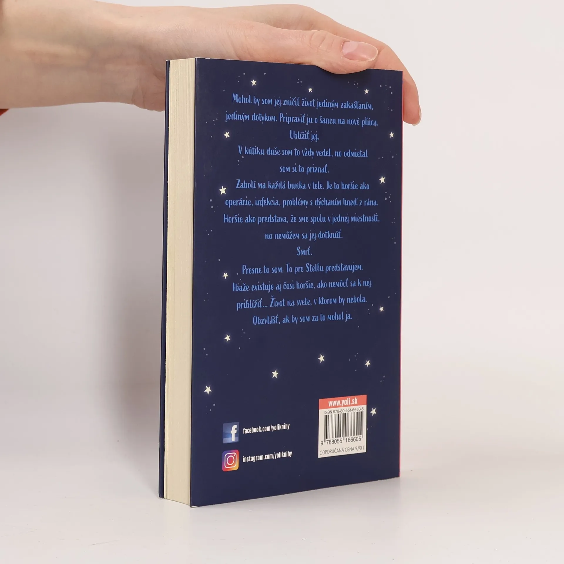 Viem, že je to môj posledný nádych. Je pre ňu. Stella Grantová trpí cystickou fibrózou a polovicu života prežila v nemocnici. Zákerná choroba jej odmalička diktuje každý krok. Ak nechce ohroziť šancu na transplantáciu pľúc, musí sa strániť každého kontaktu s možným nositeľom infekcie. Stella si potrpí na disciplínu a obmedzenia súvisiace s liečbou do bodky dodržiava. Dva metre od seba. Tak znie zlaté pravidlo každého pacienta s touto diagnózou. Bez výnimky. Will Newman, naopak, na liečbu kašle. O týždeň má osemnásť a potom zbohom, nemocnica. Will je presne typ, od ktorého sa má Stella držať čo najďalej. Ak by ju nakazil baktériou, ktorá jeho už o šancu na predĺženie života pripravila, Stellu by čakal rovnaký údel. Lenže čím viac sa zbližujú, tým je pre nich dvojmetrový odstup väčším trestom. Pľúca si chránia, no srdce trpí. Čo keby si ukradli aspoň kúsok slobody, o ktorú ich choroba pripravila, a skrátili bezpečnú vzdialenosť o jediný krok?
