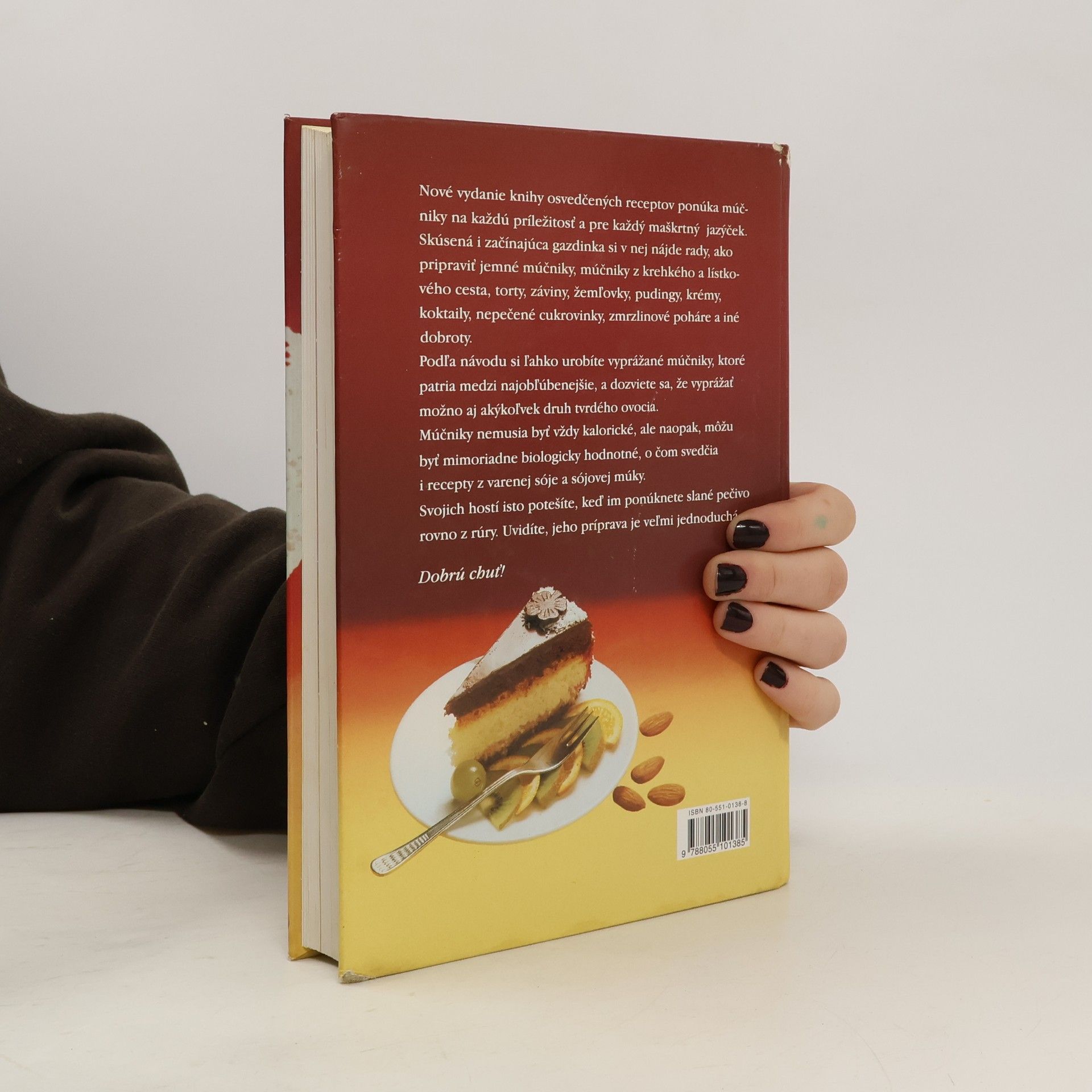 Moučníková kuchařka 9. přepracované vydání. Obsah: Na čo pamätať pri príprave múčnikov, Ako pripravovať múčniky, Jemné múčniky, Múčniky z krehkého cesta, Čajové a dezertné pečivo, Múčniky z lístkového cesta, Záviny, Slané múčniky, Kysnuté múčniky, Varené múčniky, Žemľovky, Nákypy, Pudingy, Vyprážané múčniky, Palacinky, dolky a lievance, Trhance, Omelety, Nepečené cukrovinky, Krémy, peny, flamere, Zmrzliny a zmrzlinové poháre, Ovocné limonády a nápoje, Ovocné kompóty a šaláty. Cena knihy v čase vydania: 40.- Kčs.