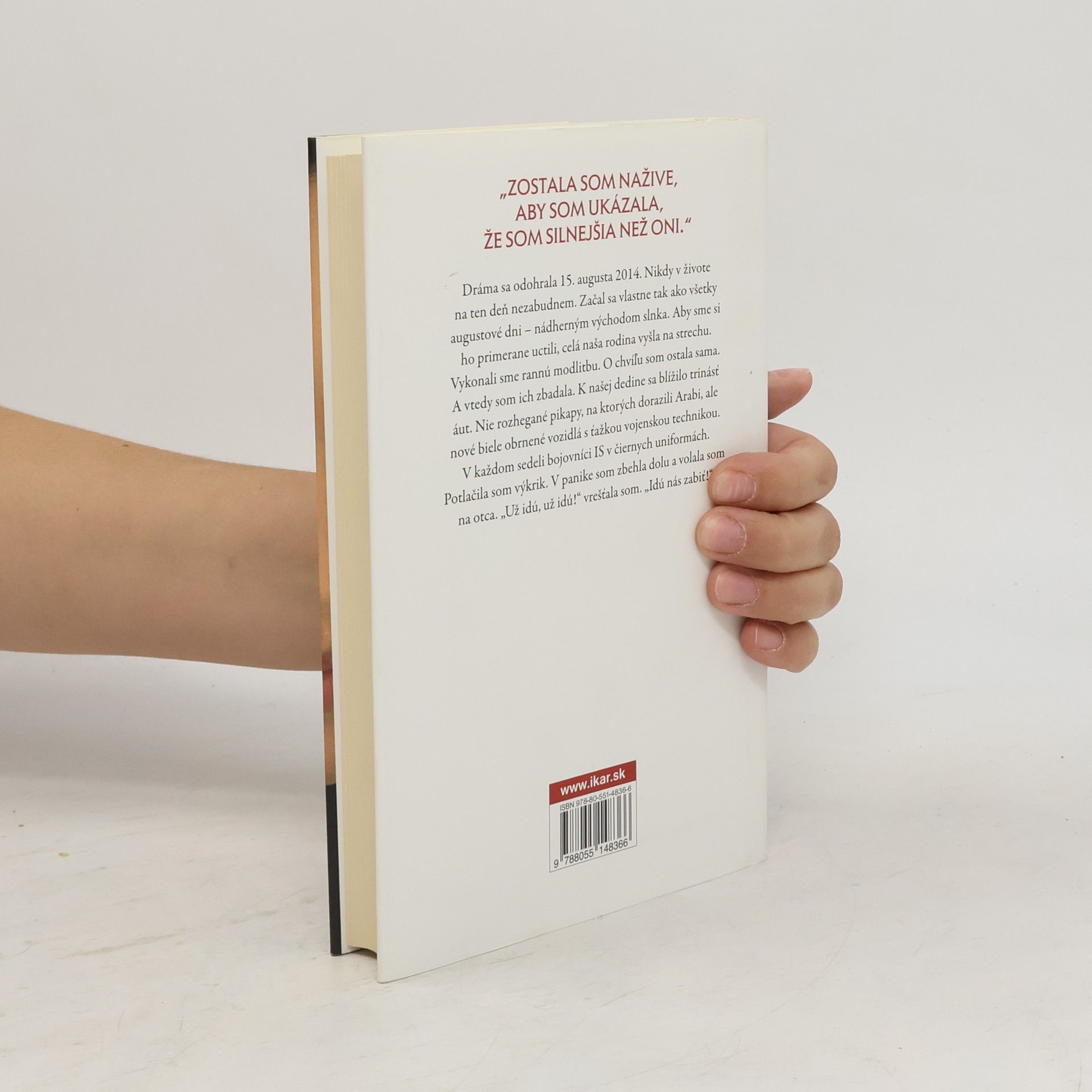 Skutočný príbeh o hrôzach Islamského štátu „Zostala som nažive, aby som ukázala, že som silnejšia než oni.“ Košo, pokojná dedina v irackom pohorí Sindžár. Farida práve skončila predposlednú triedu strednej školy a teší sa na letné prázdniny. Lenže tento rok je všetko ináč. V auguste 2014 dedinu prepadli bojovníci Islamského štátu. Stúpenci teroristickej organizácie zhromaždili všetkých obyvateľov, mužov zabili, ženy odvliekli. Farida sa na dlhé mesiace stala otrokyňou – a pritom zažila nepredstaviteľné krutosti. Jedného dňa sa však odváži utiecť a postaví sa na čelo šesťčlennej skupinky dievčat. Jedinečný dobový dokument o hrôzach Islamského štátu. Dojímavý príbeh ukazuje, že priateľstvo, láska a vôľa žiť sú silnejšie ako barbarstvo.
