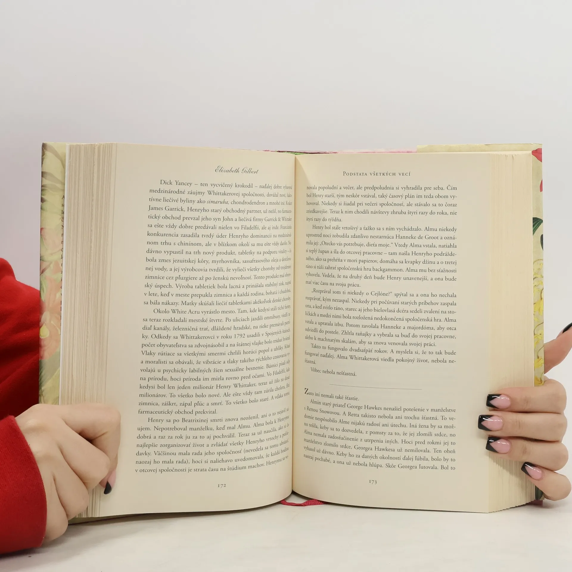 Román Podstata všetkých vecí sa začína koncom 18. storočia a rozpráva strhujúci príbeh o čase, keď ľudstvo stálo na prahu takmer všetkých dôležitých objavov a človek si začal podmaňovať svet. Bystrá Alma Whittakerová je dcérou charizmatického obchodníka s rastlinami. Zatiaľ čo vďaka štúdiu a záujmu o botaniku čoraz hlbšie preniká do záhad evolúcie, muž, ktorého ľúbi, ju zoznamuje s iným svetom – s duchovným kráľovstvom zázrakov. Oboch však spája úsilie pochopiť svet okolo seba a podstatu celého bytia.