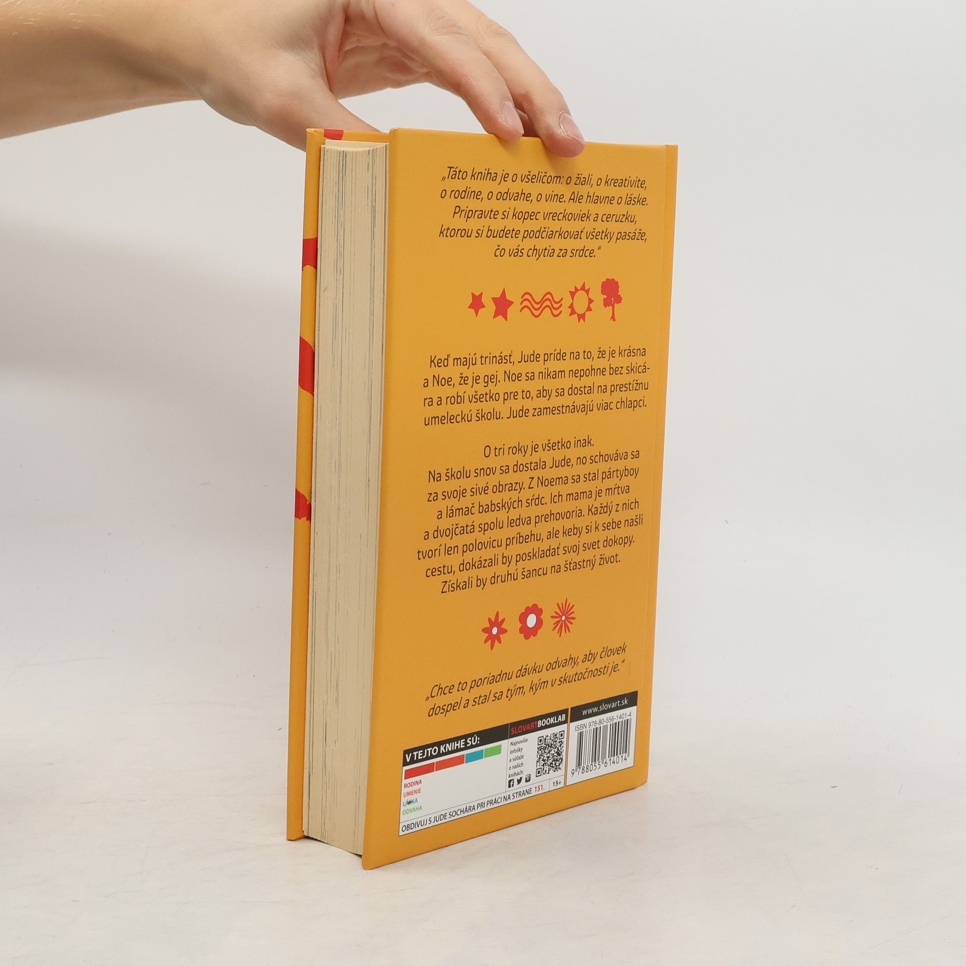 Výnimočný príbeh od autorky románu Nebo na dosah. To pravé pre nedočkavých fanúšikov Johna Greena, Gayle Forman a Rainbow Rowell. Dvojčatá Jude a Noe znamenajú jeden pre druhého všetko. Keď majú trinásť, Jude príde na to, že je krásna a Noe, že je gej. Noe miluje okrem sestry už len kreslenie a robí všetko pre to, aby sa dostal na prestížnu umeleckú školu. Jude zamestnávajú viac chlapci. O tri roky je všetko inak. Na školu snov sa dostala Jude, ale je z nej utiahnutá sivá myška, čo sa skrýva za svoje obrazy. Z Noema sa stal pártyboy a lámač babských sŕdc. A ich mama je mŕtva. Dvojčatá spolu ledva prehovoria a ani jeden vlastne nevie prečo. Neuvedomujú si, že každý z nich tvorí len polovicu príbehu, a keby si k sebe našli cestu, dokázali by poskladať svoj svet dokopy, získali by druhú šancu na šťastný život.