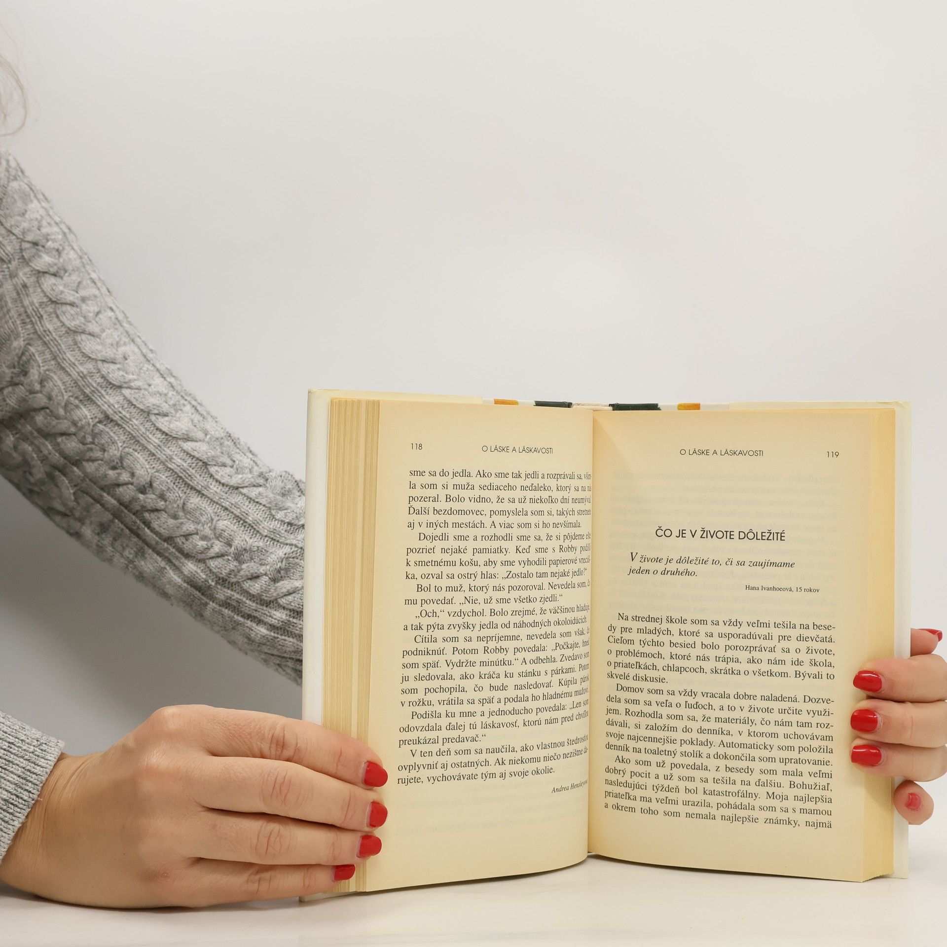 Príbehy o živote, láske, učení a hľadaní pravdy. Kapitoly a poviedky: 1. O vzájomných vzťahoch- O chvíľu, Súzvuk duší, Premárnená príležitosť, Prvý bozk, Život je zmena, Na lásku zo strednej školy sa nezabúda. 2. O priateľstve-Vianočná pohľadnica, Len si poplač, Kartónová škatuľa. 3. O rodine-Neopúšťaj ma, Mama, Sestrička, Ukáž, čo vieš, Môj starší brat, Bratov hlas, Výnimočný človek, Mám ťa rád, otec, Domov. 4. O láske a láskavosti-Tigrica, Horúce srdce, Tajomstvo šťastia, Podať ruku v núdzi, Úsmev, Spomienka na Mason-Dixon, Pani Linková, Dvojitý dar, Čo je v živote dôležité, Povedzte im to, Miluj ľudí, Orgován kvitne každú jar, Farebný sprej. 5. O učení-Vajíčková pomsta, Dlhá cesta domov, Cena vďaky, Snažím sa zapamätať si, Pani Virginia DeViewová, kde ste ?, Čo sa deje ?, Nekonečný dar, Som..., Sparky, Keby som bola vedela. 6. Chvľe bolesti-Len jeden pohárik, Tanec, Mŕtvy v sedemnástich, Držiteľ zlatej medaily, Desiderata. 7. To je rozdiel-Čo je to úspech ?, Hlavu hore...vydrž v škole, Odvaha, Rozsvieťte svoje svetlo, V ohni, Zlomené krídlo. 8. Skúste to-Dievča od susedov, Ja sa vrátim, Len ja, Helen Kellerová a Anne Sullivanová, Hrobári, Chlapec, ktorý rozumel reči delfínov, Dobehni svoj sen, Bežec storočia, Ak, Dnes som sa nečesala, Dokázal som to, Dospievanie, Na prahu dospelosti.