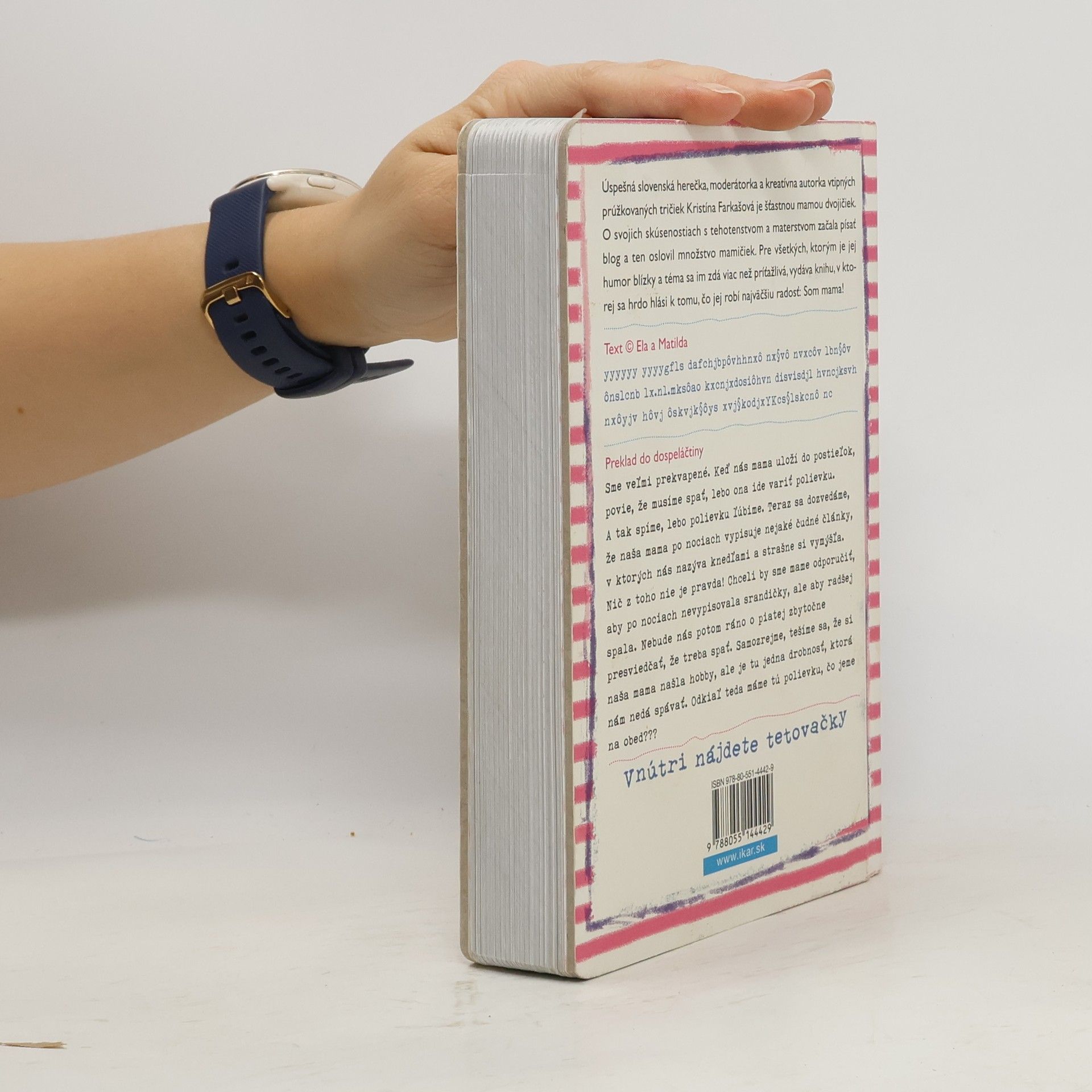 Úspešná slovenská herečka, moderátorka a kreatívna autorka vtipných prúžkovaných tričiek Kristína Farkašová je šťastnou mamou dvojičiek Ely a Matildy. O svojich skúsenostiach a zážitkoch s tehotenstvom a materstvom začala písať vtipný blog a ten oslovil množstvo mamičiek. Pre všetkých, ktorým je jej humor blízky a téma sa im zdá viac než príťažlivá, vydáva knihu, v ktorej sa hrdo hlási k tomu, čo jej robí najväčšiu radosť: Som mama! Ilustroval Boris Farkaš.
