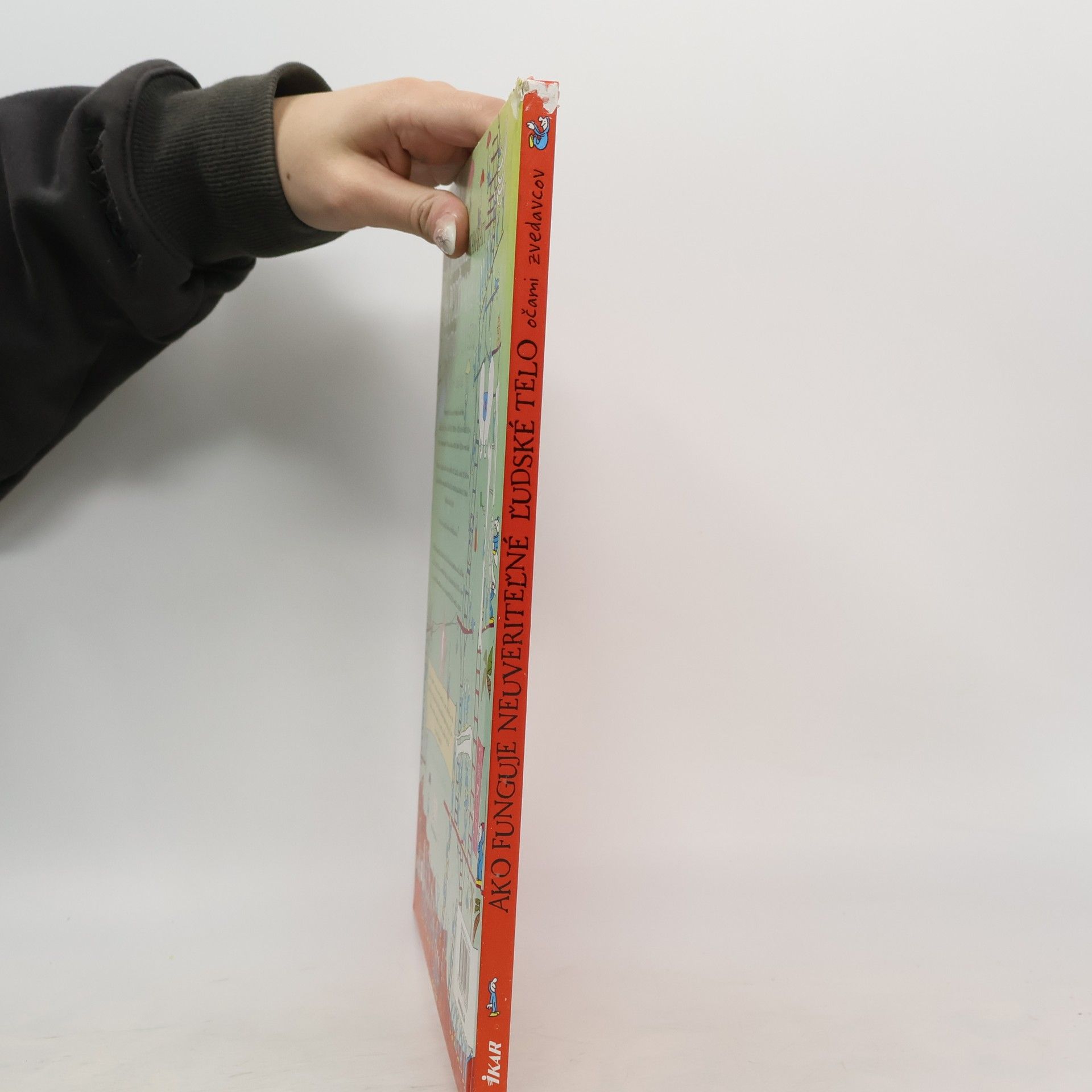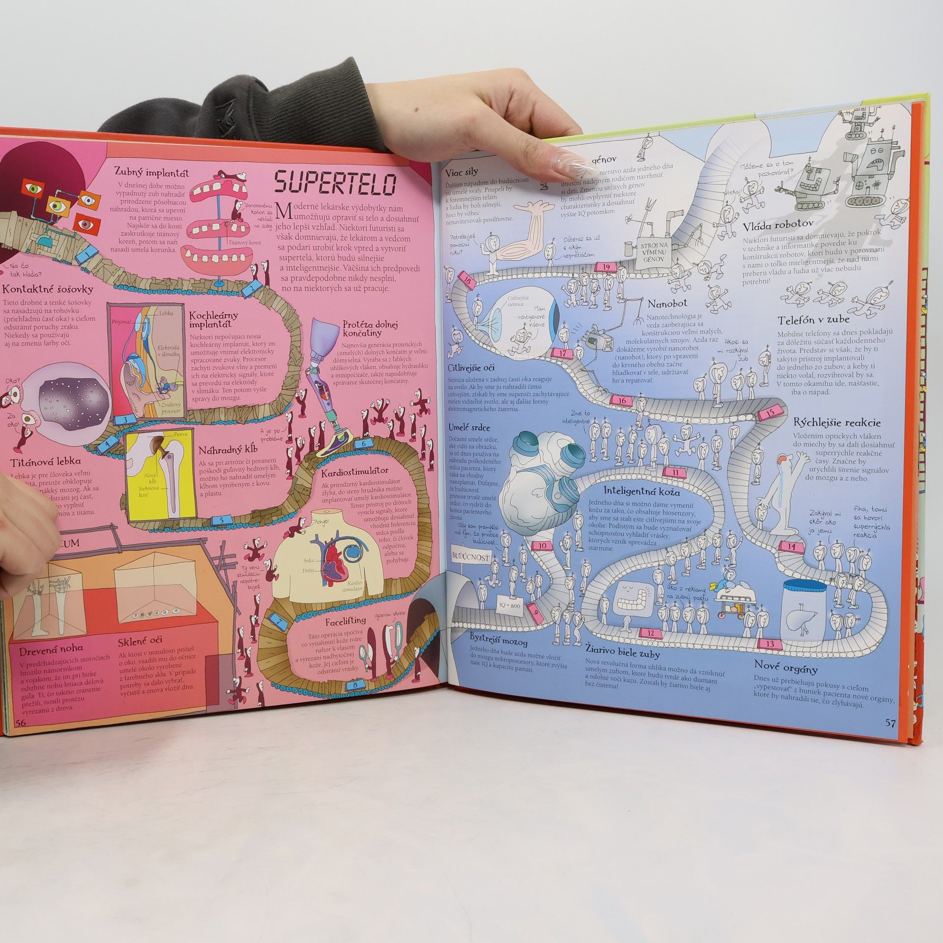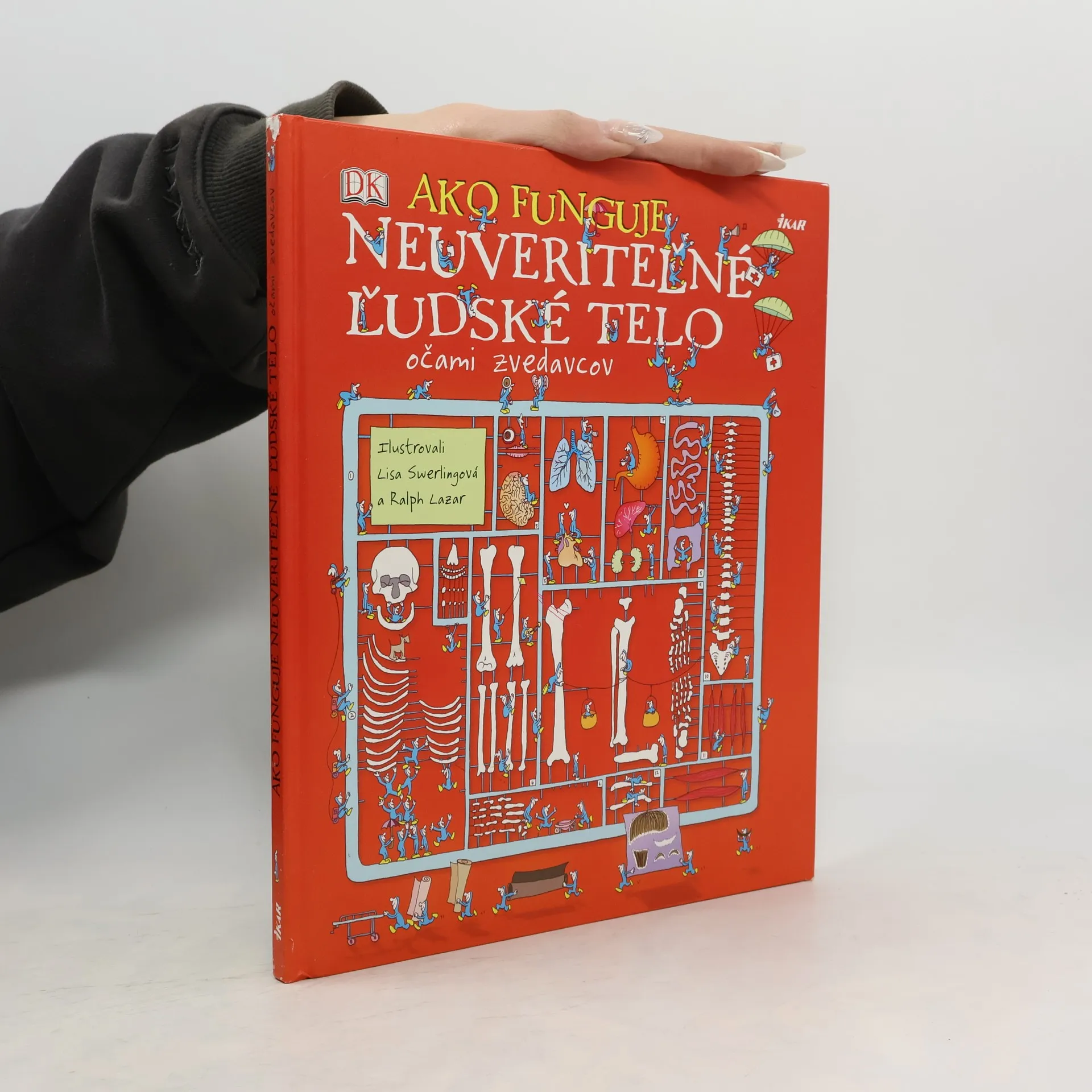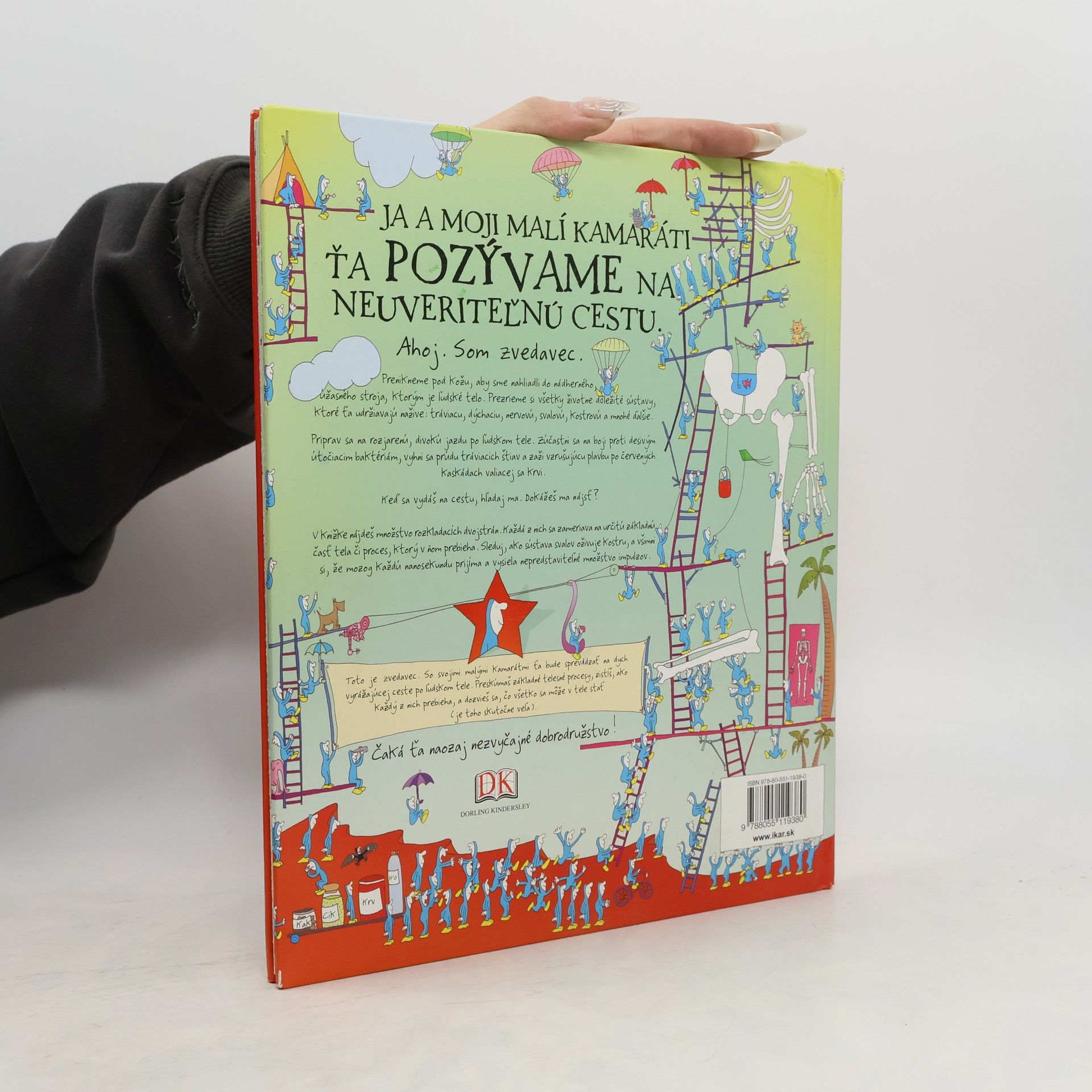 Ahoj. Som zvedavec. Ja a moji malí kamaráti ťa pozývame na neuveriteľnú cestu. Prenikneme pod kožu, aby sme nahliadli do nádherného, úžasného stroja, ktorým je ľudské telo. Prezrieme si všetky životne dôležité sústavy, ktoré ťa udržiavajú nažive: tráviacu, dýchaciu, nervovú, svalovú, kostrovú a mnohé ďalšie. Priprav sa na rozjarenú, divokú jazdu po ľudskom tele. Zúčastni sa na boji proti desivým útočiacim baktériám, vyhni sa prúdu tráviacich štiav a zaži vzrušujúcu plavbu po červených kaskádach valiacej sa krvi. Keď sa vydáš na cestu, hľadaj ma. Dokážeš ma nájsť? V knižke nájdeš množstvo rozkladacích dvojstrán. Každá z nich sa zameriava na určitú základnú časť tela či proces, ktorý v ňom prebieha. Sleduj, ako sústava svalov oživuje kostru, a všimni si, že mozog každú nanosekundu prijíma a vysiela nepredstaviteľné množstvo impulzov. Čaká ťa naozaj nezvyčajné dobrodružstvo!