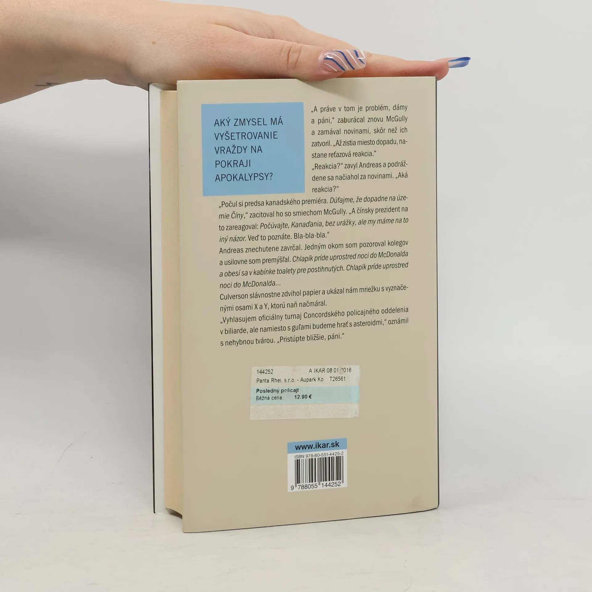 Aký zmysel má vyšetrovanie vraždy na pokraji apokalypsy? Mladý detektív Hank Palace si kladie túto otázku odvtedy, čo astronómovia spozorovali asteroid 2011GV1. Ľuďom nezostala nijaká šanca, nijaká nádej. Len šesť krátkych mesiacov ostáva do jeho zrážky so Zemou. Ekonomika USA sa rúca, úroda hnije na poliach. Kostoly či synagógy sú plné, ale rovnako aj bary a na uliciach napriek novým krízovým zákonom vládne chaos. Ľudia na celom svete odchádzajú z práce, nie však Hank Palace, neskúsený, ale poctivý detektív v mestečku Concord v New Hampshire. Vyšetruje smrť obesením v meste, ktoré každý týždeň zažíva najmenej desiatku samovrážd, no táto sa mu zdá podozrivá. Palace je vlastne jediný policajt, ktorému záleží na odhalení vraha. Román Posledný policajt, prvá časť trilógie, ponúka záhadu odohrávajúcu sa na pokraji celosvetovej apokalypsy. Keďže Palaceovo vyšetrovanie prebieha v tieni asteroidu 2011GV1, otázka kto to urobil napokon nie je tá najťažšia. Na akých základoch stojí naša civilizácia? Akú hodnotu má ľudský život? Čo by ktokoľvek z nás urobil, keby naše dni boli spočítané? Obálku podľa originálneho návrhu upravil Augustín Putera.