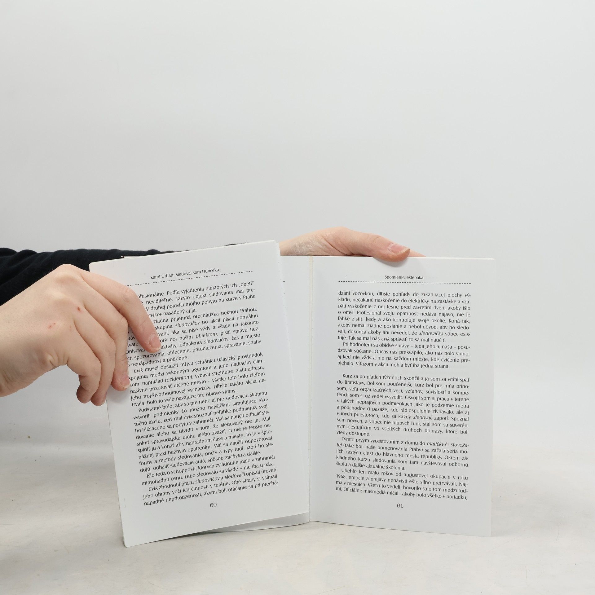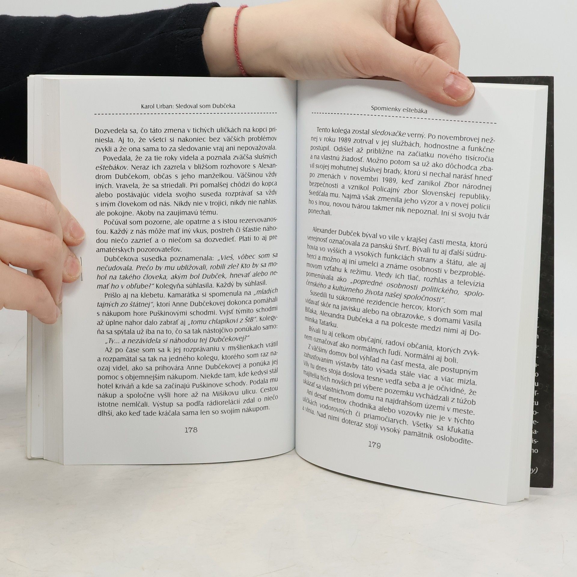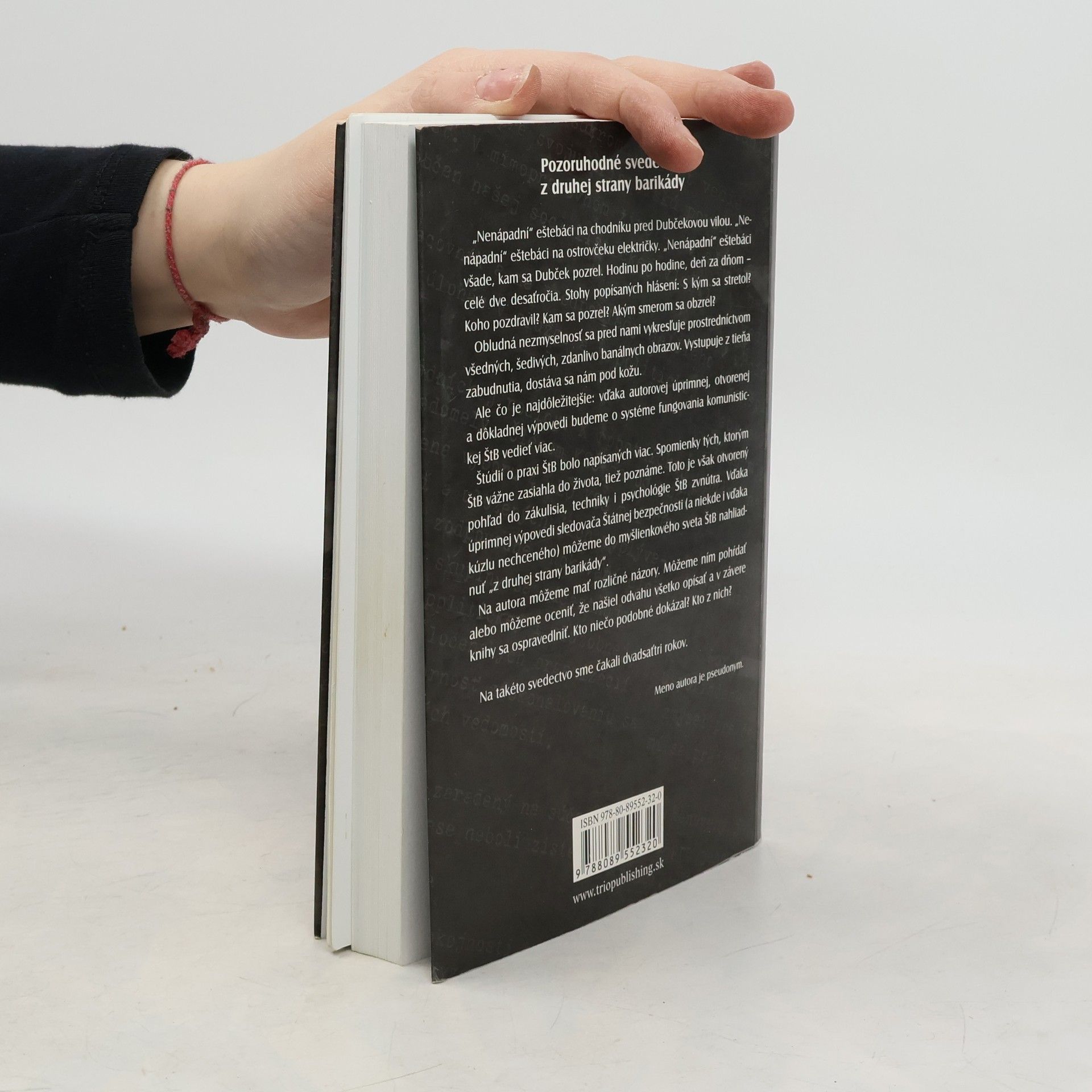 Pozoruhodné svedectvo z druhej strany barikády "Nenápadní" eštebáci na chodníku pred Dubčekovou vilou. "Nenápadní" eštebáci na ostrovčeku električky. "Nenápadní" eštebáci všade, kam sa Dubček pozrel. Hodinu po hodine, deň za dňom - celé dve desaťročia. Stohy podpísaných hlásení: S kým sa stretol? Koho pozdravil? Kam sa pozrel? Akým smerom sa obzrel? Obludná nezmyselnosť sa pred nami vykresľuje prostredníctvom všedných, šedivých, zdanlivo banálnych obrazov. Vystupuje z tieňa zabudnutia, dostáva sa nám pod kožu. Ale čo je najdôležitejšie: vďaka autorovej úprimnej, otvorenej a dôkladnej výpovedi budeme o systéme fungovania komunistickej ŠtB vedieť viac. Štúdií o praxi ŠtB bolo napísaných viac. Spomienky tých, ktorým ŠtB vážne zasiahla do života, tiež poznáme. Toto je však otvorený pohľad do zákulisia, techniky i psychológie ŠtB zvnútra. Vďaka úprimnej výpovedi sledovača Štátnej bezpečnosti (a niekde i vďaka kúzlu nechceného) môžeme do myšlienkového sveta ŠtB nahliadnuť "z druhej strany barikády". Na autora môžeme mať rozličné názory. Môžeme ním pohŕdať alebo môžeme oceniť, že našiel odvahu všetko opísať a v závere knihy sa ospravedlniť. Kto niečo podobné dokázal? Kto z nich? Na takéto svedectvo sme čakali dvadsaťtri rokov.
