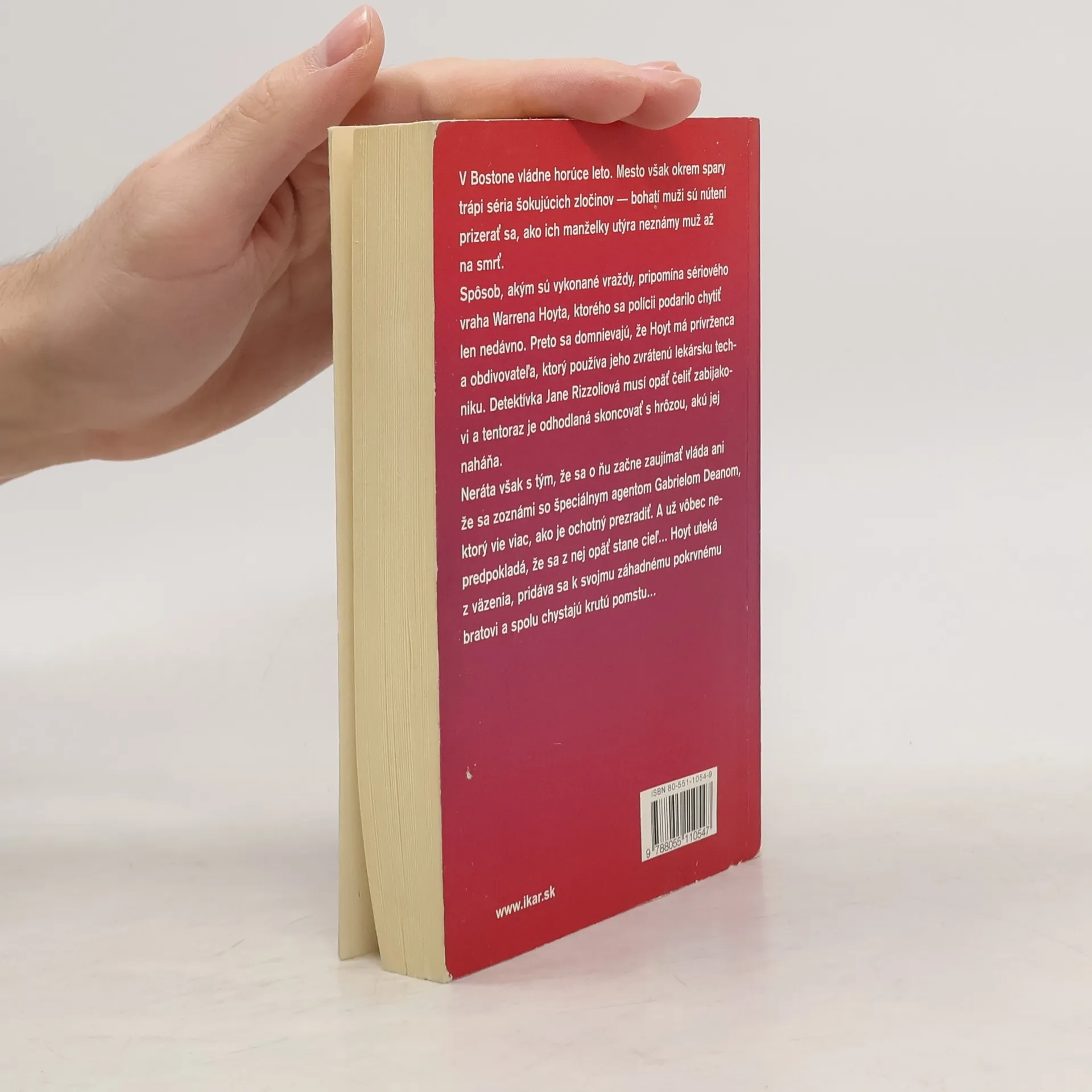 V Bostone vládne horúce leto. Mesto však okrem spary trápi séria šokujúcich zločinov – bohatí muži sú nútení prizerať sa, ako ich manželky týra neznámy muž až na smrť. Spôsob, akým sú vykonané vraždy, pripomína sériového vraha Warrena Hoyta, ktorého sa polícii podarilo chytiť len nedávno. Preto sa domnievajú, že Hoyt má prívrženca a obdivovateľa, ktorý používa jeho zvrátenú lekársku techniku. Detektívka Jane Rizzoliová je opäť nútená čeliť zabijakovi a tentoraz je odohdlaná skoncovať s hrôzou, akú jej naháňa. Neráta však s tým, že sa o ňu začne zaujímať vláda, ani že sa zoznámi so špeciálnym agentom Gabrielom Deanom, ktorý vie viac, ako je ochotný prezradiť. A už vôbec nepredpokladá, že sa z nej opäť stane cieľ... Hoyt uteká z väzenia, pridáva sa k svojmu záhadnému pokrvnému bratovi a spolu chystajú krutú pomstu.