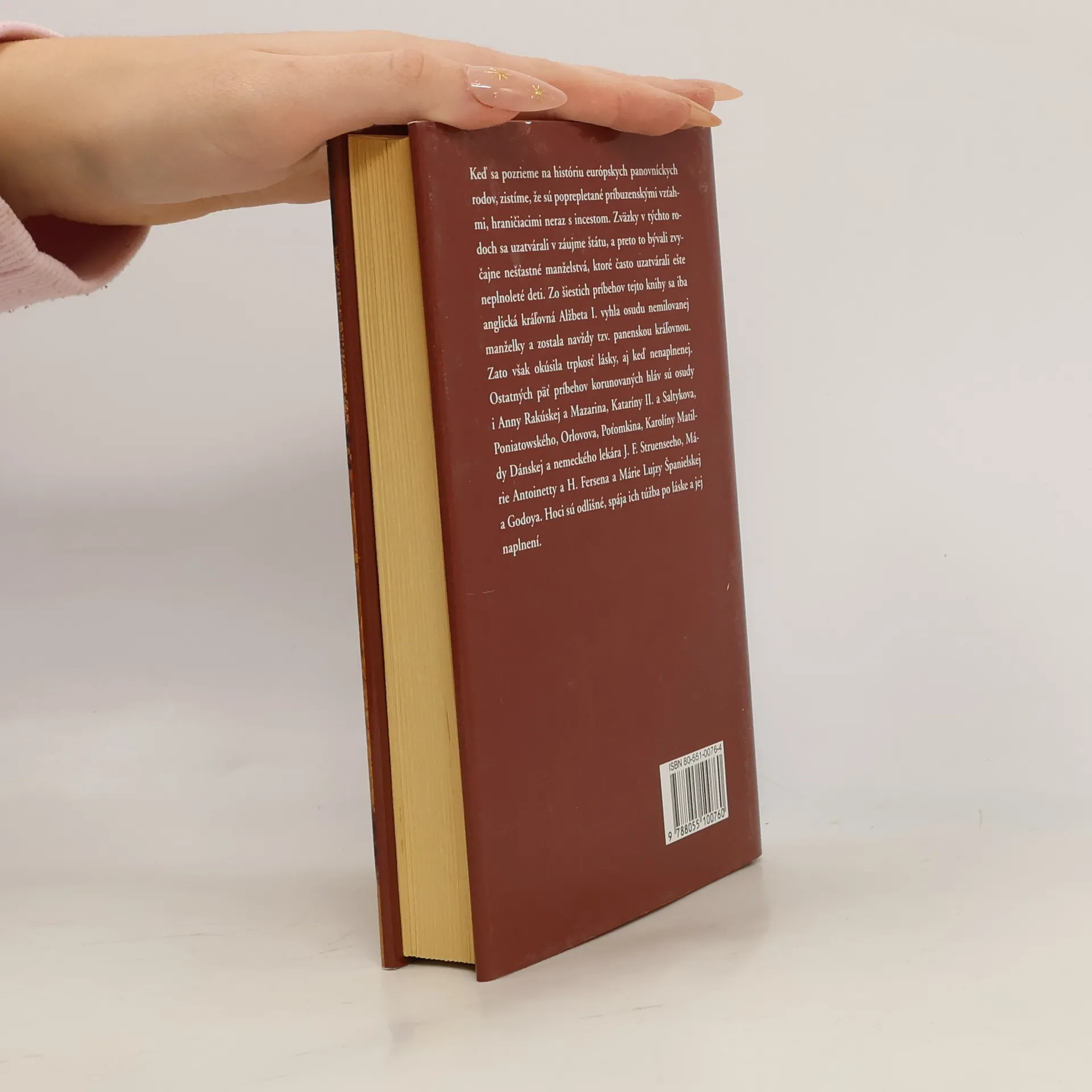 Keď sa pozrieme na históriu európskych panovníckych rodov, zistíme, že sú popretkávané príbuzenskými vzťahmi, hraničiacimi neraz s incestom. Zväzky v týchto rodoch sa uzatvárali v záujme štátu, a preto to bývali zvyčajne nešťastné manželstvá, ktoré často uzatvárali ešte neplnoleté deti. Zo šiestich príbehov tejto knihy sa iba anglická kráľovná Alžbeta I. vyhla osudu nemilovanej manželky a zostala navždy tzv. panenskou kráľovnou. Zato však okúsila trpkosť lásky, aj keď nenaplnenej. Ostatných päť príbehov korunovaných hláv sú osudy i Anny Rakúskej a Mazarina, Kataríny II. a Saltykova, Poniatowského, Orlovova, Poťomkina, Karolíny Matildy Dánskej a nemeckého lekára J. F. Struenseeho, Márie Antoinetty a H. Fersena a Márie Lujzy Španielskej a Godoya. Hoci sú odlišné, spája ich túžba po láske a jej naplnení. Kniha je doplnená rodokmeňmi jednotlivých osobností a ich rodov.
