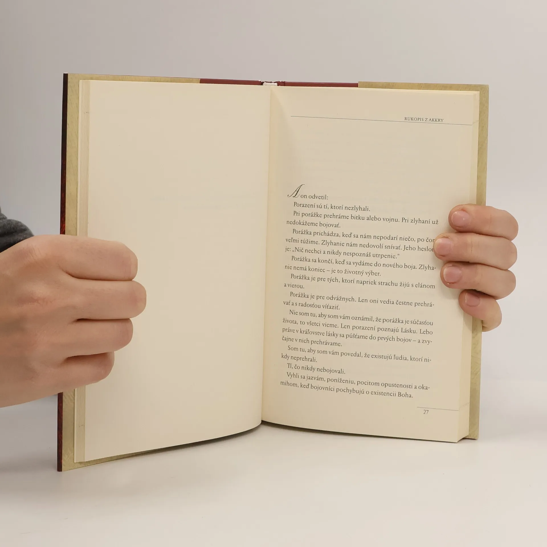 Ktoré hodnoty zostávajú, keď je všetko zničené? Je 14. júl 1099. Kým sa Jeruzalem pripravuje na vpád križiakov, Grék známy pod menom Kopta zvolá v meste stretnutie starých aj mladých, mužov aj žien. Kresťania, židia aj moslimovia, ktorí sa zídu na námestí, sú presvedčení, že si vypočujú prednášku, ako sa pripraviť na boj, Kopta im však chce povedať čosi iné. Všetko naznačuje, že stoja pred porážkou, no Grék ich nabáda, aby v každodennom živote nachádzali múdrosť, akou odpovedá na výzvy a ťažkosti. Verí, že skutočné poznanie je ukryté v prežitých láskach, utrpených stratách, vo chvíľach beznádeje i víťazstiev a v každodennom spolunažívaní s nevyhnutnosťou smrti. Rukopis z Akkry Paula Coelha nás pozýva zamyslieť sa nad našimi zásadami a ľudskosťou.