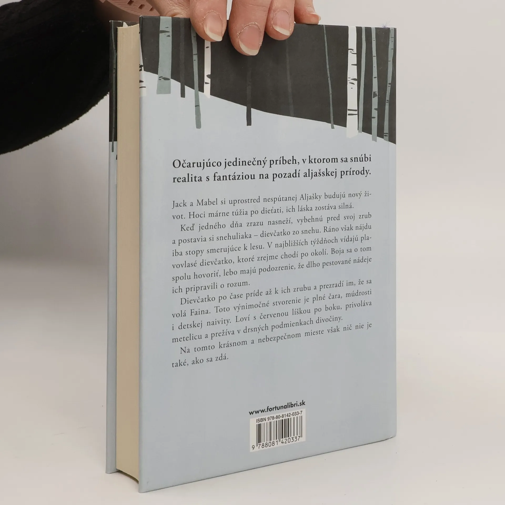 Očarujúco jedinečný príbeh, v ktorom sa snúbi realita s fantáziou na pozadí aljašskej prírody. Jack a Mabel si uprostred nespútanej Aljašky budujú nový život. Hoci márne túžia po dieťati, ich láska zostáva silná. Keď jedného dňa zrazu nasneží, vybehne pred svoj zrub a postavia si snehuliaka – dievčatko zo snehu. Ráno však nájdu iba stopy smerujúce k lesu. V najbližších týždňoch vídajú plavovlasé dievčatko, ktoré zrejme chodí po okolí. Boja sa o tom spolu hovoriť, lebo majú podozrenie, že dlho pestované nádeje ich pripravili o rozum. Dievčatko po čase príde až k ich zrubu a prezradí im, že sa volá Faina. Toto výnimočné stvorenie je plné čara, múdrosti i detskej naivity. Loví s červenou líškou po boku, privoláva metelicu a prežíva v drsných podmienkach divočiny. Na tomto krásnom a nebezpečnom mieste však nič nie je také, ako sa zdá.
