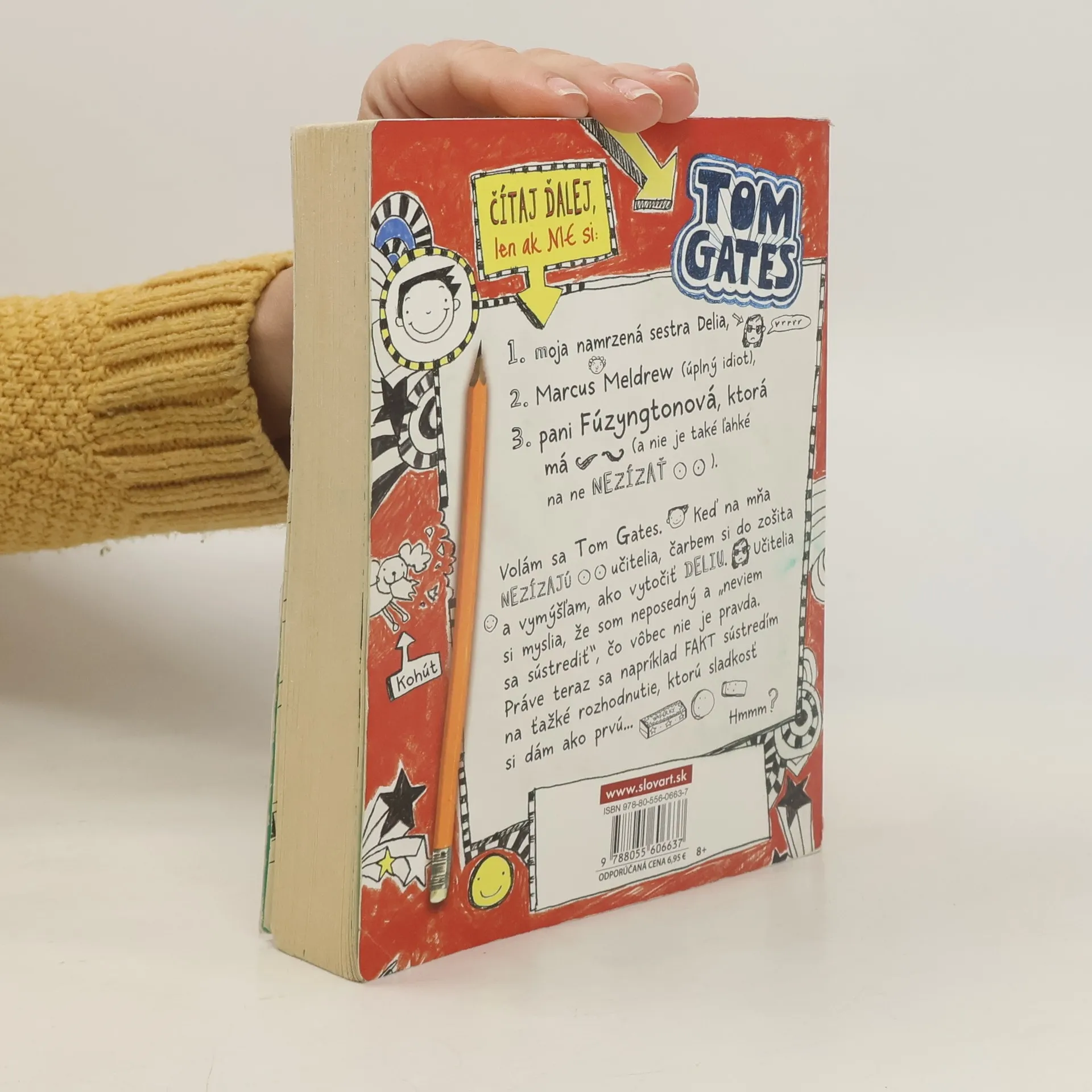 Neskúšajte čítať túto knihu na verejnosti. Budete sa totiž nahlas rehotať! Tom Gates je majstrom výhovoriek, expert na čarbanice a výnimočný tvorca komiksových príbehov. Je tiež nočnou morou pre svojho nevrlého triedneho učiteľa pána Fullermana. V jeho uletenom denníku plnom čarbaníc a nezmyslov nájdete všetky druhy komiksových čarbačiek. Podarí sa niekedy Tomovi spraviť načas domácu úlohu, vyhnúť sa hnevu svojho učiteľa – a urobiť dojem na Amy Porterovú, ktorá sedí vedľa neho?