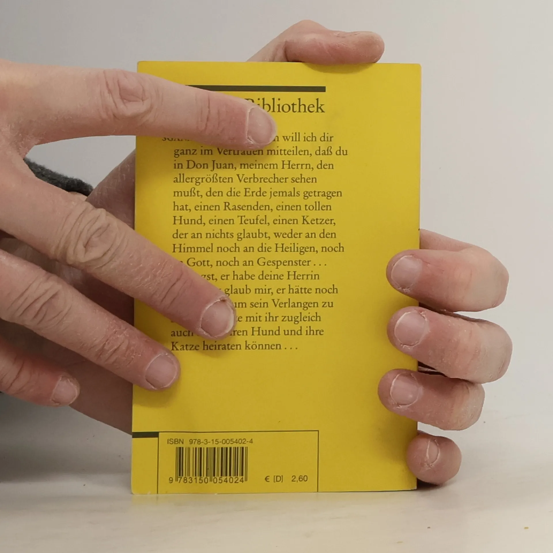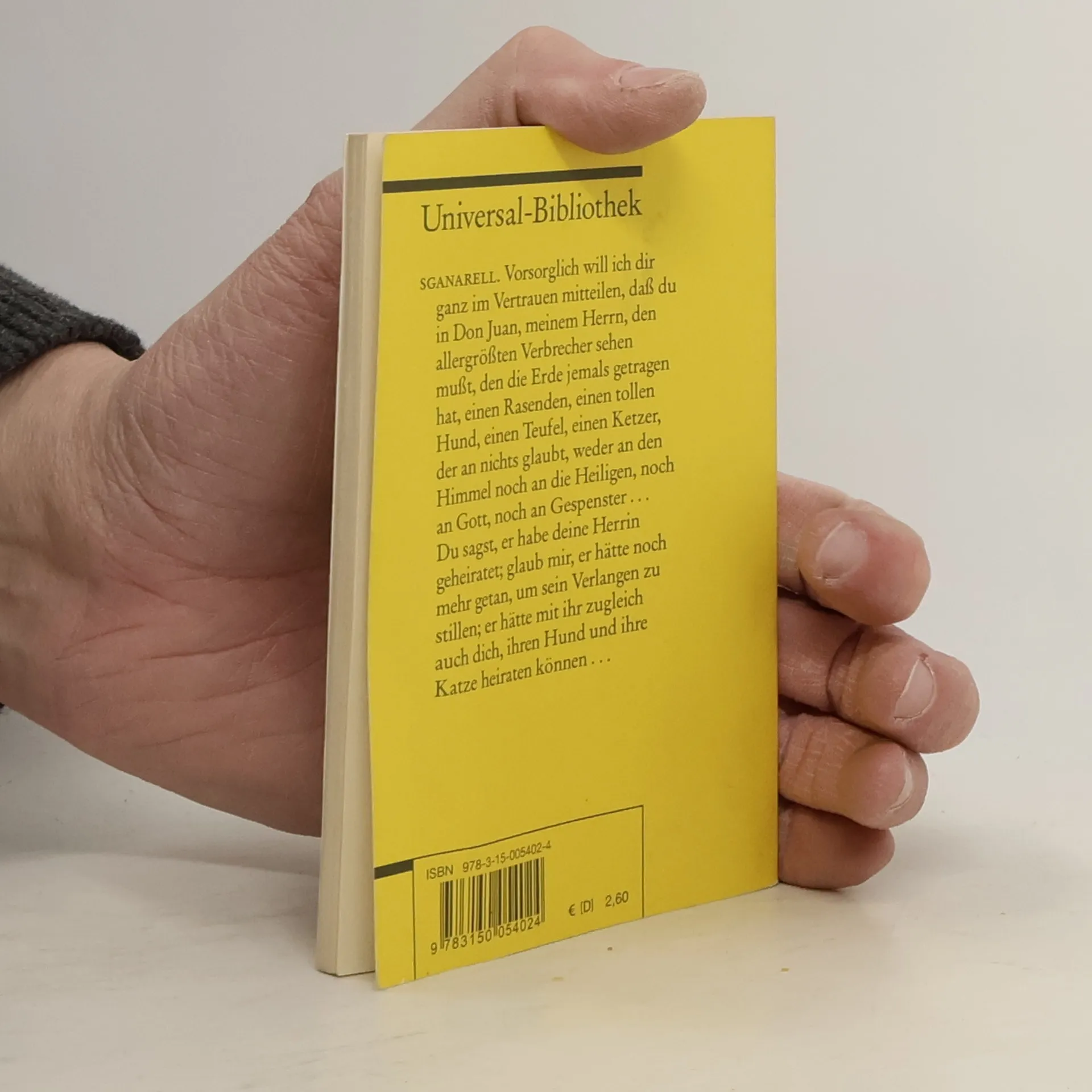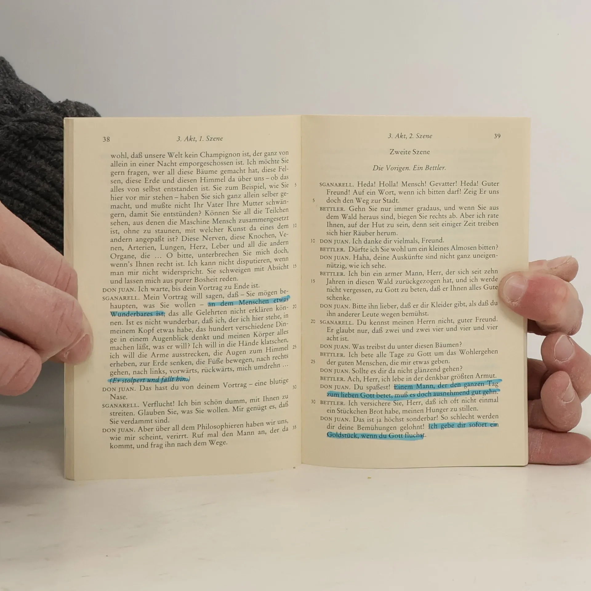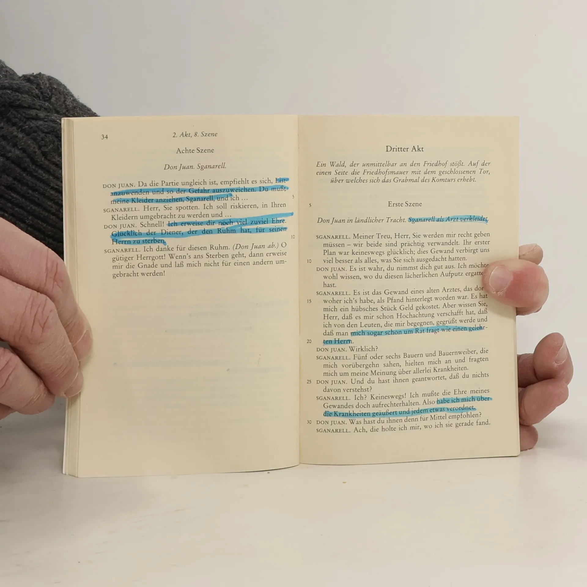 "SGANARELL. Vorsorglich will ich dir ganz im Vertrauen mitteilen, dass du in Don Juan, meinem Herrn, den allergrößten Verbrecher sehen musst, den die Erde jemals getragen hat, einen Rasenden, einen tollen Hund, einen Teufel, einen Ketzer, der an nichts glaubt, weder an den Himmel noch an die Heiligen, noch an Gott, noch an Gespenster. Du sagst, er habe deine Herrin geheiratet; glaub mir, er hätte noch mehr getan, um sein Verlangen zu Stillen; er hätte mit ihr zugleich auch dich, ihren Hund und ihre Katze heiraten können."
