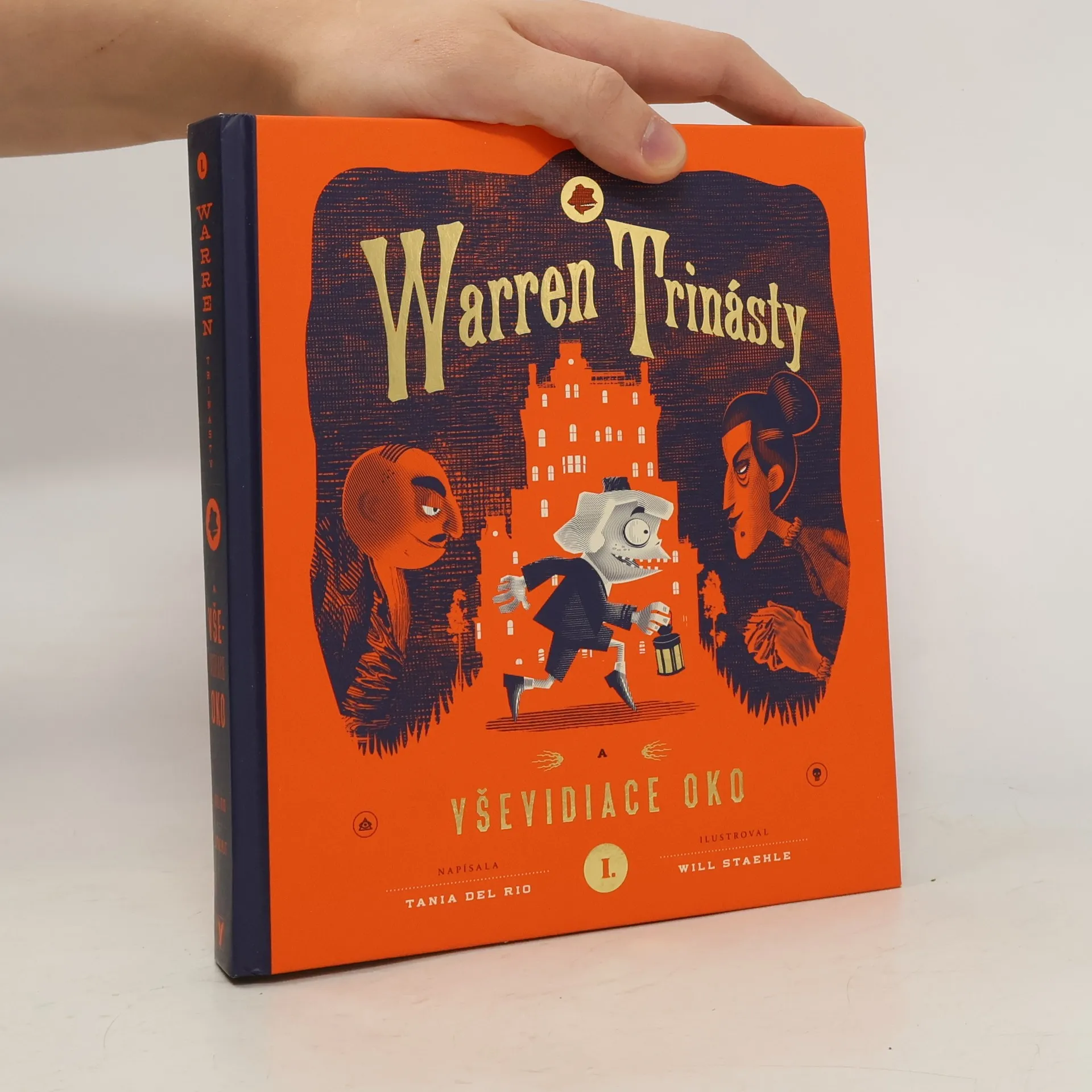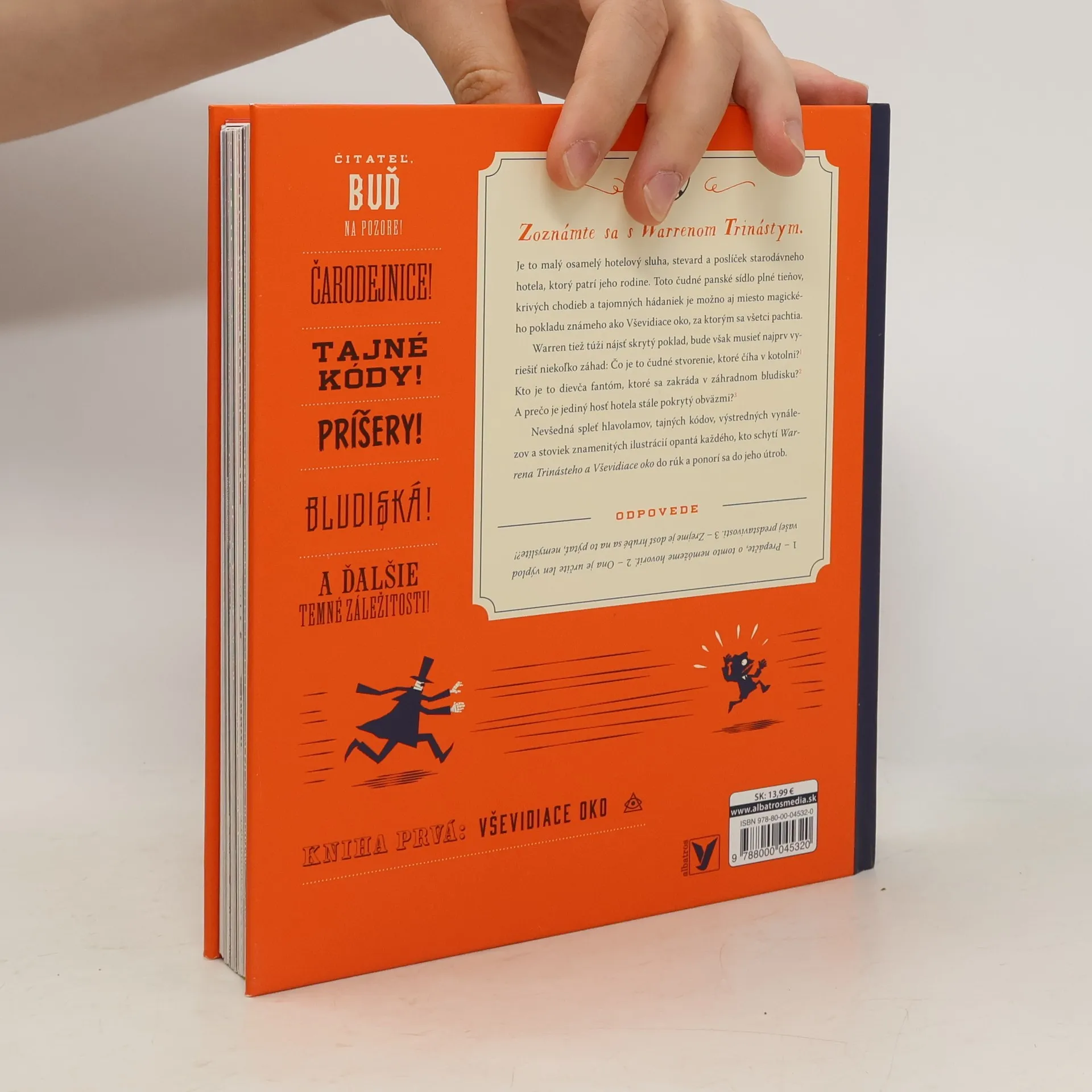 Zoznámte sa s Warrenom Trinástym. Je to malý osamelý hotelový sluha, stevard a poslíček starodávneho hotela, ktorý patrí jeho rodine. Toto čudné panské sídlo plné tieňov, krivých chodieb a tajomných hádaniek je možno aj miesto magického pokladu známeho ako Vševidiace oko, za ktorým sa všetci pachtia. Warren tiež túži nájsť skrytý poklad, bude však musieť najprv vyriešiť niekoľko tajomstiev: Čo je to čudné stvorenie, ktoré číha v kotolni? Kto je to dievča fantóm, ktoré sa zakráda v záhradnom bludisku? A prečo je jediný hosť hotela stále pokrytý obväzmi? Nevšedná spleť hlavolamov, tajných kódov, výstredných vynálezov a stoviek znamenitých ilustrácií opantá každého, kto schytí Warrena Trinásteho a Vševidiace oko do rúk a ponorí sa do ich útrob.