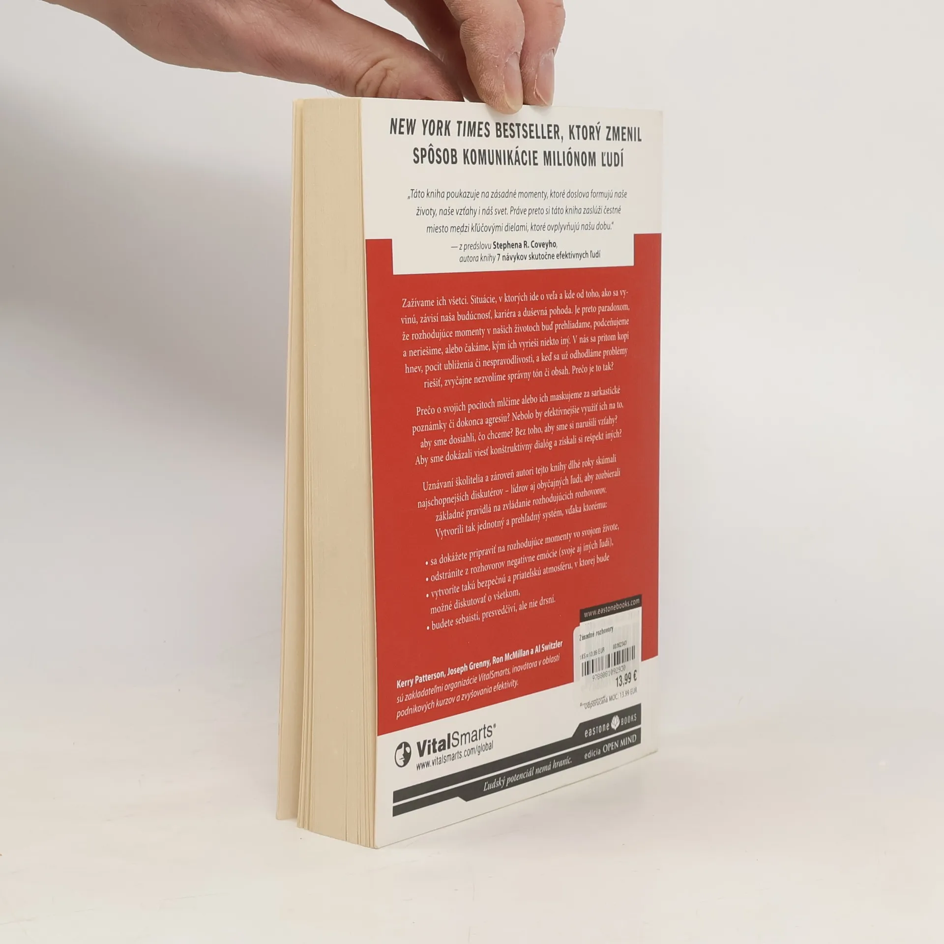 Zažívame ich všetci. Situácie, v ktorých ide o veľa a kde od toho, ako sa vyvinú, závisí naša budúcnosť, kariéra a duševná pohoda. Je preto paradoxom, že rozhodujúce momenty v našich životoch buď prehliadame, podceňujeme a neriešime, alebo čakáme, kým ich vyrieši niekto iný. Prečo je to tak? Uznávaní školitelia a autori tejto knihy dlhé roky skúmali najschopnejších diskutérov – lídrov aj obyčajných ľudí, aby zozbierali základné pravidlá pre zvládanie rozhodujúcich rozhovorov. Vytvorili tak jednotný a prehľadný systém, vďaka ktorému: - sa dokážete pripraviť na rozhodujúce momenty vo svojom živote, - odstránite z rozhovorov negatívne emócie (svoje aj iných ľudí), - vytvoríte takú bezpečnú a priateľskú atmosféru, v ktorej bude možné diskutovať o všetkom, - budete sebaistí, presvedčiví, ale nie drsní.