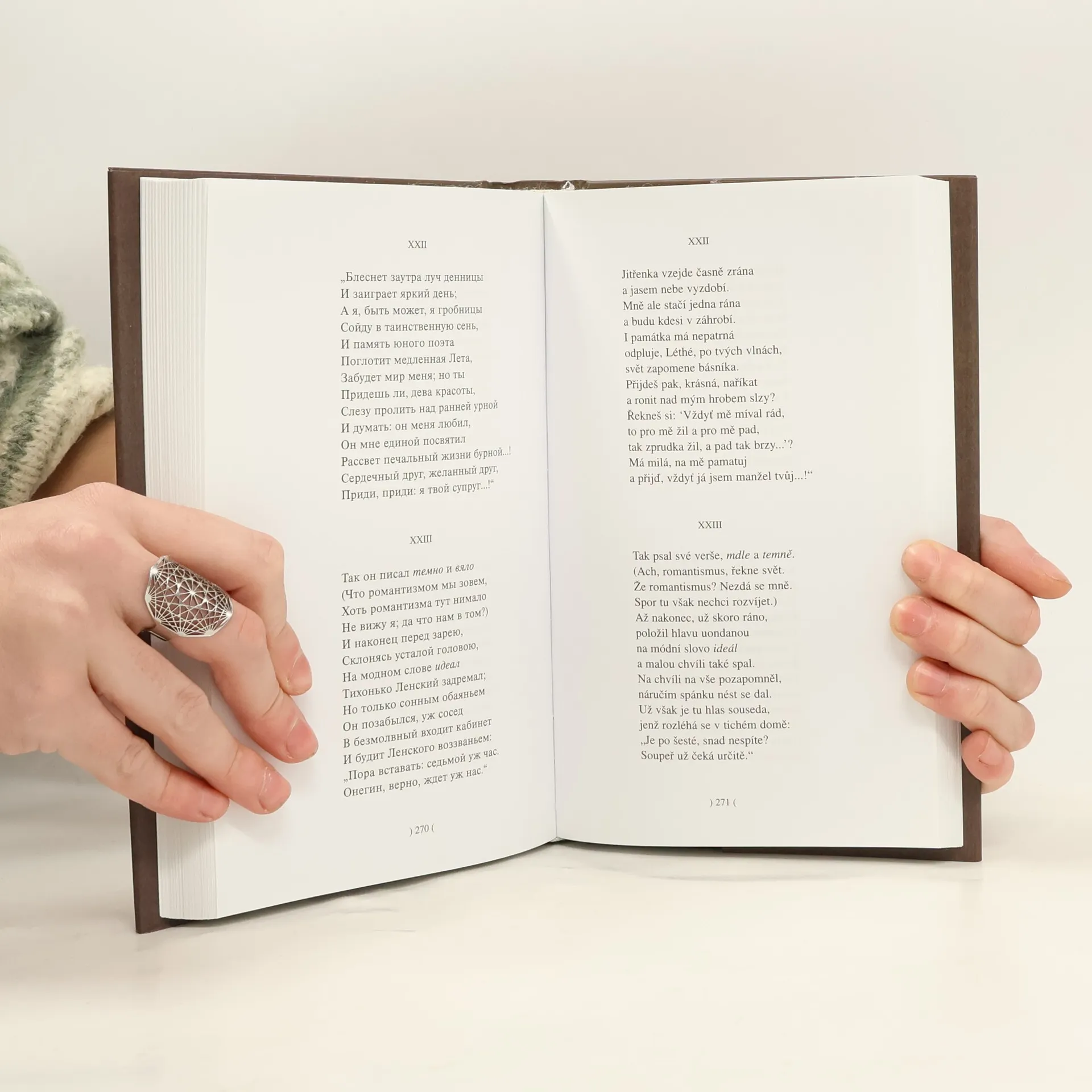 První veršovaný realistický román (psaný v letech 1823–30) – básnický obraz života statkářské Rusi 20. let 19. století. Základní dějový rozvrh se opírá o dva dopisy. Taťánin v třetí hlavě a Oněginův v poslední, osmé. V prvním se Taťána vyznává Oněginovi ze své dětinné lásky k němu, lásky mladého děvčete, které oslnil v jeho venkovském zátiší skvělý zjev velkoměstského světáka, a je odmítnuta. V druhém se zpovídá stárnoucí Oněgin po letech dobrodružství a cest ze své rozhořelé lásky k Taťáně, kterou spatřil v petěrburské společnosti jako ženu jiného – a je odmítnut. Mezi dopisy je Oněginův souboj a smrt jeho přítele, hrdinovy cesty, líčení přírody a života, aforismy a intimní lyričnost, pronikající jako lehká mlha celým epickým dílem. Je to „román, který vedle své neuvadající estetické krásy má pro nás cenu historického dokumentu, rýsujícího dobu přesněji a pravdivěji, než to do dnešního dne dělají desítky tlustých knih“ (Gorkij) – Podle úvodu. 7. vydání