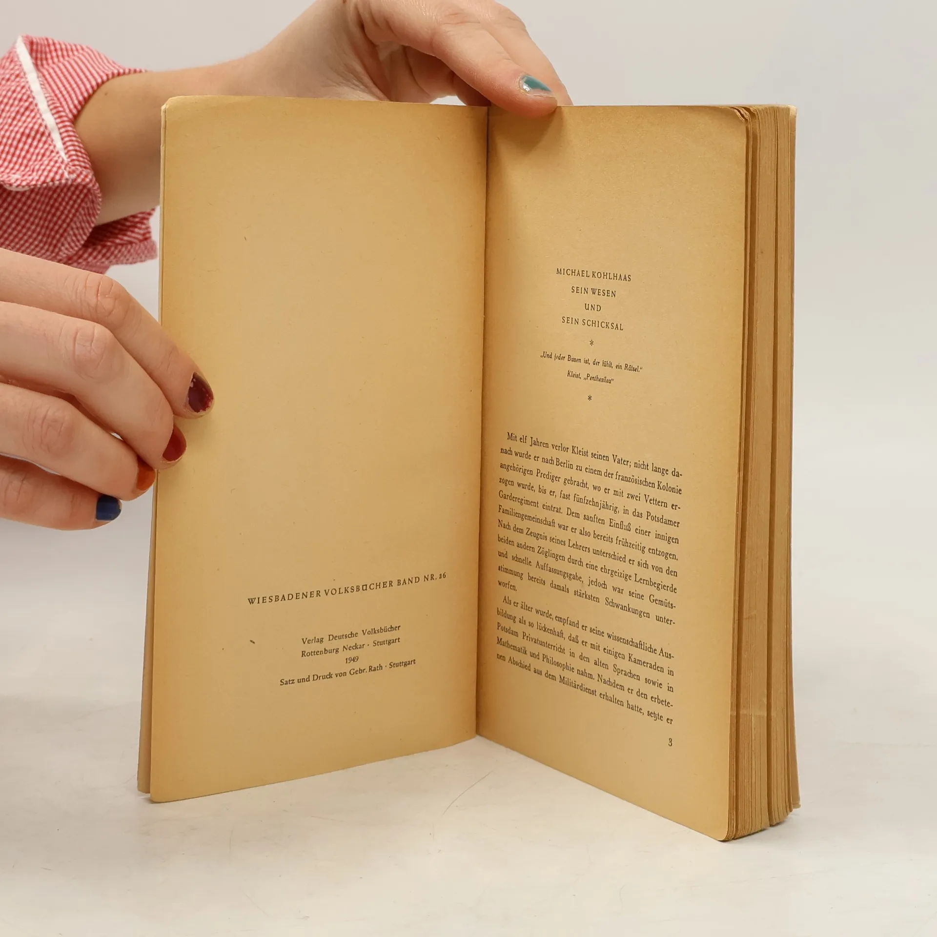 Der Rosshändler Michael Kohlhaas sucht sein Recht und wird darüber zum Räuber. Er muss erkennen, dass es das absolute Recht nicht geben kann, sondern dass die Rechtsprechung an die Gesellschaft gebunden ist. Schliesslich ereilt ihn selbst das Gericht, dem er sich beugt: Er stirbt auf dem Schaffot. Diese Novelle beruht, wie der Untertitel angibt, auf einer alten Chronik, aus der der Anhang Auszüge bringt. Über Leben und Werk des Dichters gibt das Nachwort Auskunft. Die Anmerkungen enthalten Erklärungen für den Schüler.
