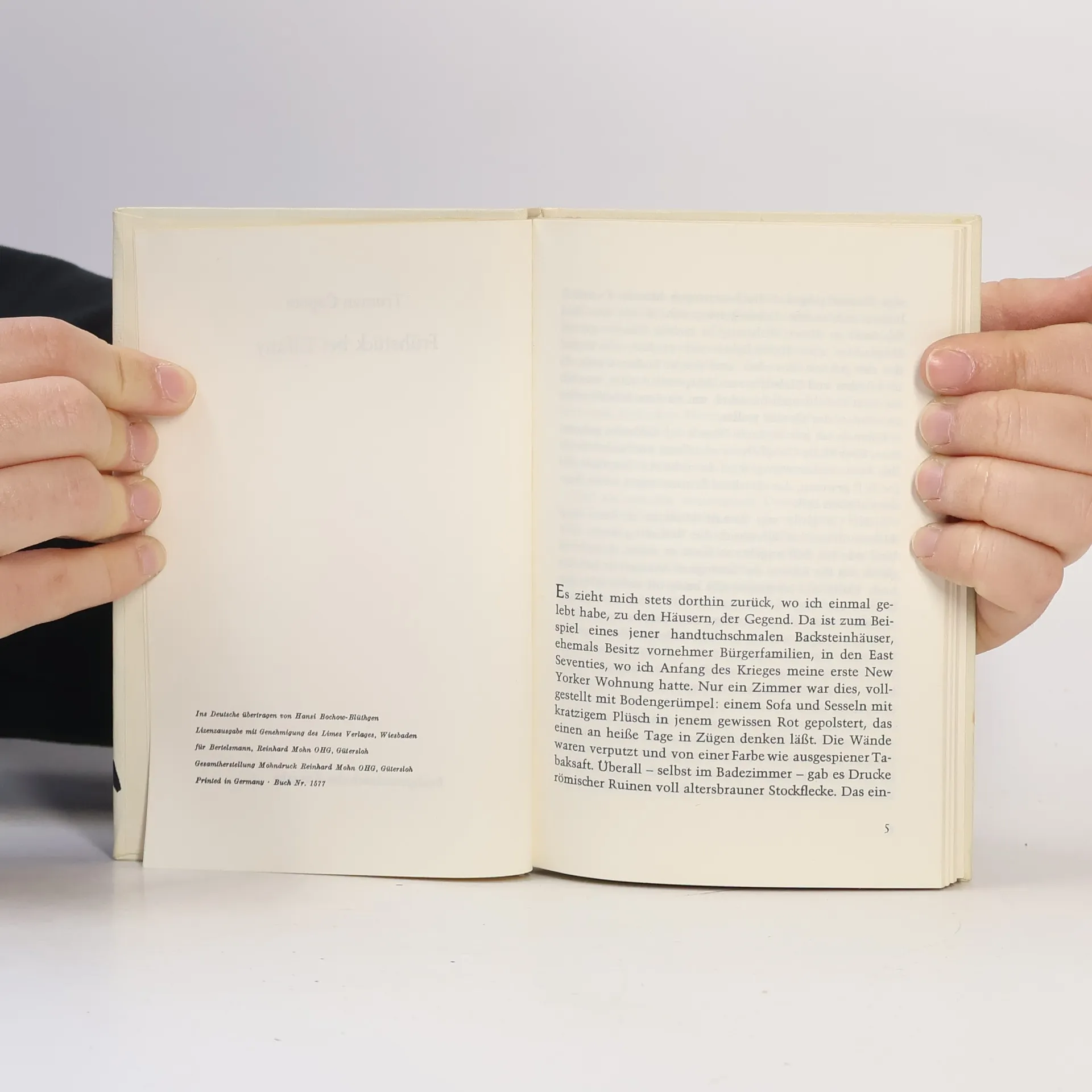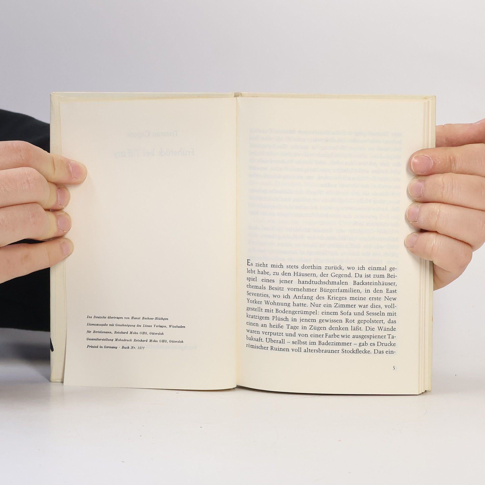 „Bei all ihrer schicken Magerkeit strahlte sie eine Haferflocken-Gesundheit aus, eine Seifen- und Zitronen-Reinlichkeit, und auf ihren Wangen lag eine raue Röte. Sie hatte einen großen Mund und eine Stupsnase. Eine Sonnenbrille verbarg ihre Augen. Es war ein Gesicht, das nicht mehr ganz in der Kindheit zuhause war und schon einer Frau gehörte.“ So beschreibt Truman Capote seine unsterbliche Heldin Holly Golightly. Die fast Neunzehnjährige, die voller Lebenshunger vom Land in die große Stadt ausgerissen ist, hat nichts außer ihrer Erscheinung und Ausstrahlung, die sie befähigt, mit Männern zu spielen und sich gewissermaßen aushalten zu lassen. Manchmal, im Partytrubel von New York, glänzt sie unschuldig, doch dann überkommt sie das „rote Elend“, das Gefühl von innerer Leere und Einsamkeit. In solchen Momenten flieht sie zur Fifth Avenue zu Tiffany, wo der Schimmer der Diamanten ihr Sicherheit gibt. Ihr Nachbar, ein junger Schriftsteller, beobachtet ihr aufregendes Leben und liebt ihre Schlagfertigkeit sowie ihre originelle Sprache. Gelegentlich spielt sie Lieder, die an Südstaaten-Nadelwälder oder die Prärie erinnern. Eines Tages ist sie plötzlich verschwunden, und zurück bleibt nur ihr namenloser Kater, auf dessen Suche sich der Erzähler begibt.